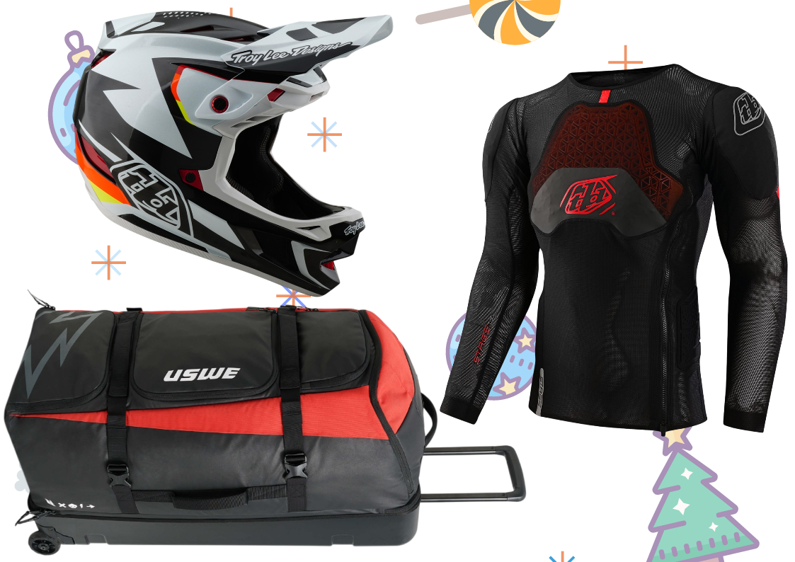 Для состоятельных господ в ассортименте есть и карбоновый шлем Troy Lee Designs D4, защита тела Stage и чемодан USWE Buddy 150, чтобы сложить туда всё вышеречисленное, да уехать в Крым на зимовку.