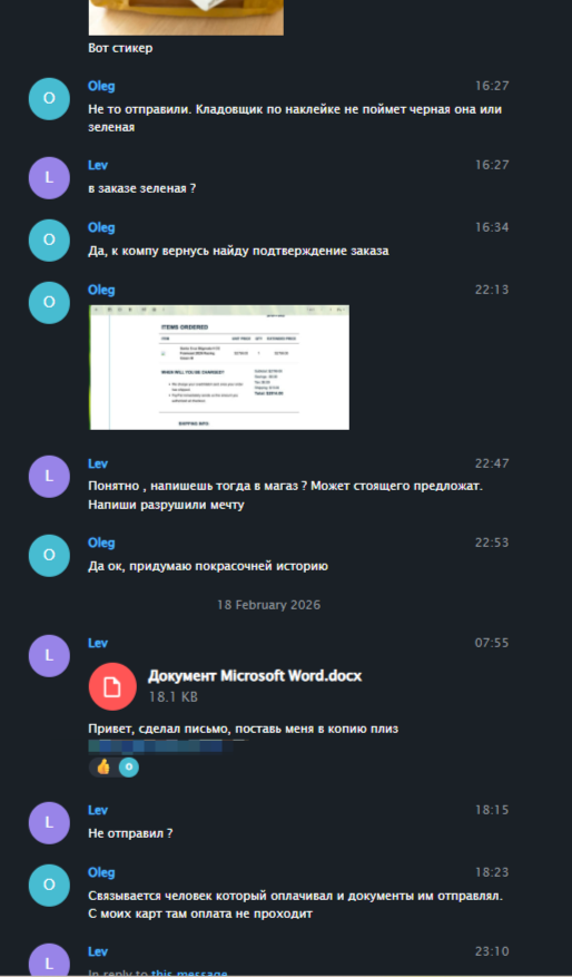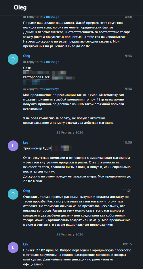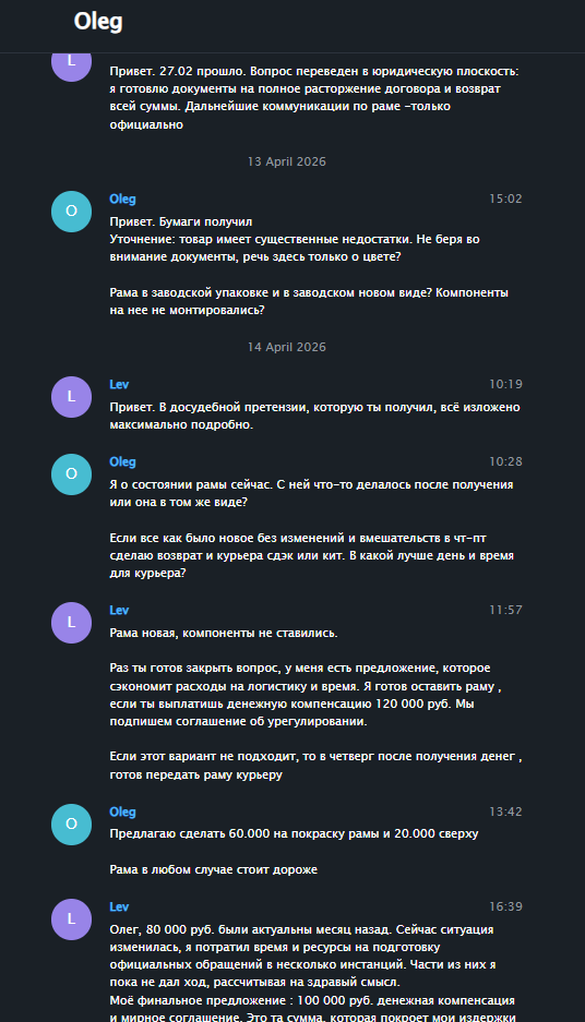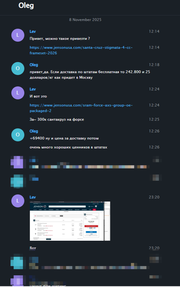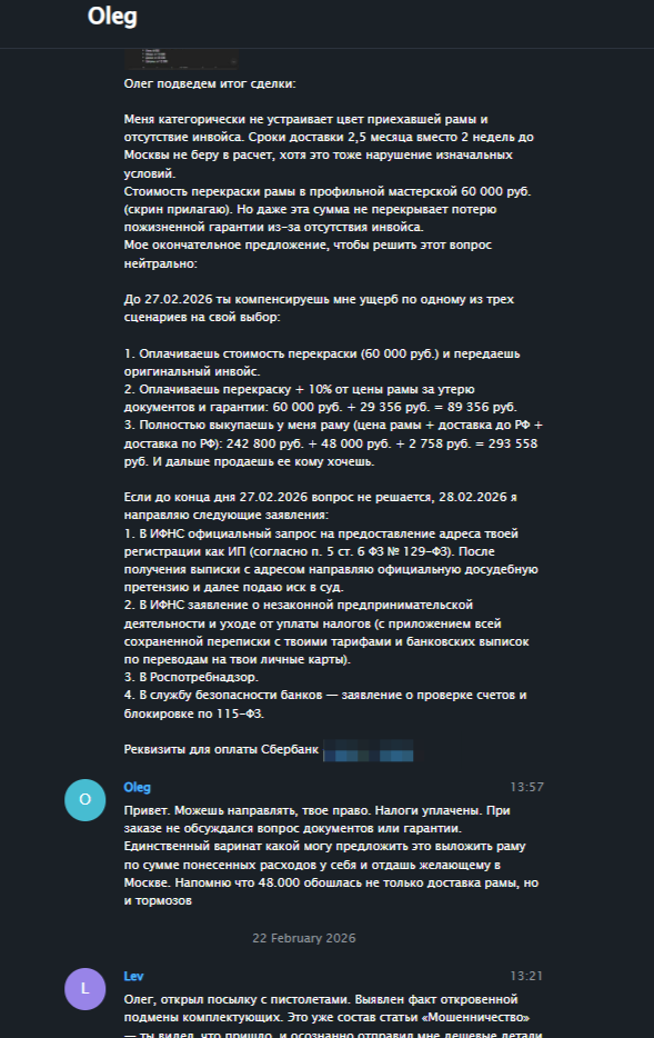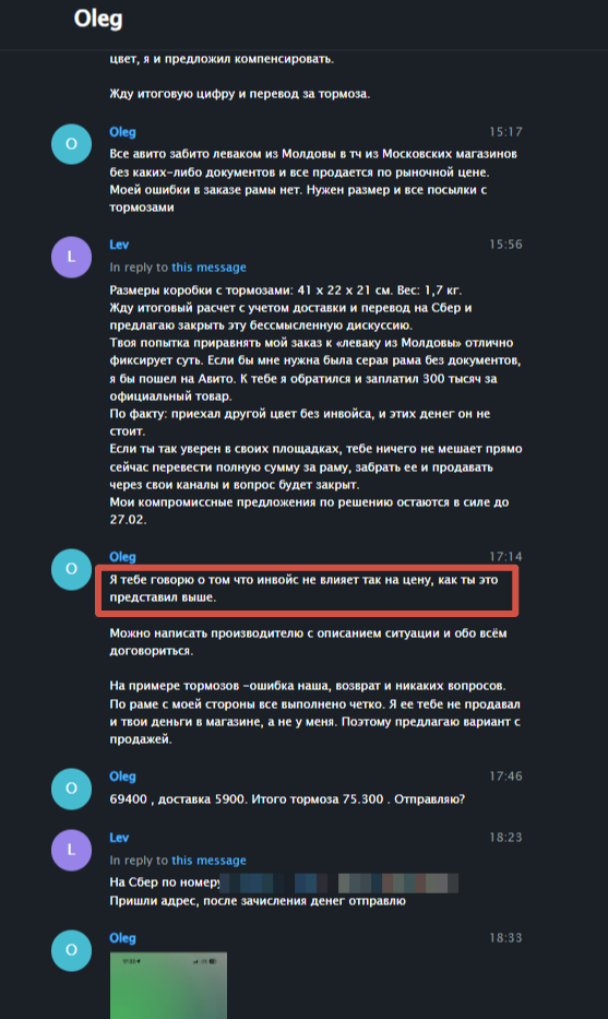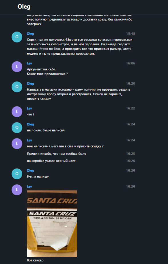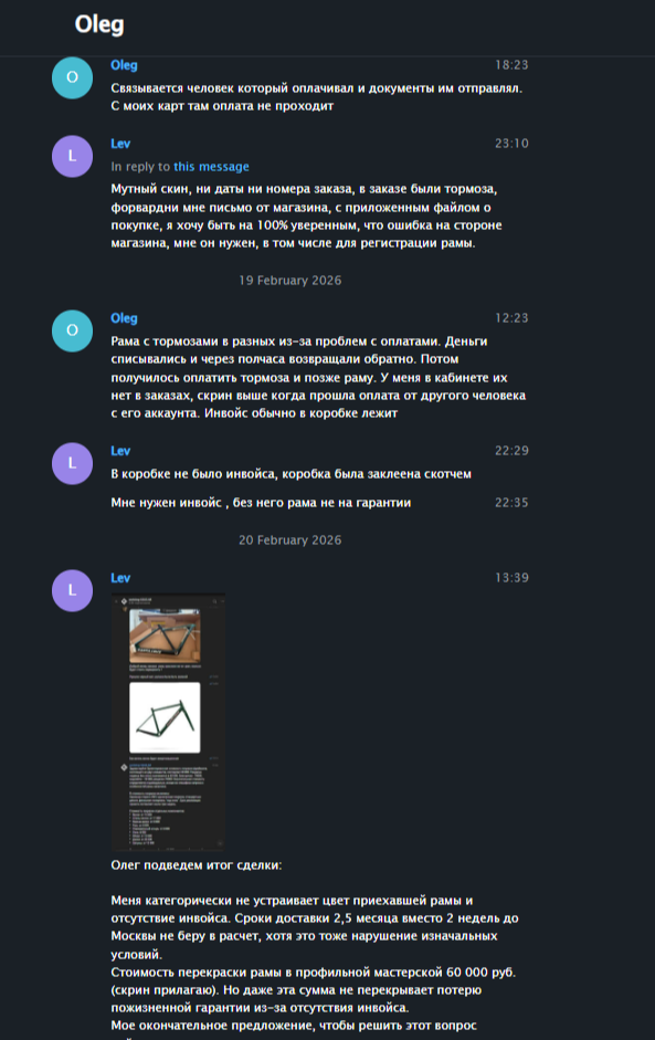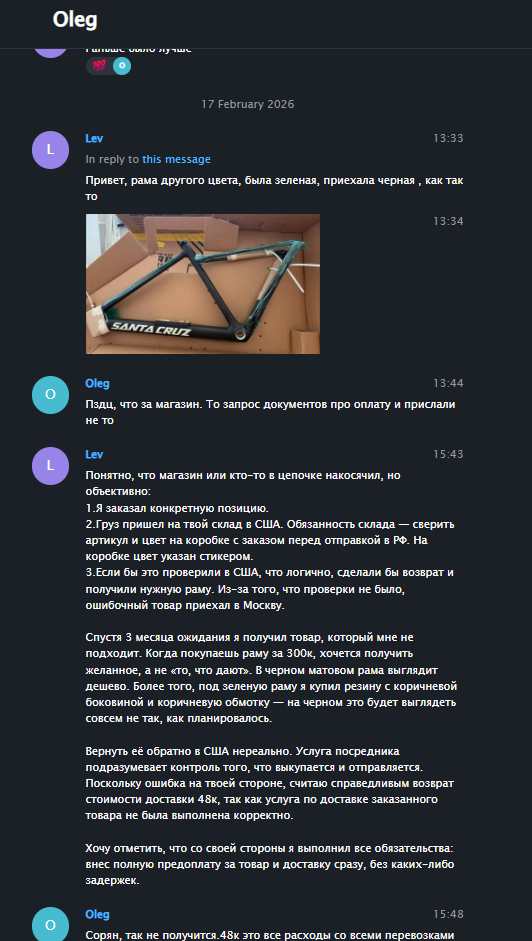 Всем привет. Я не любитель писать лонгриды или вступать в полемику в комментариях, но считаю, что эта история будет полезна многим. В текущих реалиях без посредников жить сложно, и мой кейс — очередное подтверждение простой истины: пока всё идет «в массе» относительно ровно, посредники кажутся нормальными парнями. Но стоит возникнуть минимальной проблеме — и вся ответственность моментально перекладывается на плечи покупателя. Я, разумеется, знал репутацию Олега в вопросах «велосипедов из Европы», но до этого момента наше взаимодействие ограничивалось исключительно заказами с европейских площадок, где всё было прозрачно. В этот раз ситуация пошла по иному сценарию.