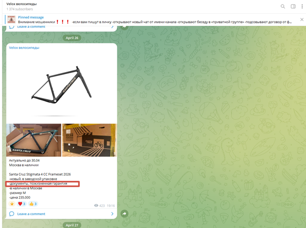 P.S. 26 апреля, через 10 дней после возврата, в канале Veloxвелосипеды появилось объявление: SantaCruzStigmata4 CCFrameset2026, размер M, Москва, 235 000 руб. — «документы, пожизненная гарантия».