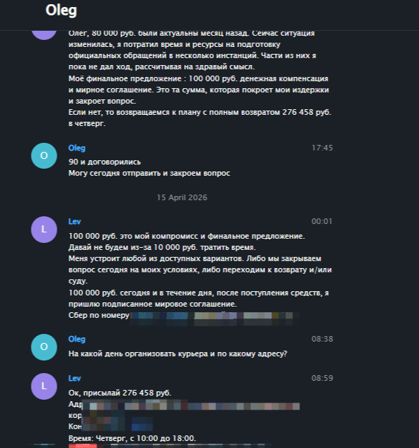 Олег предложил 80 000. Потом 90 000. Торговался за раму, которую сам же неправильно привез — ирония. На 100 000 я зафиксировал финальное предложение. Олег не согласился. Итог — полный возврат. 276 458 рублей обратно на карту, рама уехала курьером. Круг замкнулся: пять месяцев переписки, досудебная претензия, обращение в Роспотребнадзор — и деньги вернулись на базу.