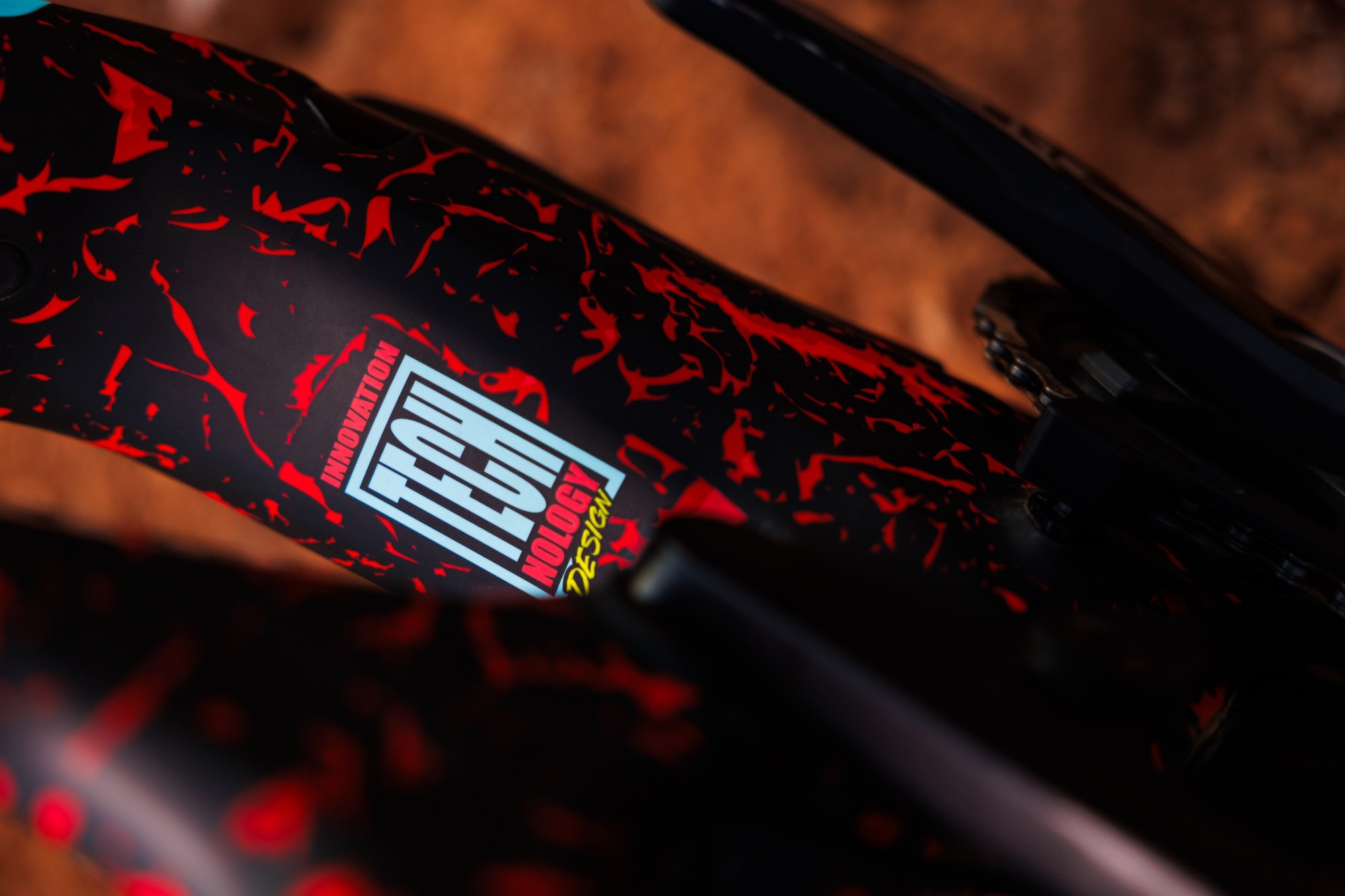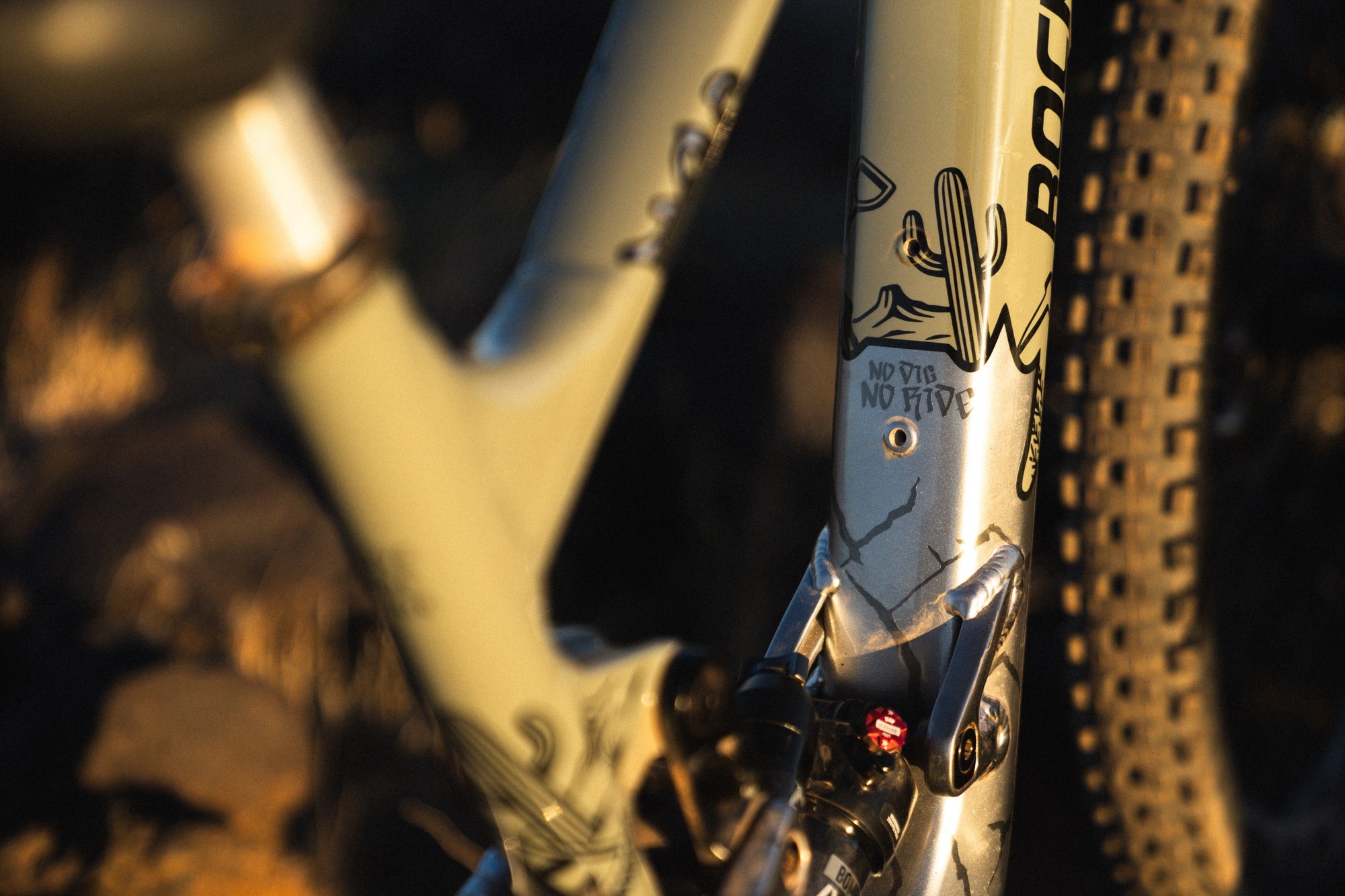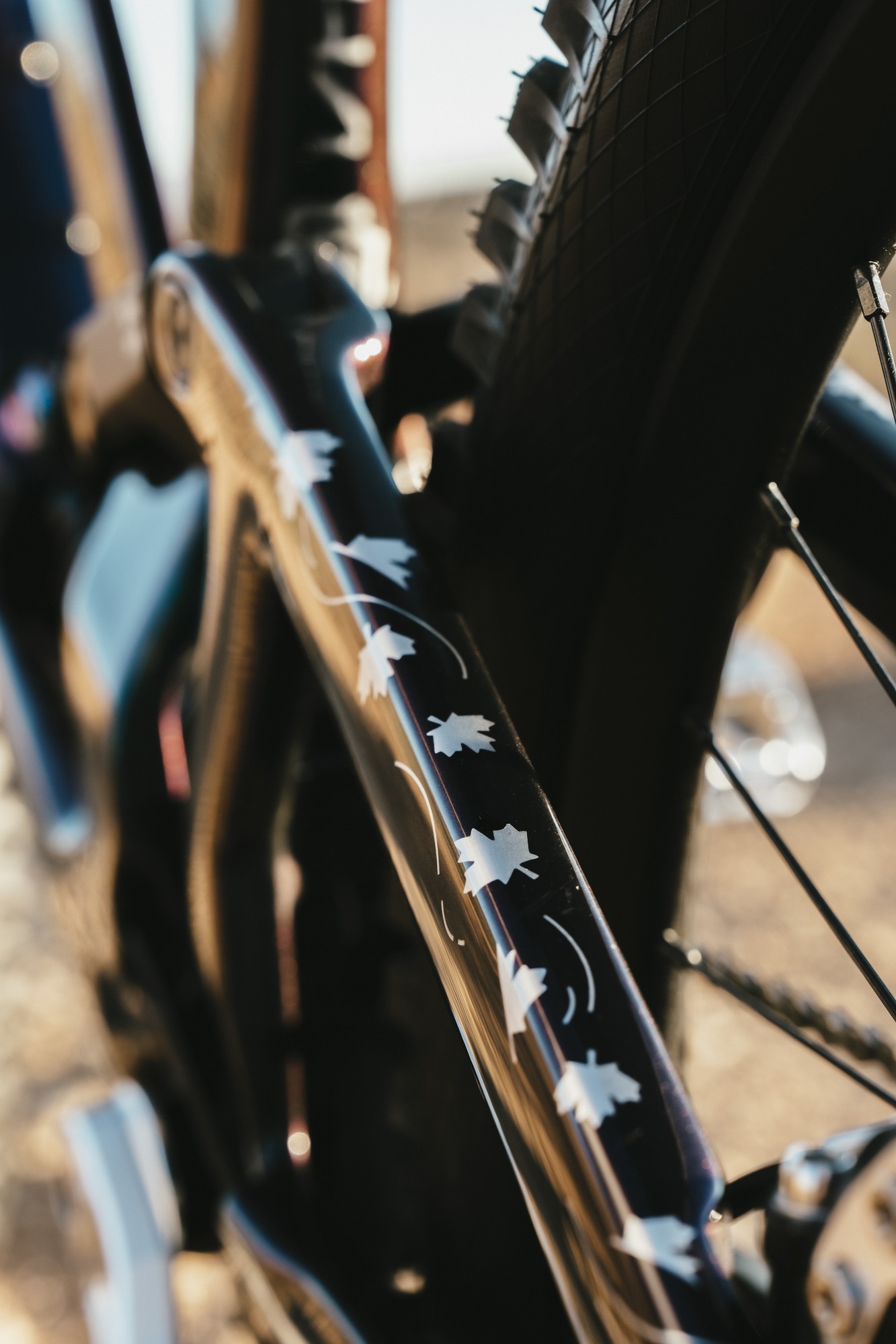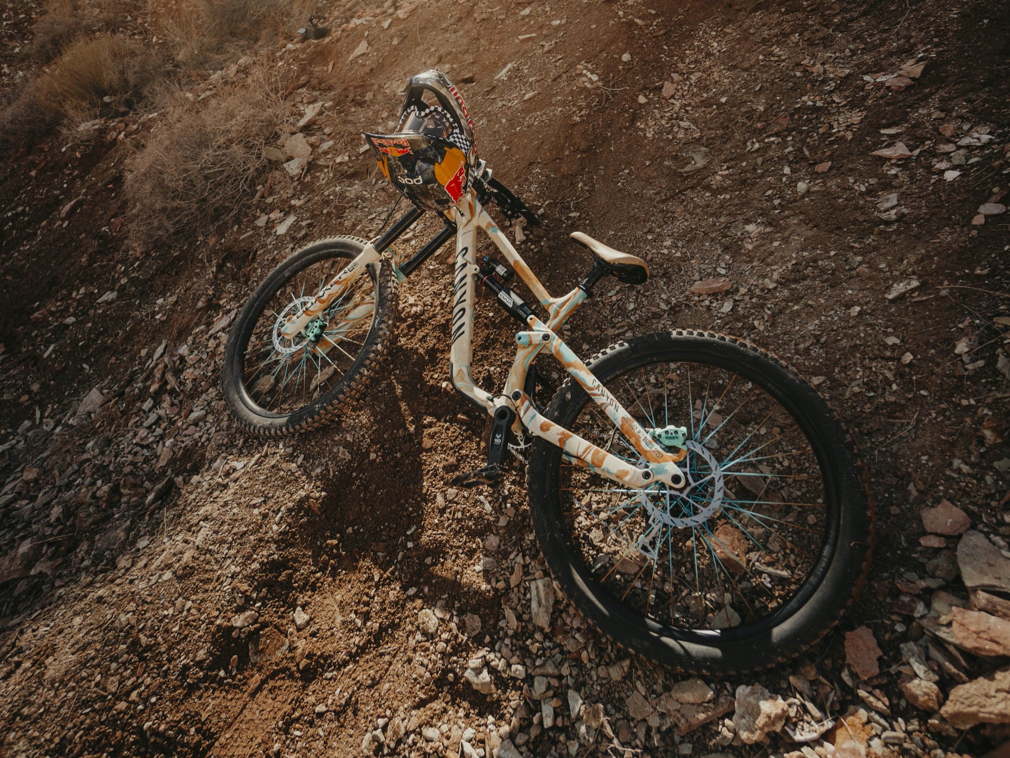 Хайден выбрал эндуро-байк с двухкоронкой, а на раме кастомная расцветка. Шалфейно-зелёный и хромированный цвет особенно важны для Хайдена. Дизайн явно вдохновлён пустыней и копанием: кирка, грабли, трещины в земле, кактусы и крылатая «no dig no ride» (не копаешь — не катаешь), которую знает каждый участник.