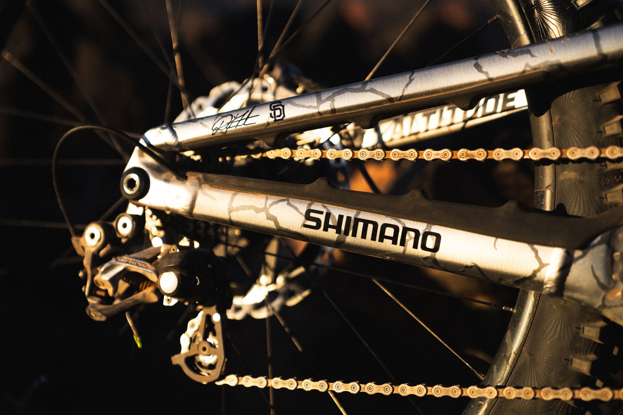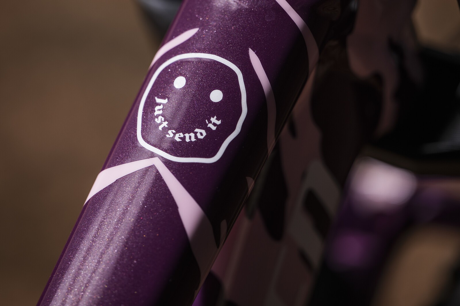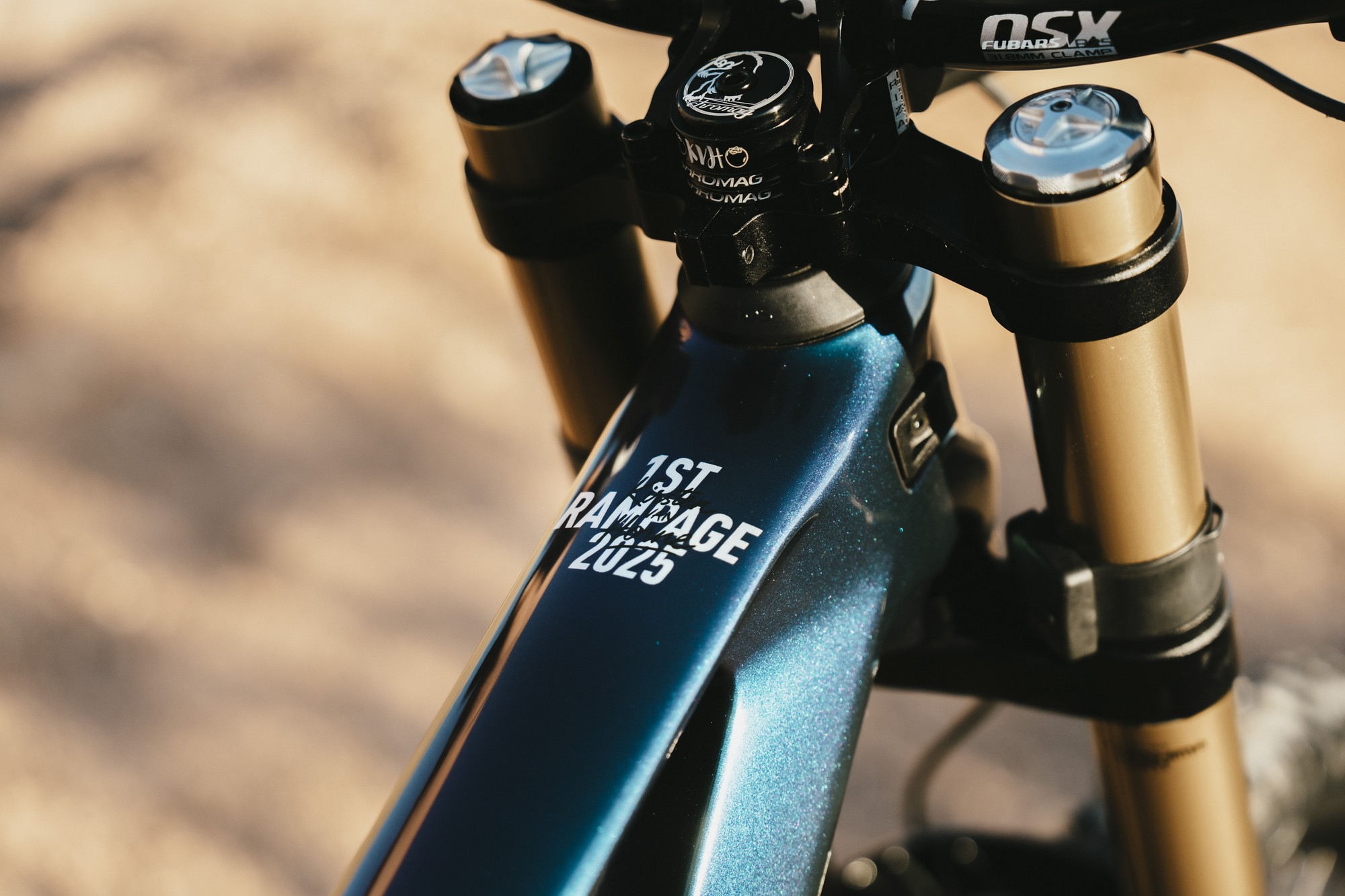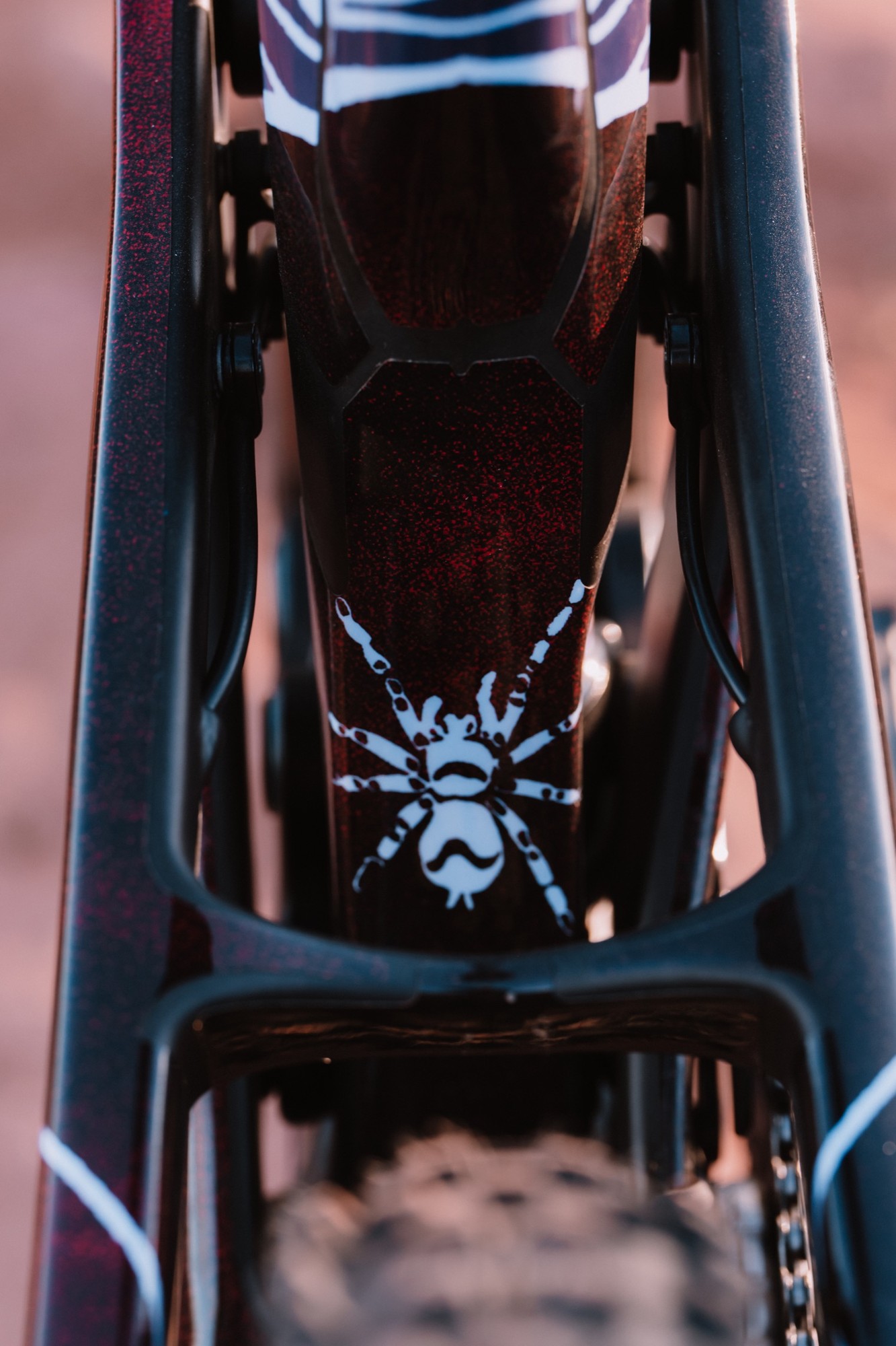 Хайден выбрал эндуро-байк с двухкоронкой, а на раме кастомная расцветка. Шалфейно-зелёный и хромированный цвет особенно важны для Хайдена. Дизайн явно вдохновлён пустыней и копанием: кирка, грабли, трещины в земле, кактусы и крылатая «no dig no ride» (не копаешь — не катаешь), которую знает каждый участник.