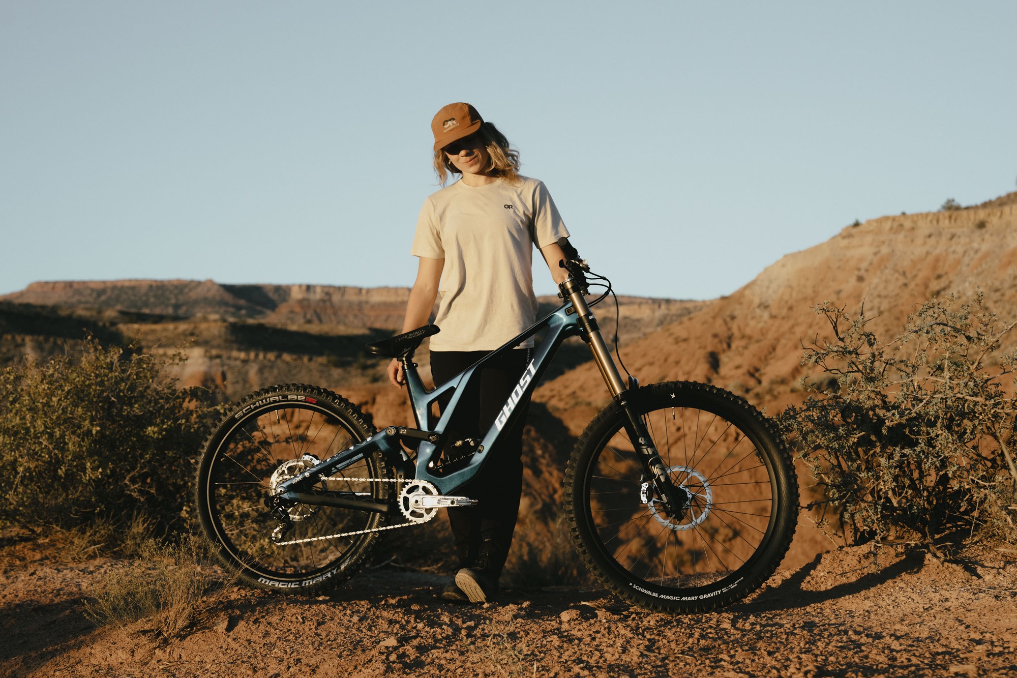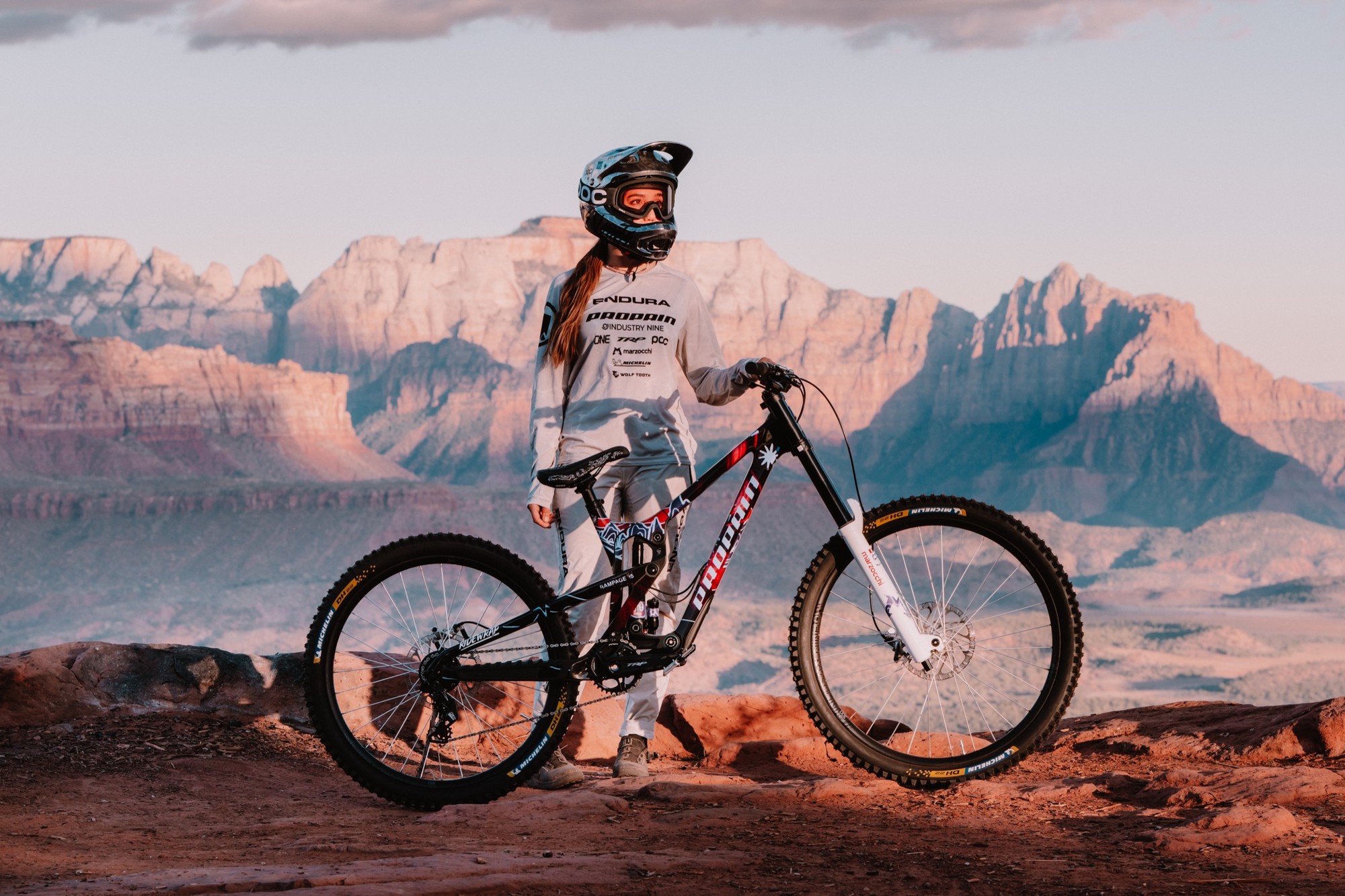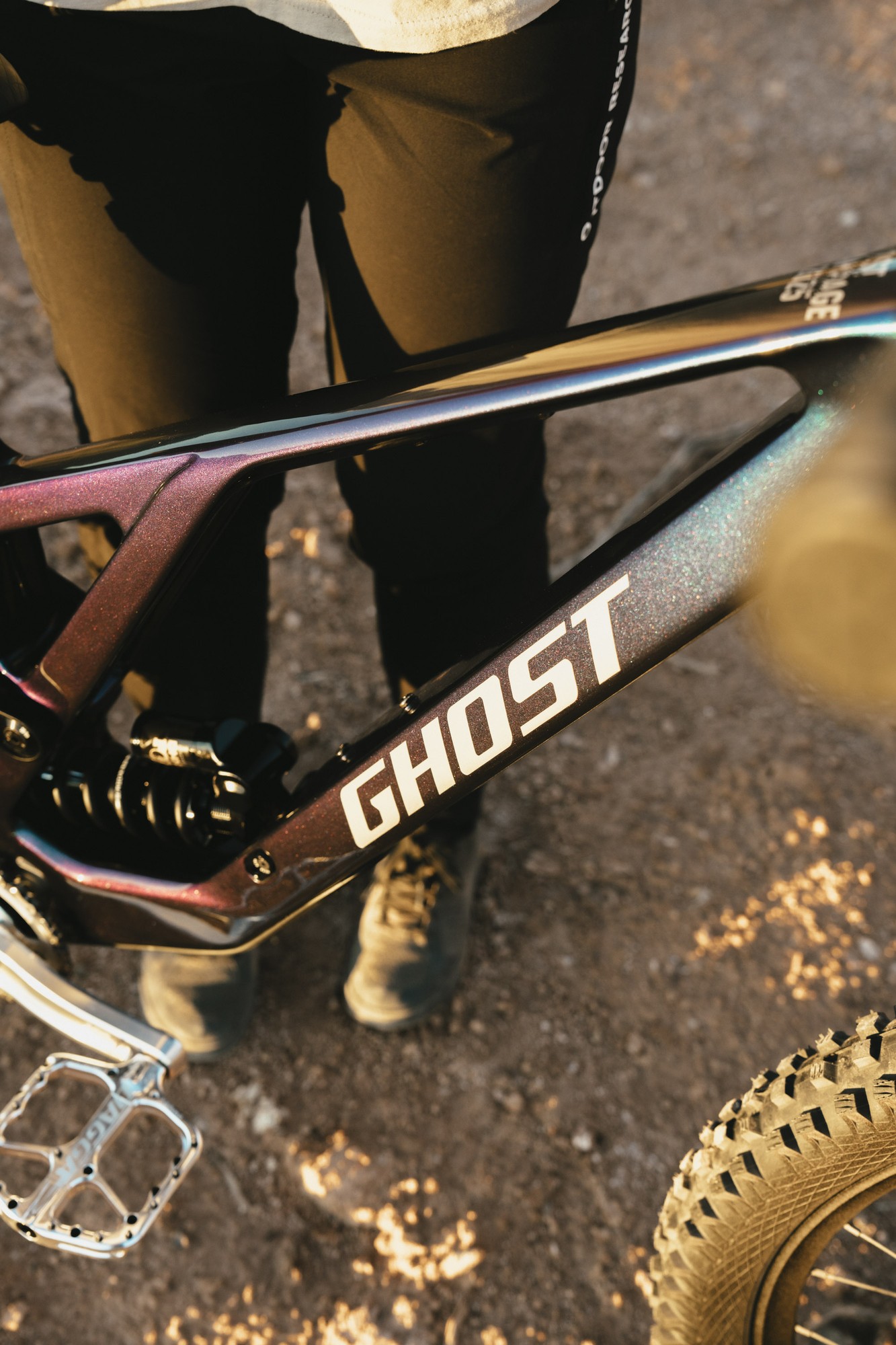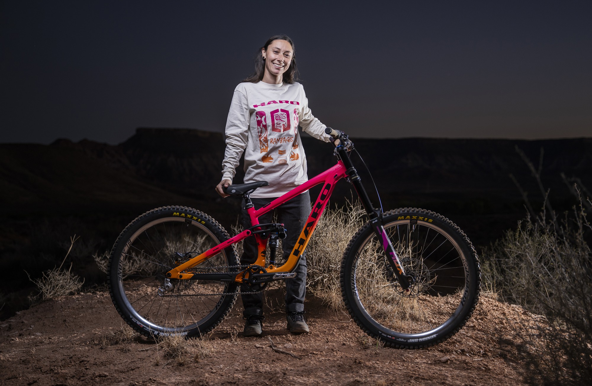 Ваея выбрала свежий Gambler с ходом подвески в 210мм. Оснастка от Deity, трансмиссия Shimano Saint, подвеска от Fox с воздушным амортом Float X2, который скрыт внутри рамы. Ну и «лавовая» расцветка — чертовски хороша.