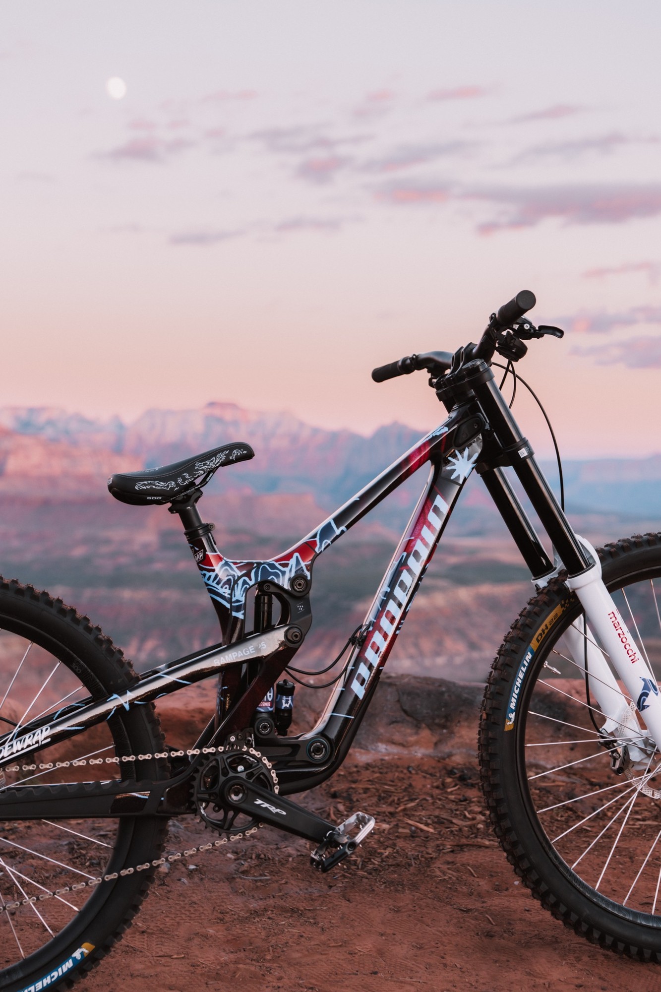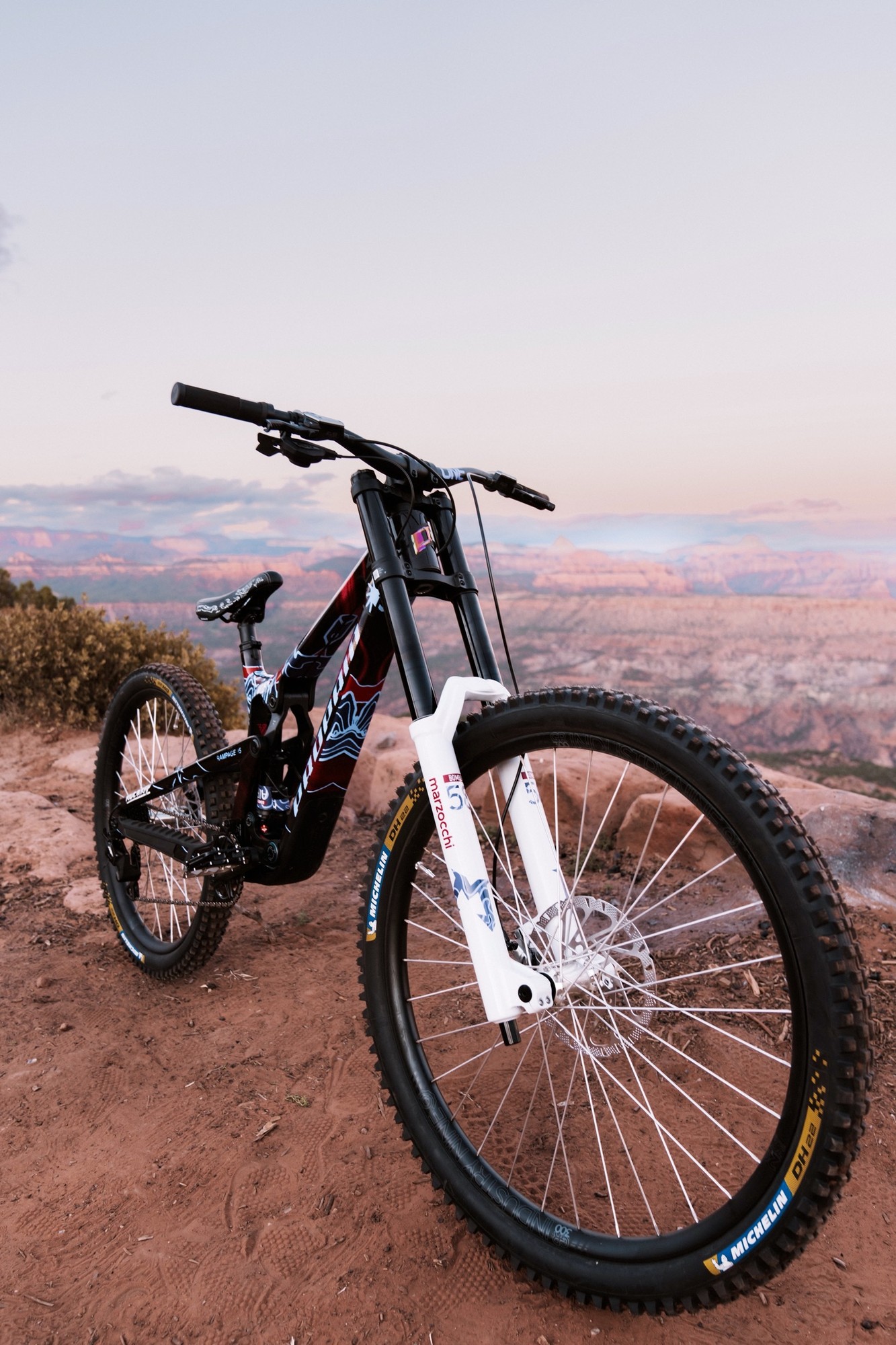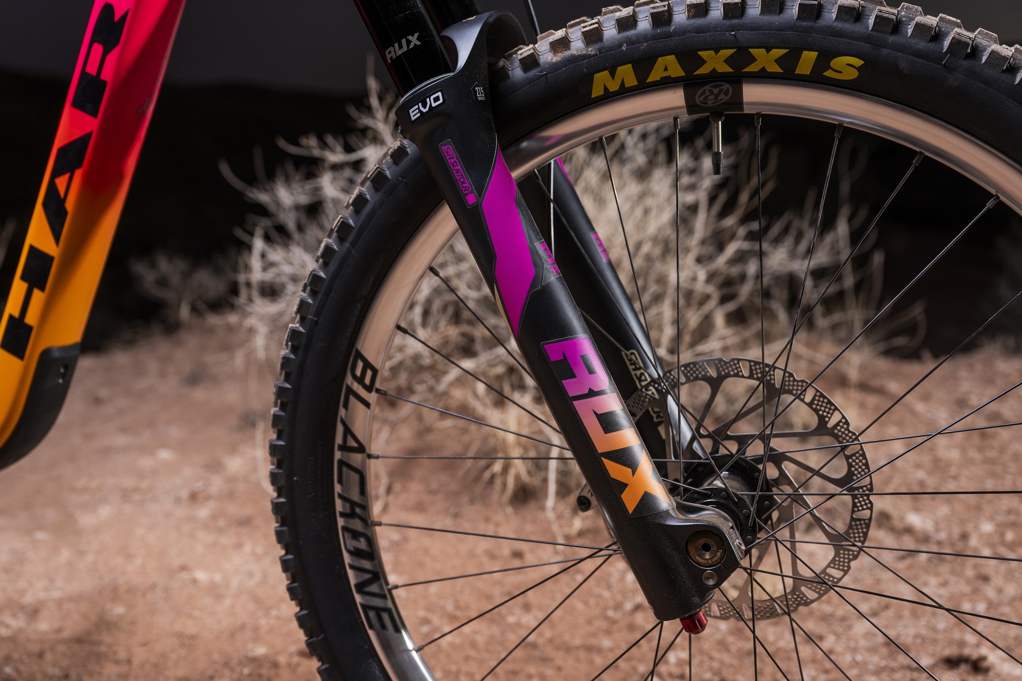 Вместо даунхилльного Sender Хаз решила использовать чуть менее длинноходный Torque. Спереди Boxxer на 200мм хода, в раме 170мм хода, 27.5" колёса вкруг. Специальная расцветка отсылает к ландшафту в Юте.
