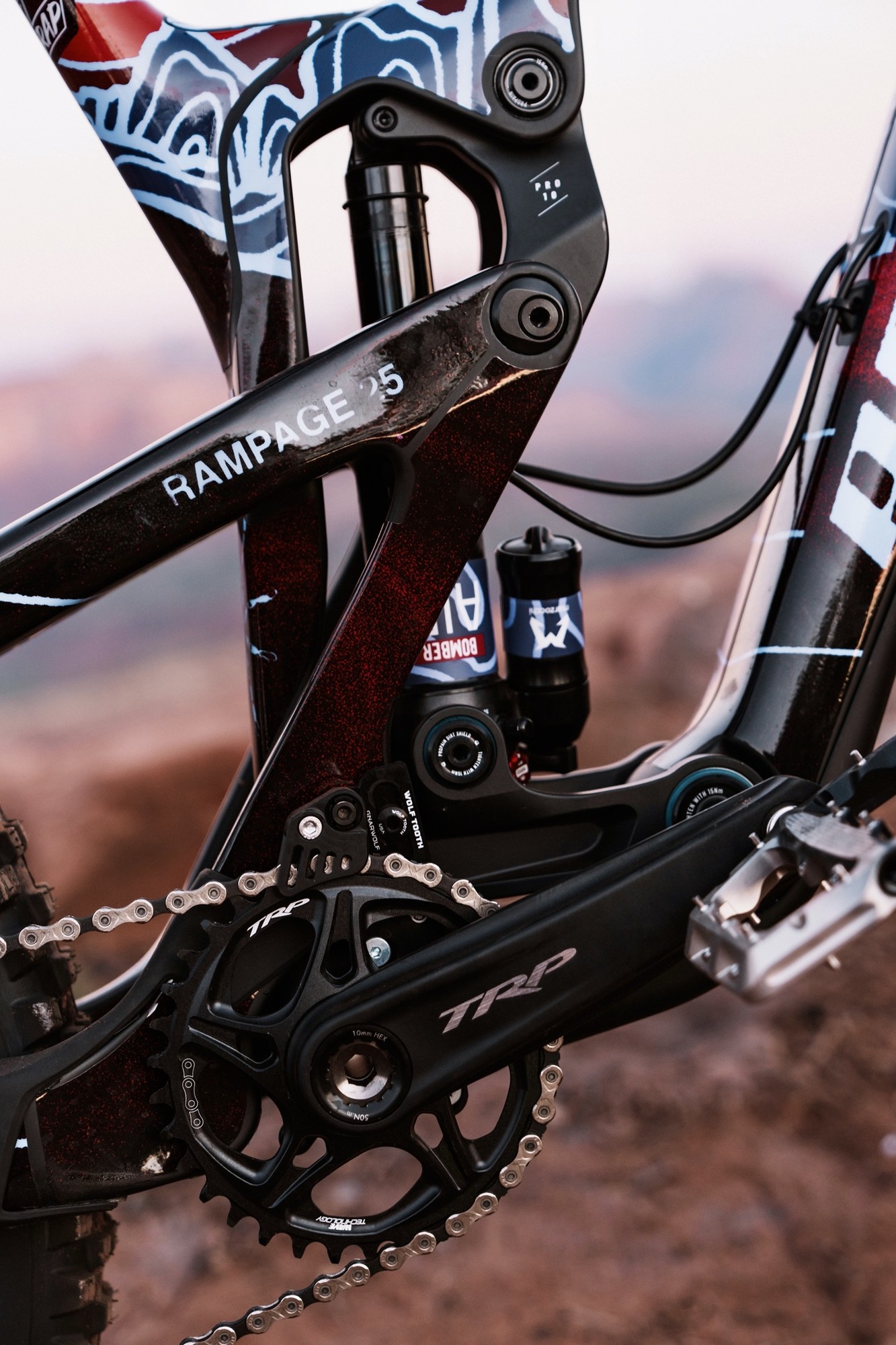 Один из немногих именно фрирайдных велосипедов на Rampage, 180мм хода подвески, двухкоронка и 27.5" колёса вкруг.