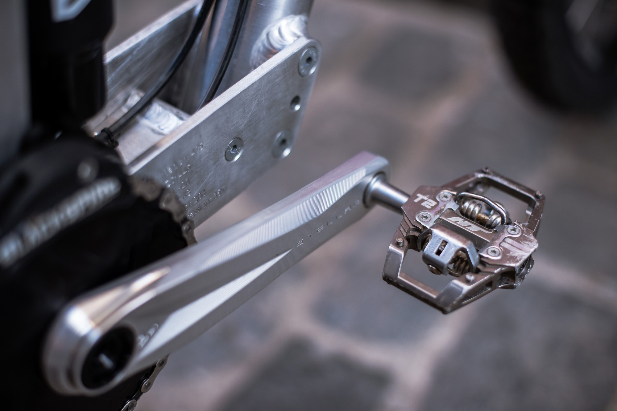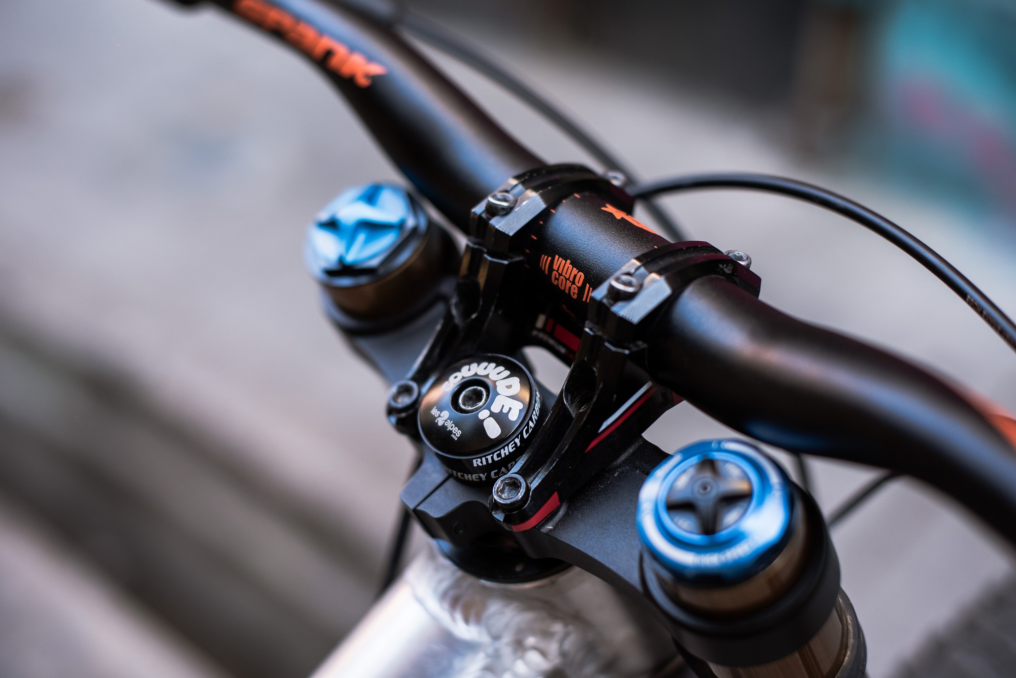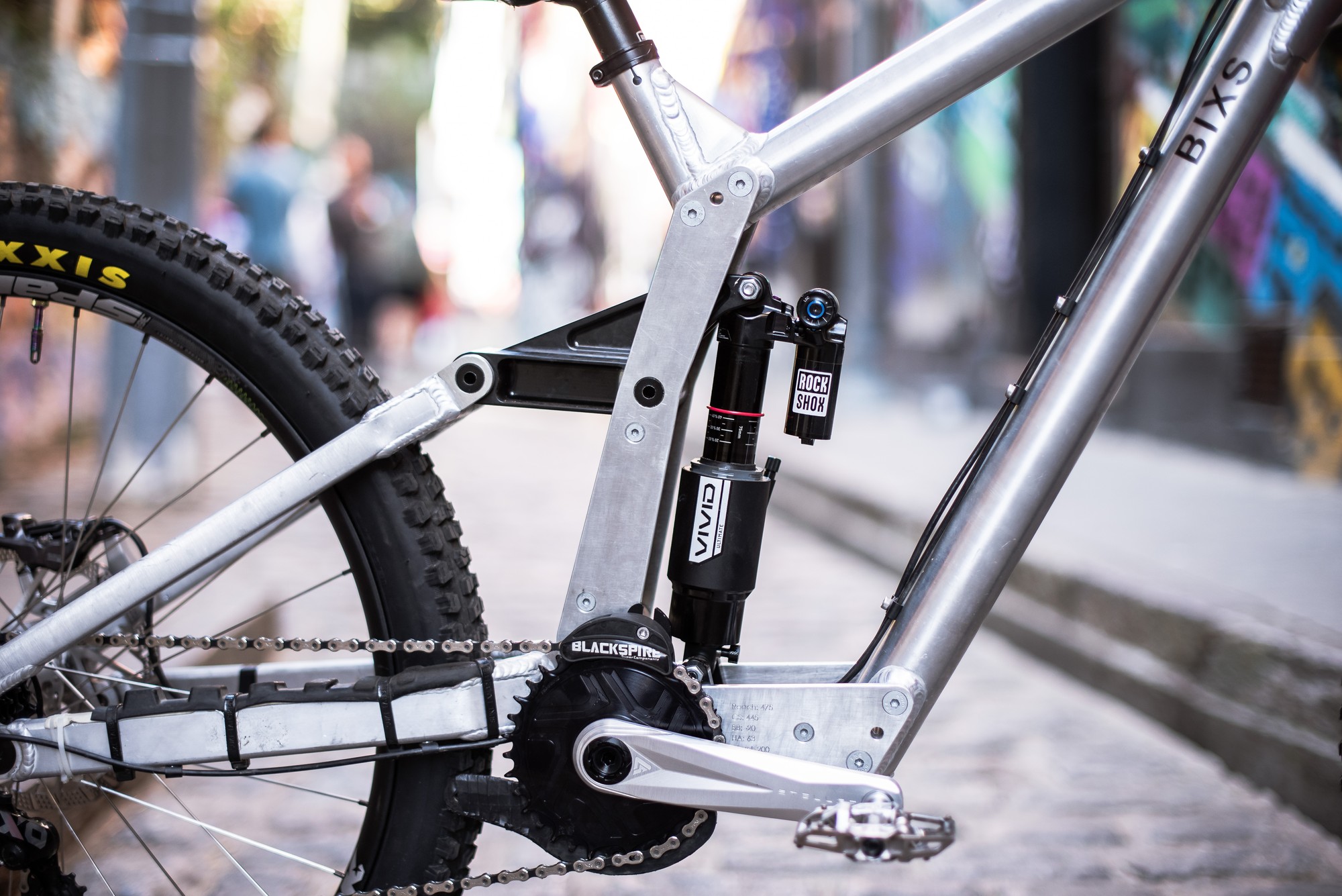 У каретки выгравированы основные характеристики этого прототипа. Рич 475мм, длина перьев 445мм, дроп каретки -20мм, угол рулевой 63°. Ход подвески ровно 200мм. Для обычного катания Адриен использует 455мм перья, но в городских гонках более короткие перья облегчают маневрирование на очень крутых поворотах и позволяют легче преодолевать лестничные пролёты. С более длинным задним треугольником велосипед очень похож на Santa Cruz V10 в размере L.