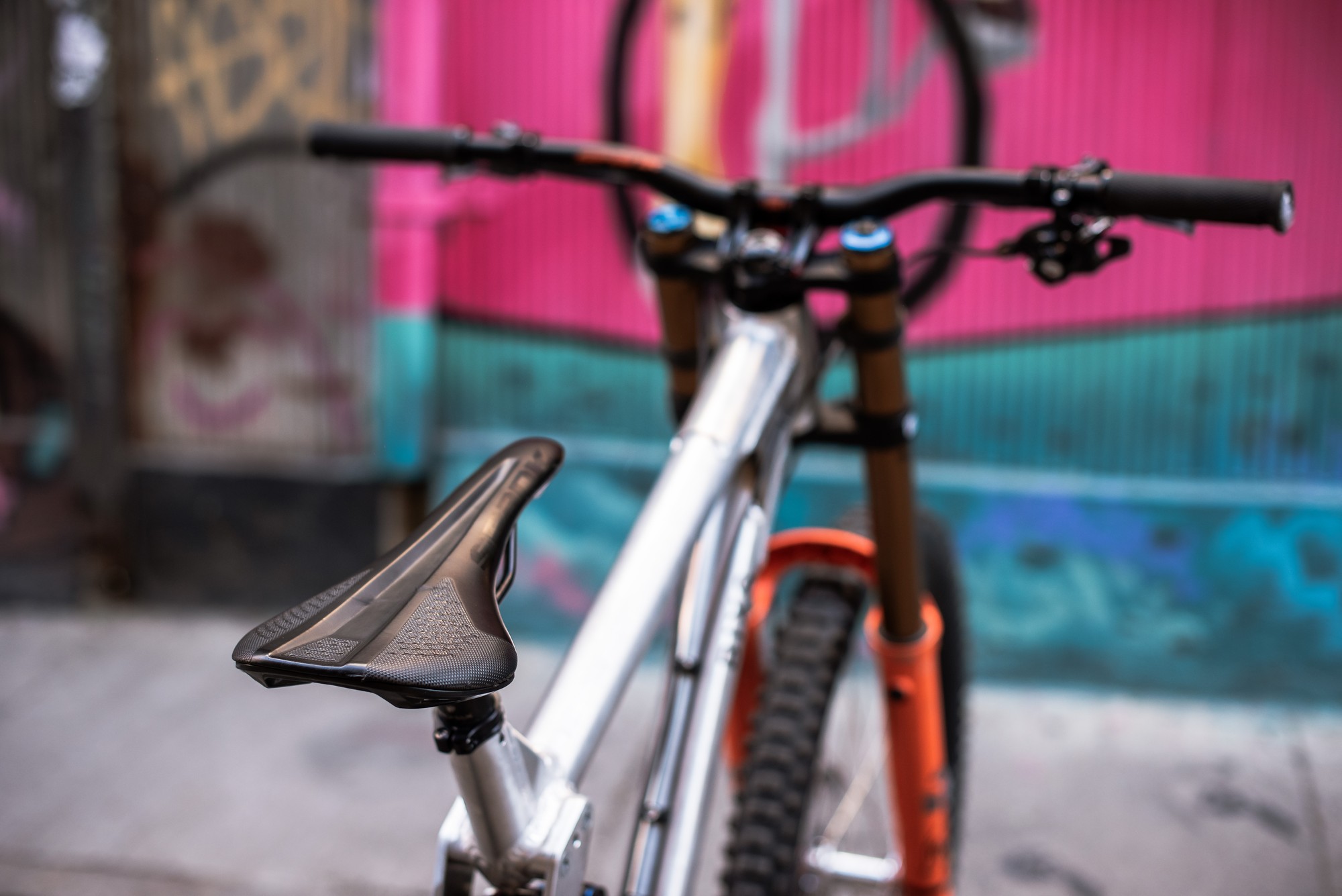 Настройка подвески для урбан-ДХ заметно отличается от той, что Адриент использует для обычных гонок, она намного, намного жестче. Отскок аморта почти полностью закрыт, чтобы минимизировать риск падения через руль. Воздушный амортизатор упрощает подстройку давления и позволяет не запариваться со сменой пружин в условиях ограниченного для тренировок времени, хотя в Vivid Air у Адриена почти максимальные 350psi. Спереди в вилке 4 токена и 150psi давления, но отскок не такой медленный.