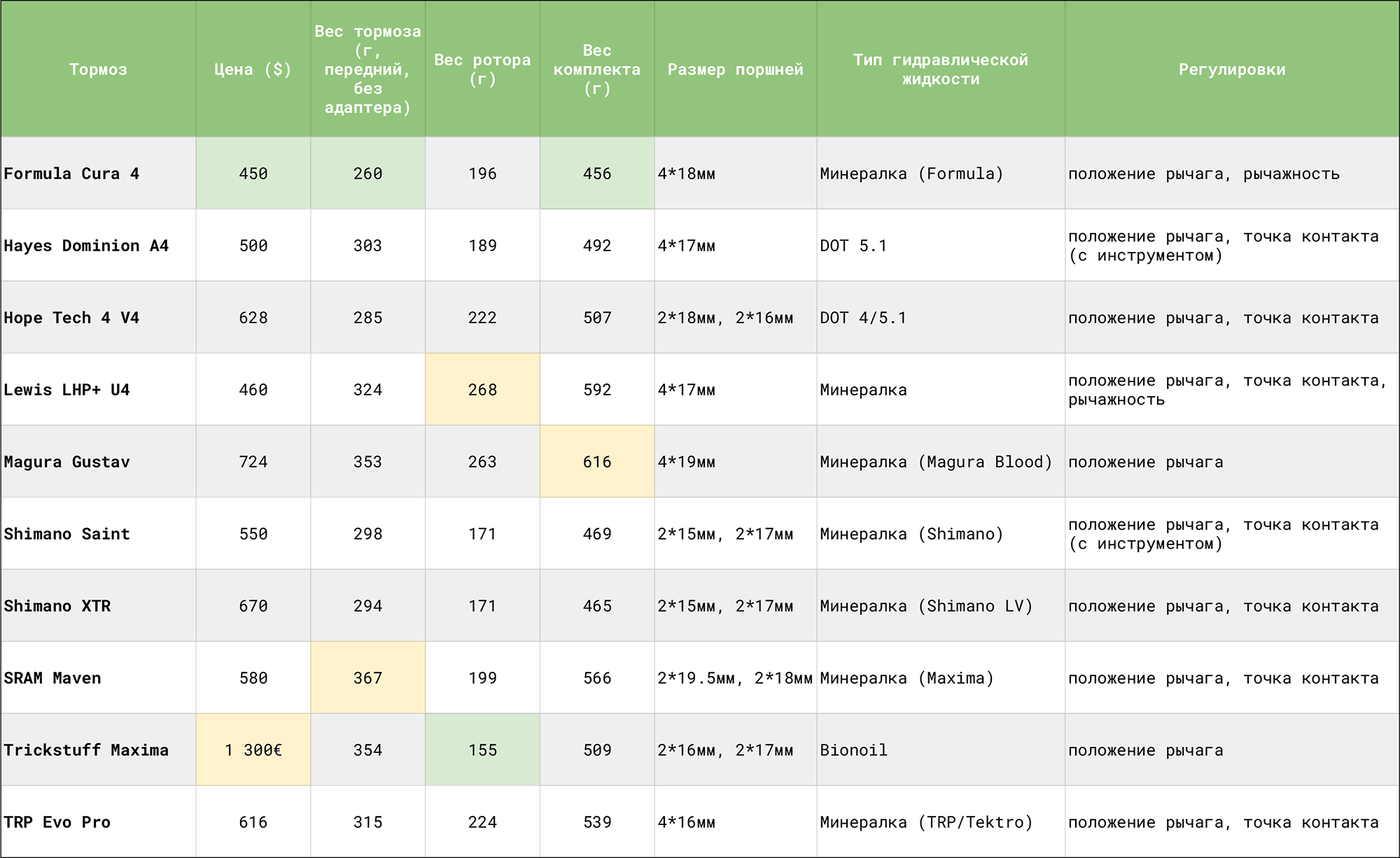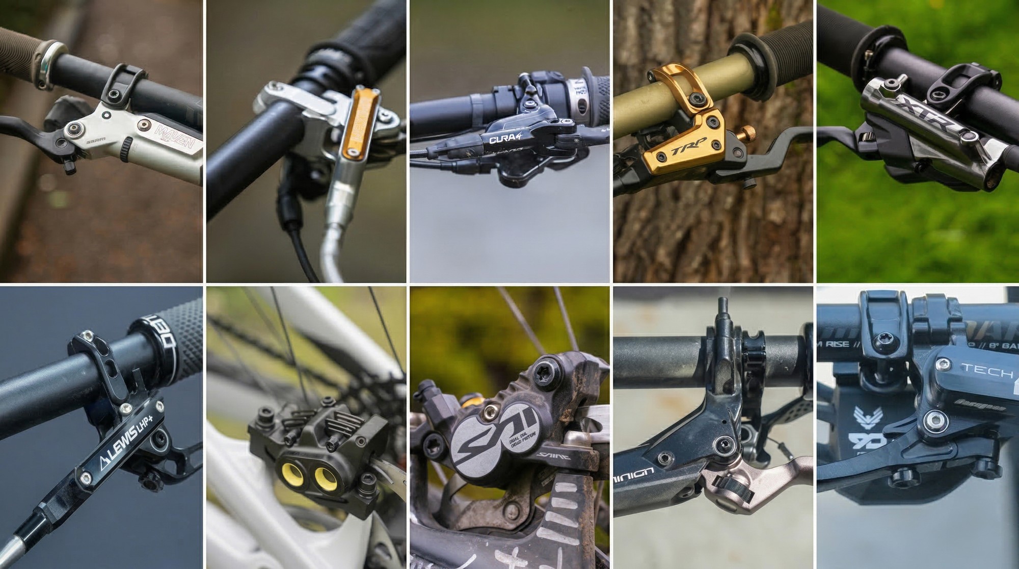 Оригинал статьи можно посмотреть на пинке. В тест попали: уже пожилые Shimano Saint, свежие SRAM Maven, проверенные Hayes Dominion A4, дорогущие Trickstuff Maxima, обновлённые TRP Evo Pro, лайтовые Shimano XTR, жирные Hope Tech 4 V4, примерные ровесники сэинтов Formula Cura 4, не самый очевидный выбор среди этого бренда Magura Gustav, и похожий на тормоза шедевр из кузницы поделок дядюшки Ляо Lewis LHP+U4.