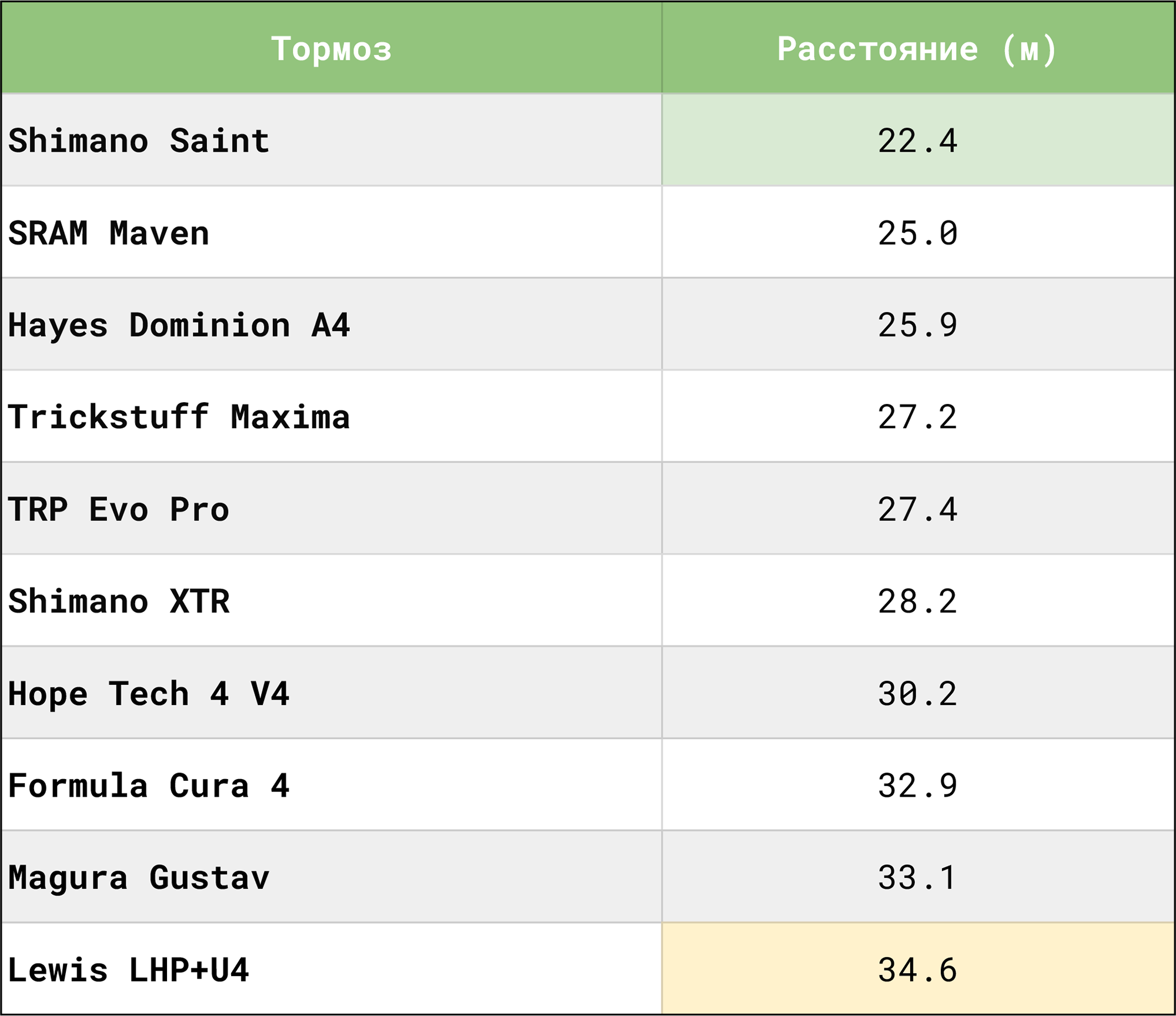 Shimano Saint оказались лучшими с большим отрывом (#видимо всего момент начала торможения удачно совпал с почти натянутым положением троса, что можно увидеть на видео ниже). За ними SRAM Maven и закрывают тройку Trickstuff Maxima. Худшие Lewis LHP+U4 и Magura Gustav.