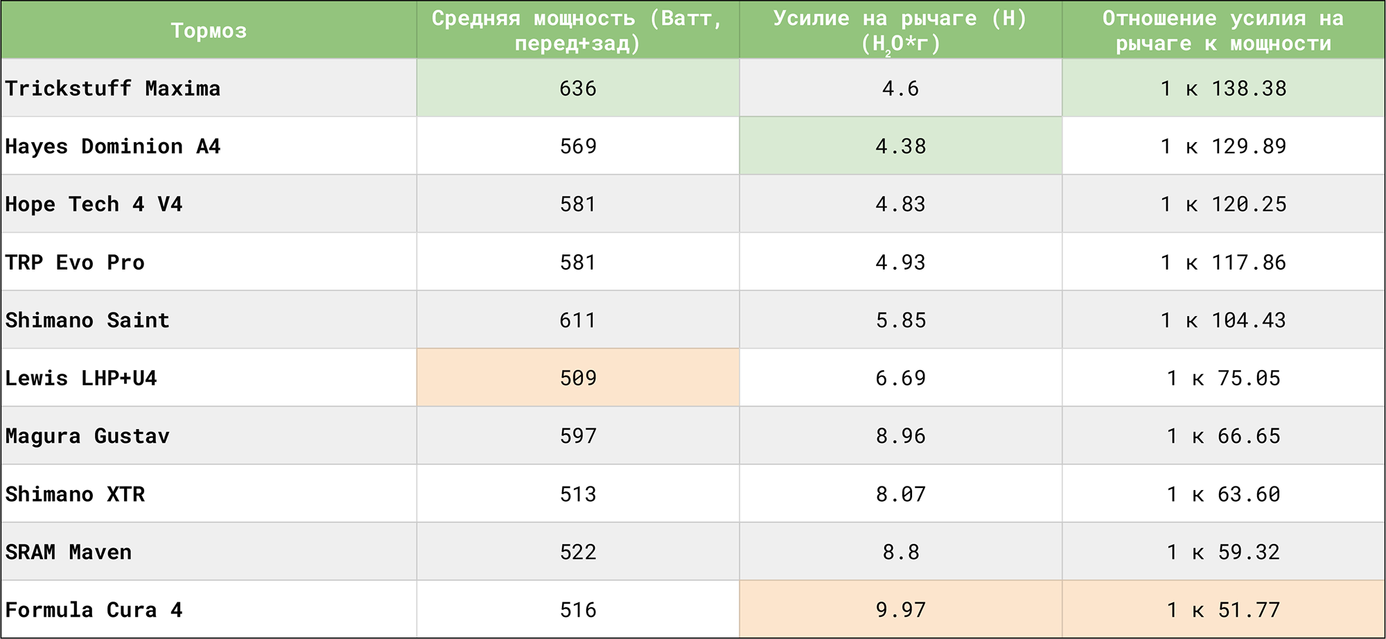 Самыми лёгкими на нажатие оказались Hayes Dominion, за ними идут Trickstuff Maxima и закрывает тройку Hope Tech 4 V4. К итоговой таблице также прикрутили данные по средней мощности торможения, полученные через адаптер Brake Ace на трейле в Вистлере. Здесь Trickstuff Maxima показали своё превосходство.