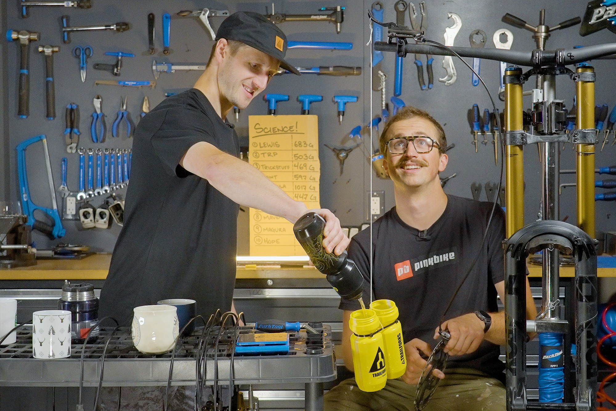 Немало копий сломано на тему усилия на рычаге, а производители почти каждую итерацию выдумывают какие-то регулировки для этого, новые рычажные механизмы и прочие хитрости. Не мудрствуя лукаво Мэтт Бир и Дарио ДиДжулио решили закрепить верёвку на краю тормозного рычага и измерить это усилие. Чтобы всё было честно — каждая тормозная ручка была настроена под предпочтение и антропометрические данные Мэтта. Ручку закрепляли на руле вертикально, имитируя палец крепили на край верёвку, а с другого конца привязали пару бутылок. И пока Мэтт наливал в бутылки воду — Дарио теребил ротор в калипере, чтобы поймать момент, когда тормоз его закусит. Как только ротор фиксировался в калипере — бутылки с водой взвешивали на весах. Гениально простой и понятный сэтап.
