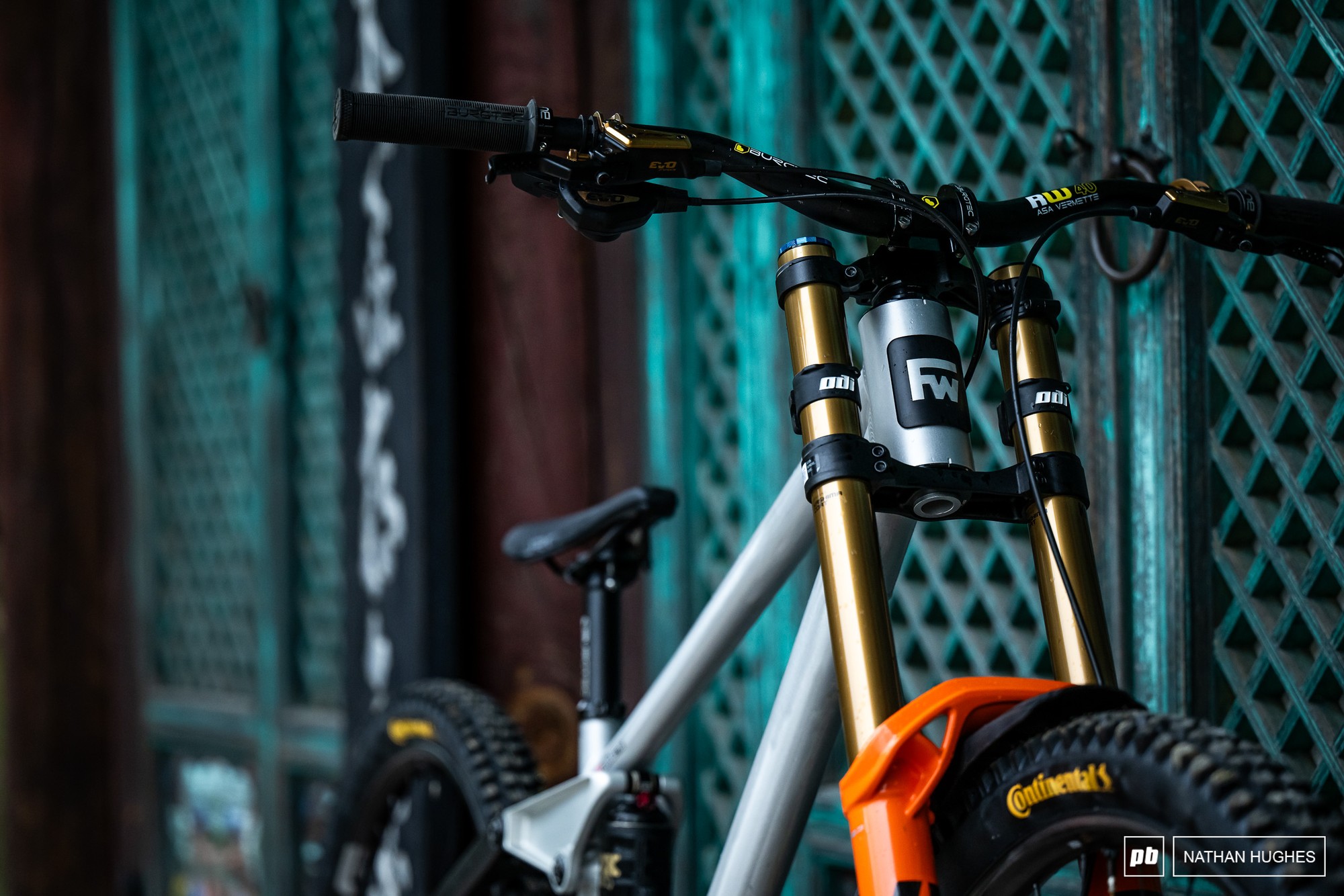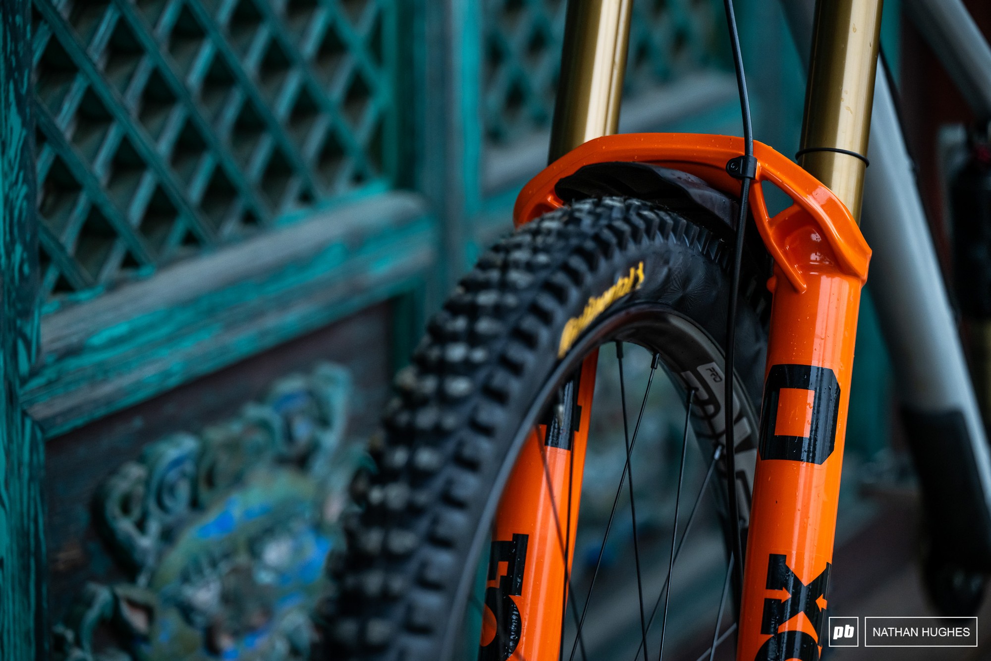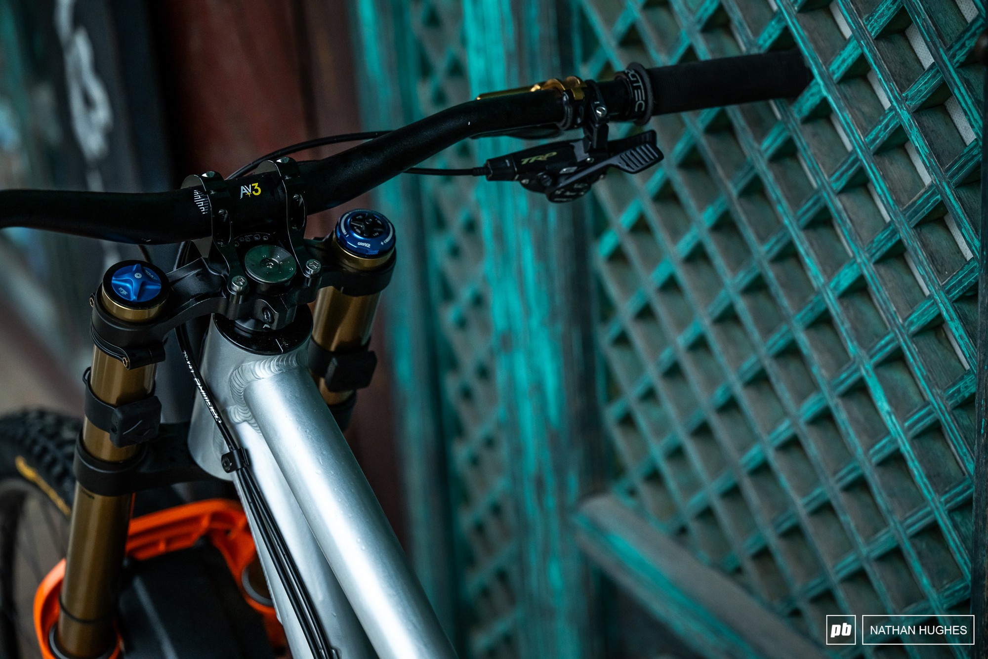Относительно байка, на котором Аса выиграл Hardline в Тасмании в этом году — изменения не слишком заметные. Здесь новая, серийная вилка с оранжевыми штанами. Что внутри вилки — не раскрывают, но раньше у Асы был кастомный тюн и более высокое стоковое давление.