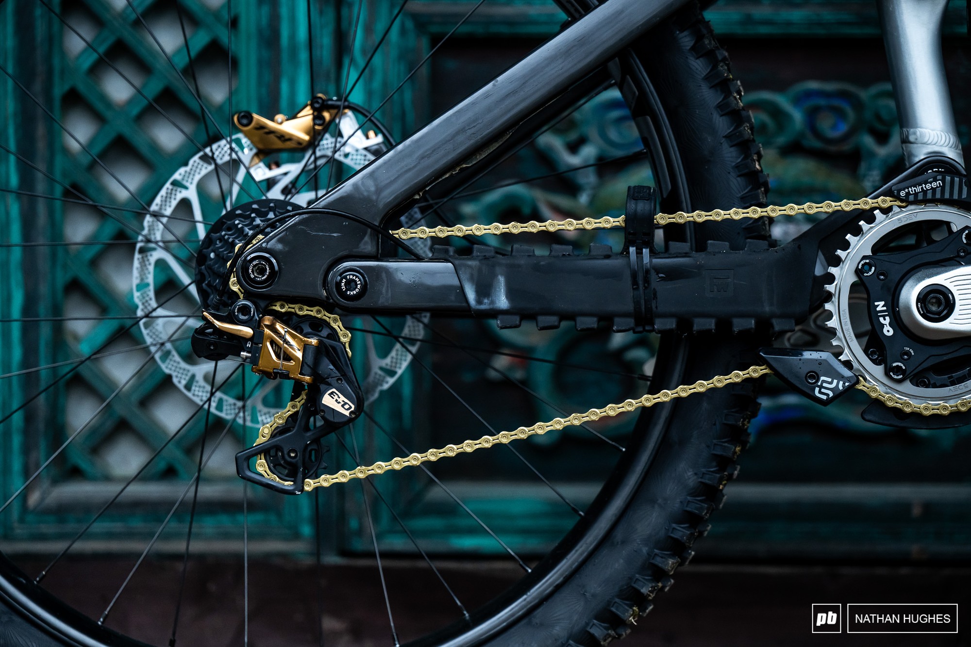 Трансмиссия TRP DH. Аса использует полноценный успок е*13 с роликом снизу, и дополнительно на пере стоит STFU-Chain от Криса Коварика.