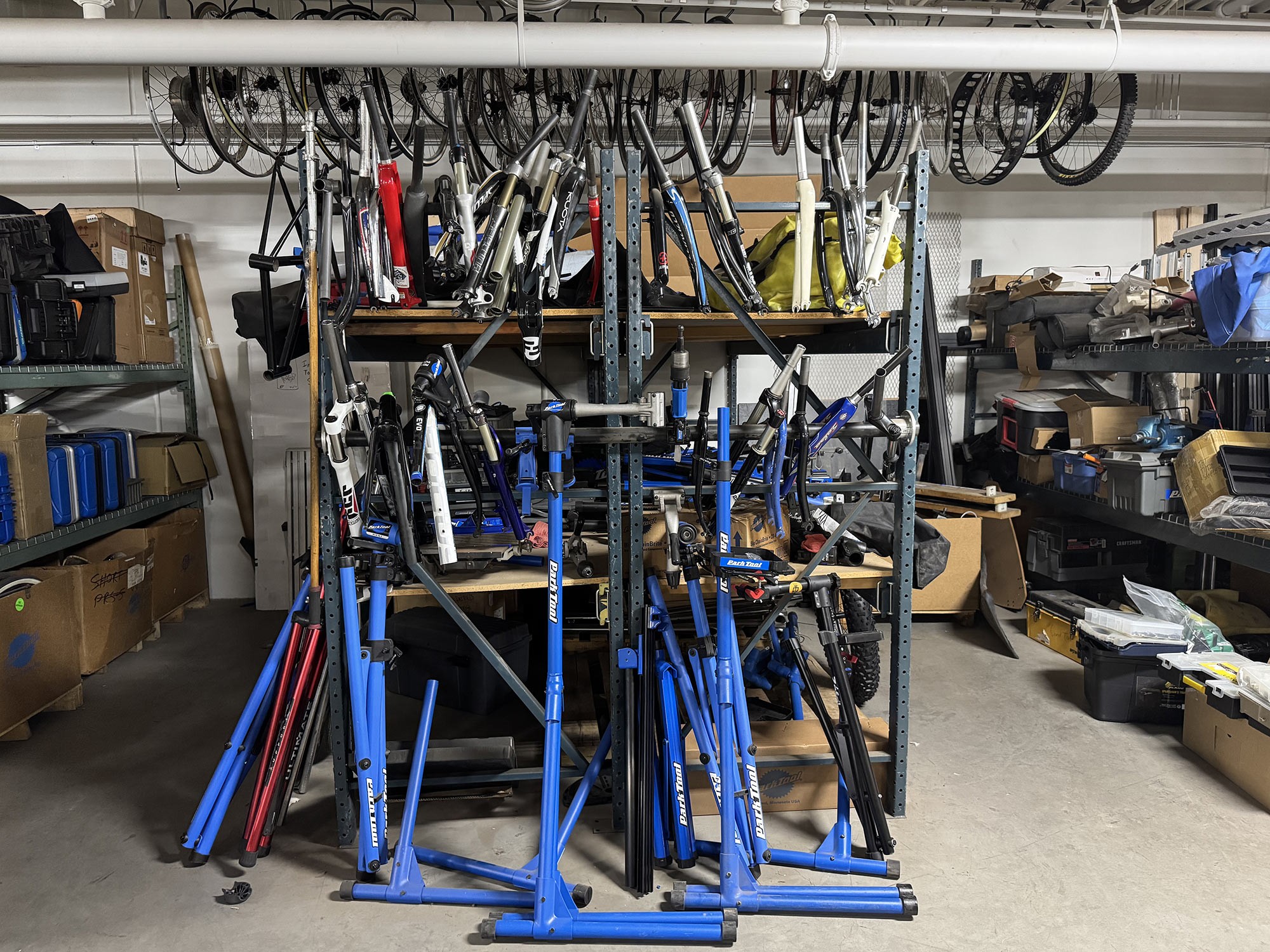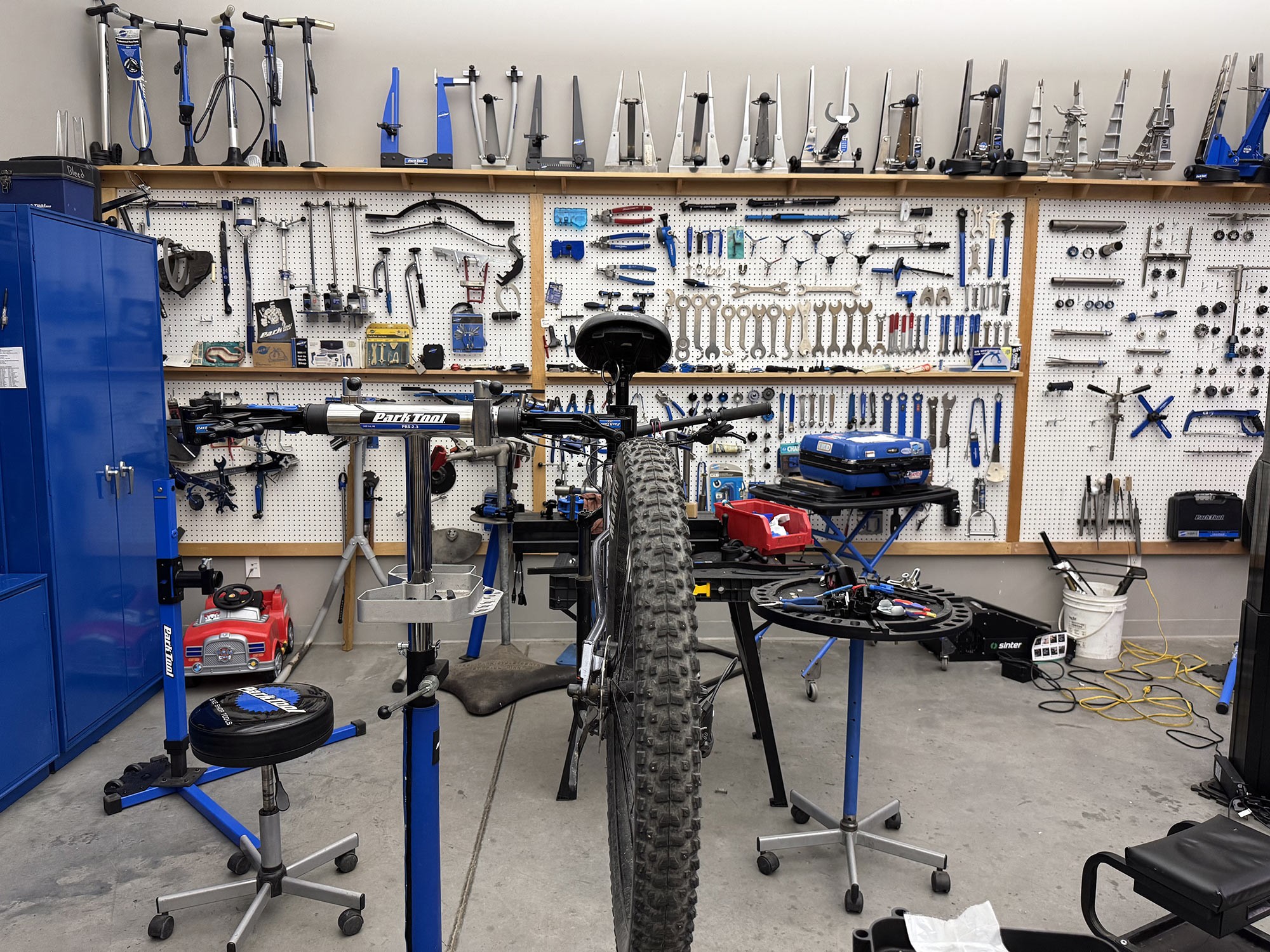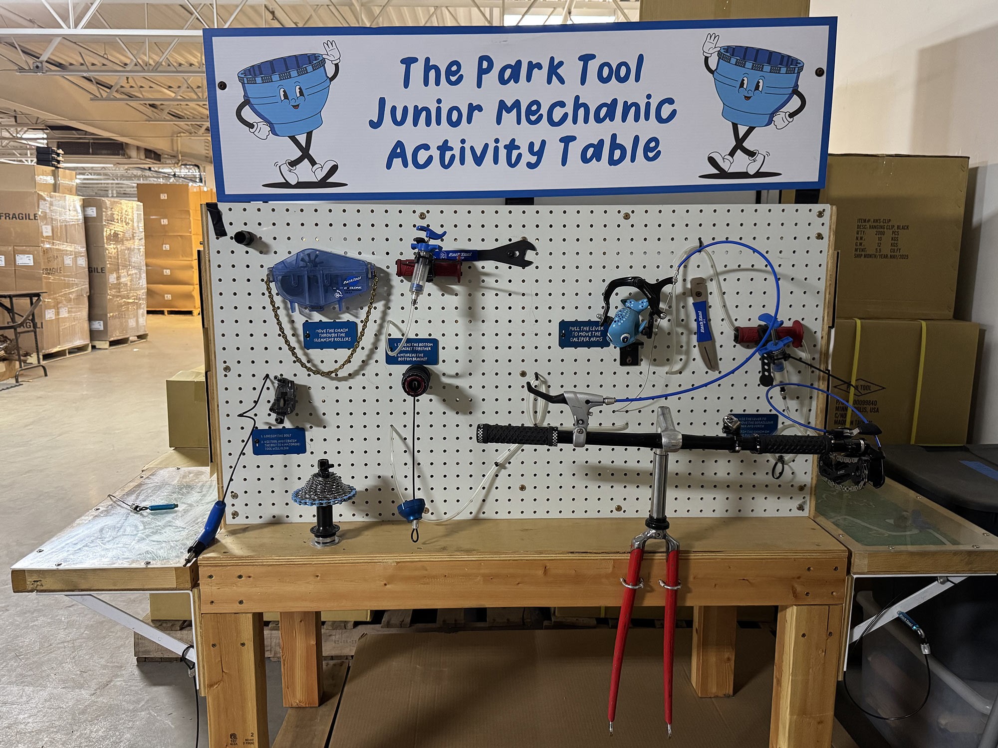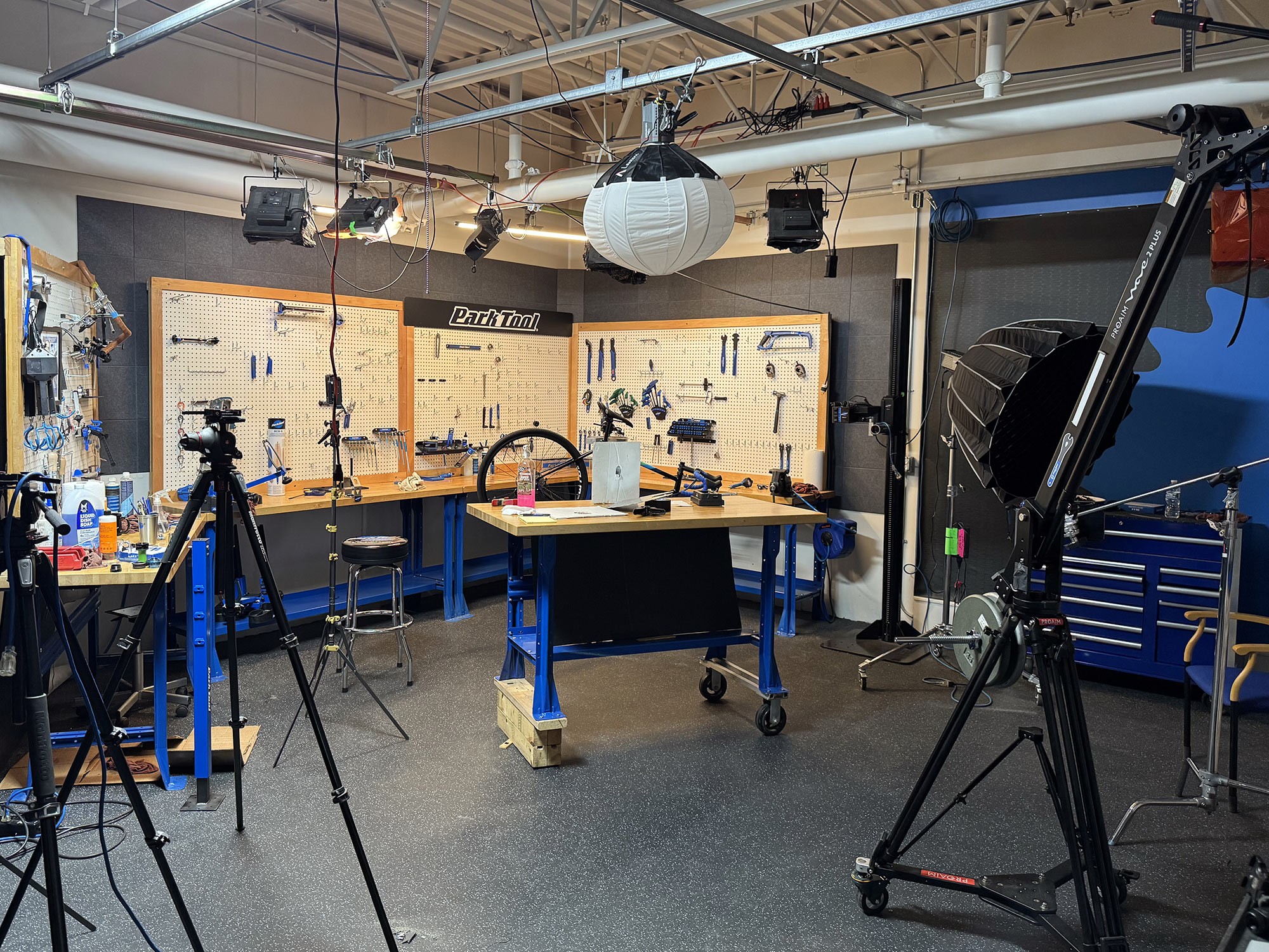 Если подняться наверх — можно попасть в легендарную мастерскую Park Tool, где механик-усач Кэлвин Джонс снимает обучающие видео по обслуживанию железок для канала Park Tool. Сейчас мастерская на небольшом апгрейде, так что со стендов сняли большинство инструментов. Рядышком находится фотостудия, через которую фотографии инструмента попадают на сайт.