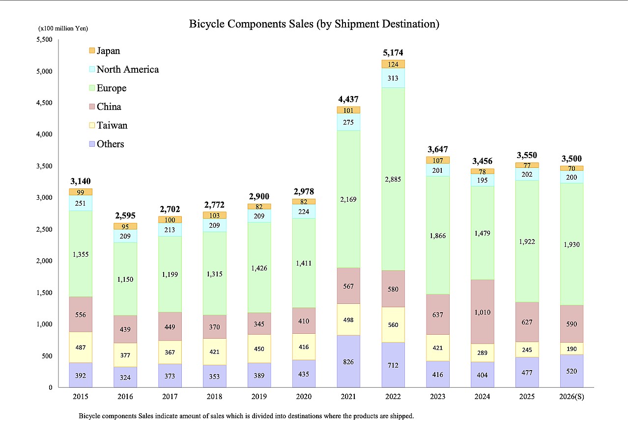 На грядущий 2026 год компания прогнозирует 0.2% рост чистой выручки, до 304.8 миллионов $. Ожидается, что операционная прибыль снизится на 9.1%, а обычная прибыль увеличится на 19%. В велосипедном подразделении прогнозируется снижение операционной прибыли на 9%, до 25.4 миллионов $. График с продажами в йенах ниже.