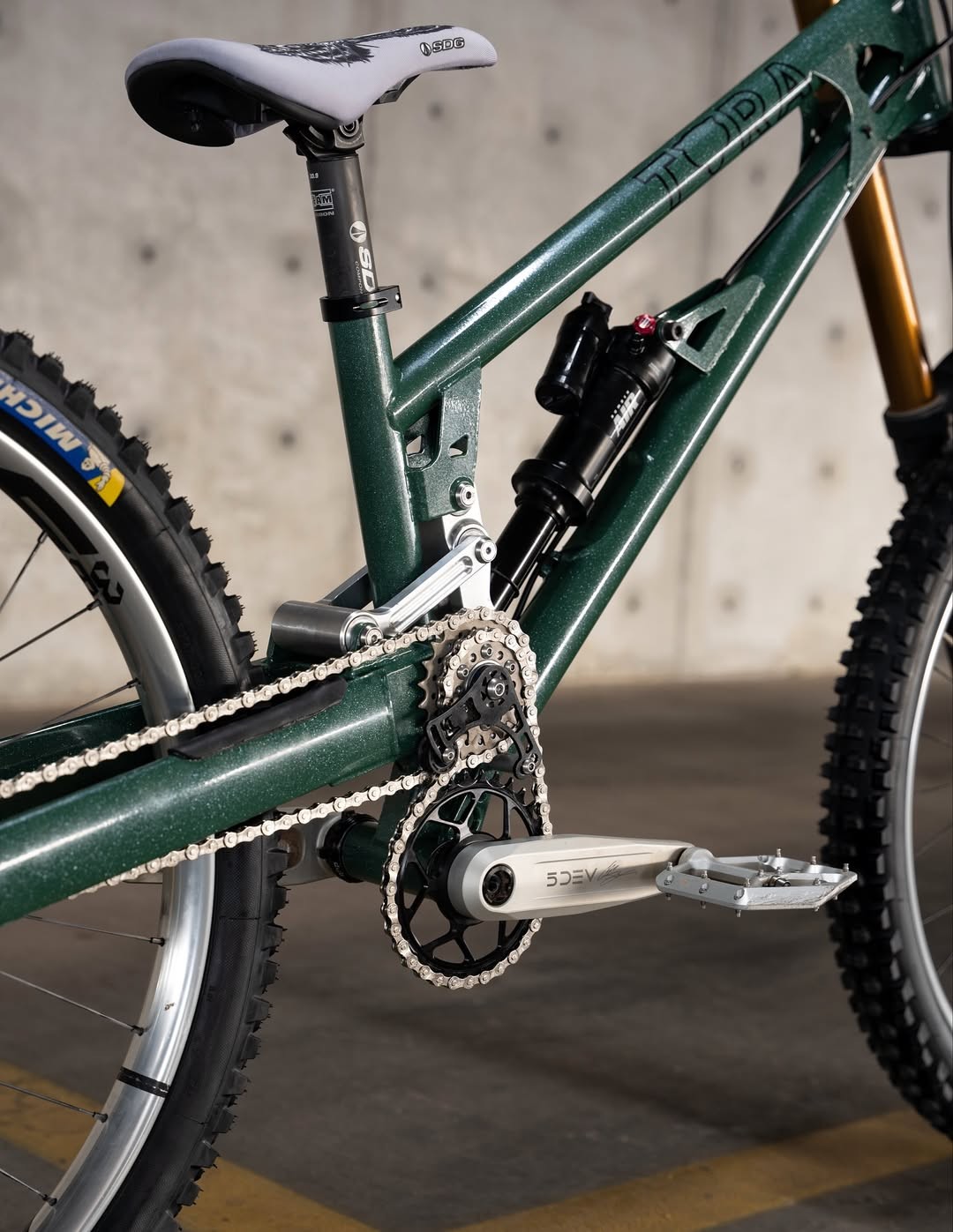 Как вы наверняка помните — изначальный дизайн байков EVH от Tora Cycles был вдохновлён дизайном легендарной Brooklyn Machine Works. Но постепенно Нил Пенгилли придумывает что-то своё. Судя по фото, новый байк Итана — это свежайшая модель ENR, котору пока только тизерят. Перья остались примерно такими же, как и у EVH, пара цепей тоже на месте, но аморт теперь находится внутри переднего треугольника, а мотолинк сменила более распространённая компоновка с парой линков. Если верить этому посту — в раме 170мм хода спереди и сзади, 63° угол рулевой и 26" колёса вкруг! Что же, ждём скорого анонса и поздравляем Итана с крутым спонсором!