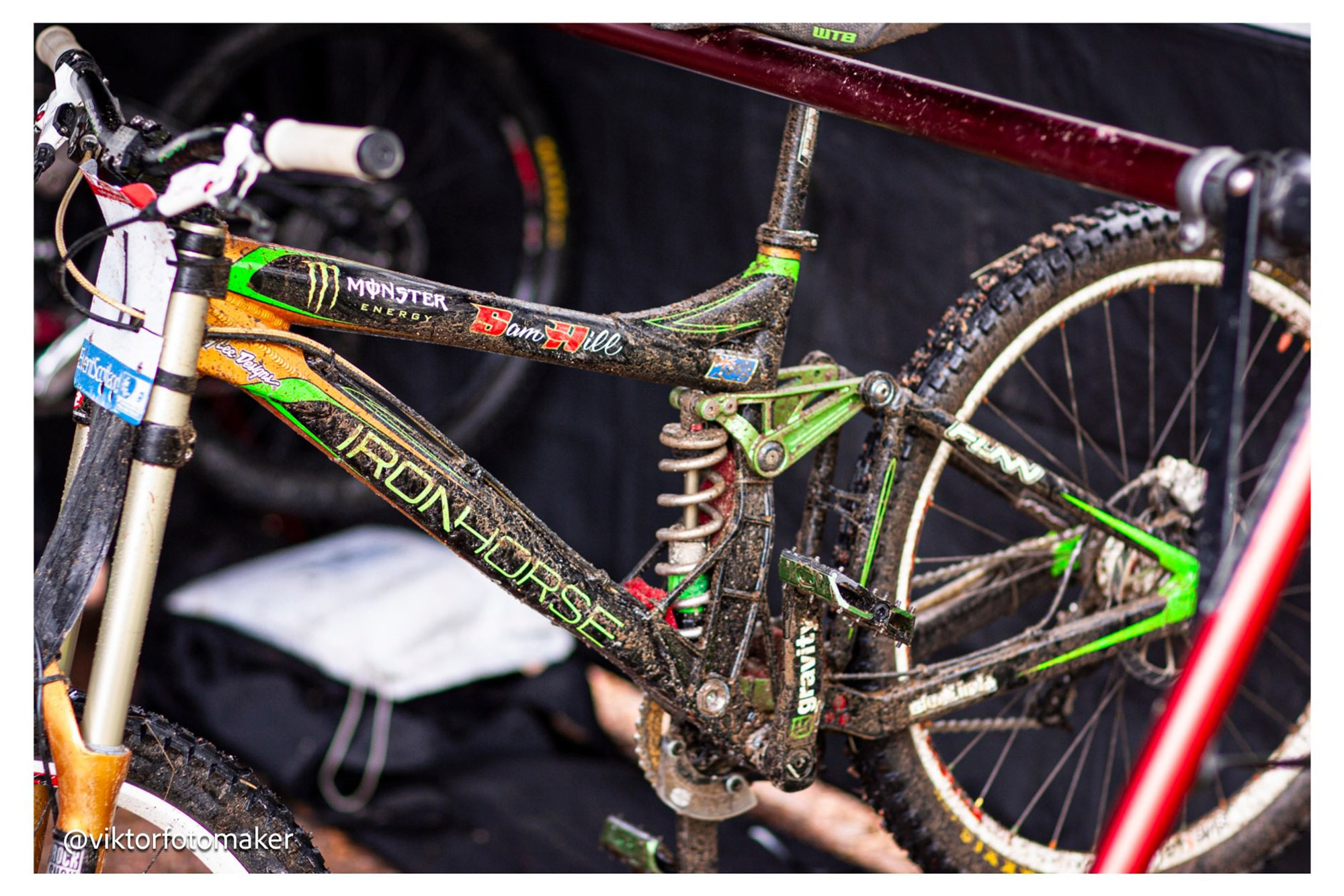 Воскресное возрождение этого велосипеда стало божественным моментом для четырех фанатов велоспорта, стоявших перед ним. Велосипед, синоним стольких легенд — Iron Horse Sunday Сэма Хилла, победившего на Чемпионате Мира 2007 года! Погруженные в восхищение этим культовым образцом истории горного велоспорта, мы еще не осознавали, насколько далеко продвинулись технологии и геометрия велосипедов за последние 18 лет. Все внутри замерло, когда Сэм перекинул ногу через него.