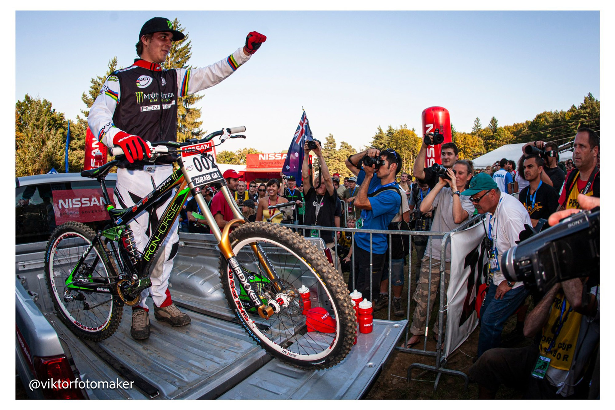 Наш арендованный Kia Carnival был до отказа забит фотооборудованием, а из стереосистемы гремела музыка из наших любимых фильмов о горных велосипедах. Несмотря на то, что через заднее стекло, да и через окна за передними сиденьями, ничего не было видно, в машину нужно было поместить еще один важный для нашей истории предмет — велосипед Сэма Iron Horse Sunday 2007 года выпуска. На этом велосипеде Сэм одержал свою вторую победу на ЧМ в Форт-Уильяме, а на заключительном этапе КМ в Мариборе, состоявшемся на следующие выходные, завоевал свой первый титул в общем зачете среди элиты. С тех пор он на этом велосипеде не ездил.