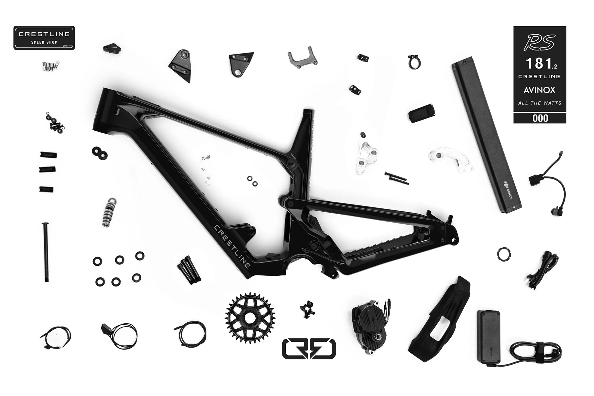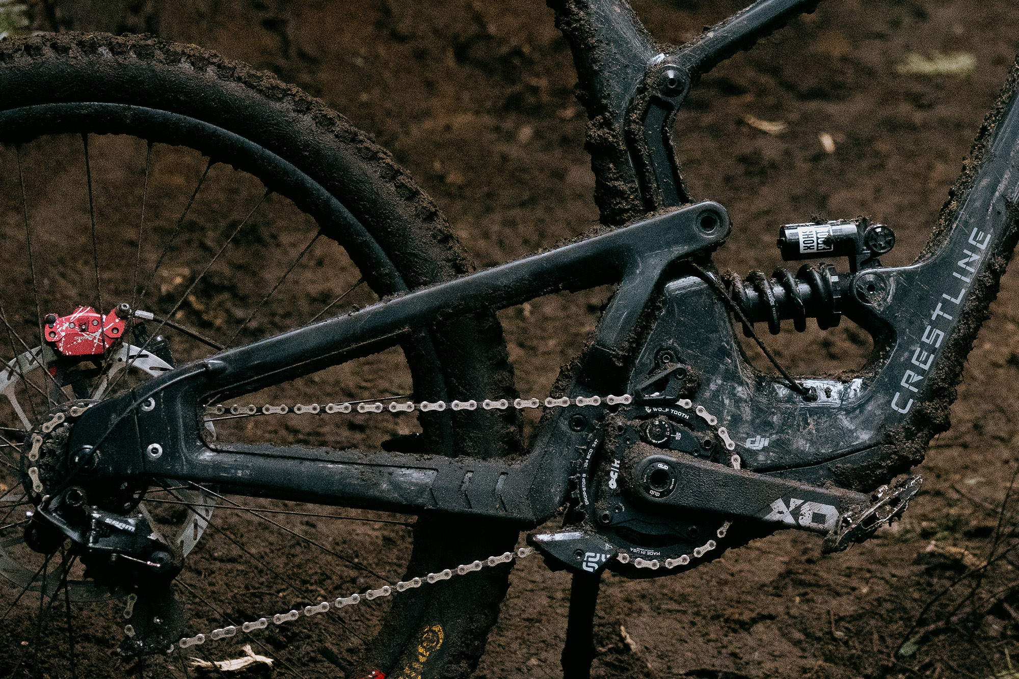 Как поясняет сам Олден — Crestline RS 205 VHP выпускают только в одном размере рамы и он ему маловат. Не мудрствуя лукаво вместе с инженерами Crestline Олден сделал примерно то же самое, что пару лет назад сделали Orbea. Они взяли раму от электрички RS 181 в размере XL, выкинул из неё двигатель и аккум, поставили на место каретки переходник под обычные шатуны и слегка изменили линки. Теперь в раме 200мм хода подвески и она работает с двухкоронкой спереди. Дыру от исчезнувшего мотора прикрыли напечатанной на 3d-принтере ребятами из Jank Components крышкой и теперь былую электричку в байке выдаёт только надпись DJI у каретки. Интересно было бы узнать какой в итоге получился финальный вес.