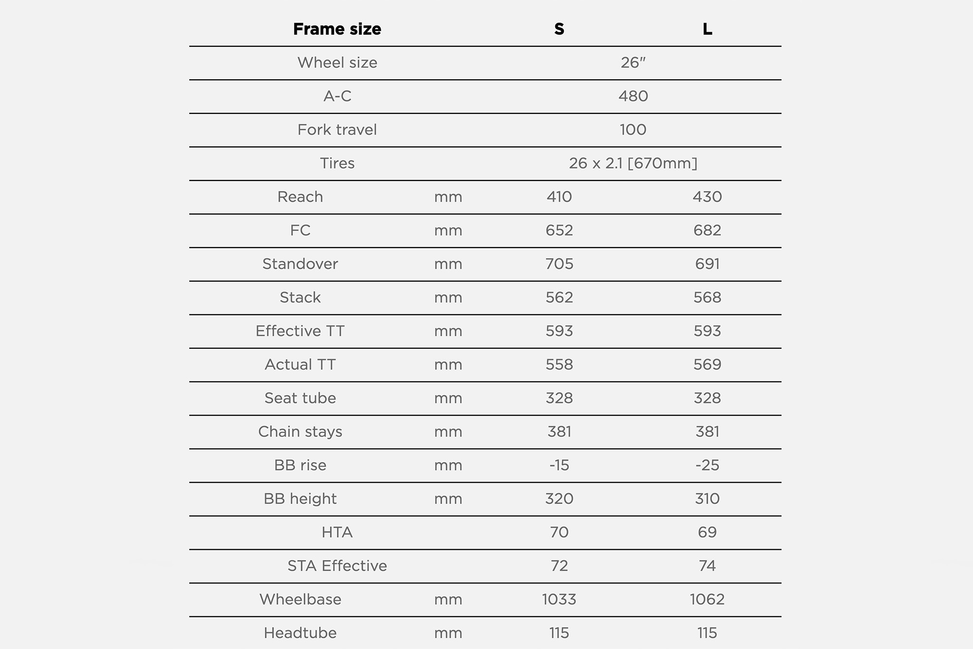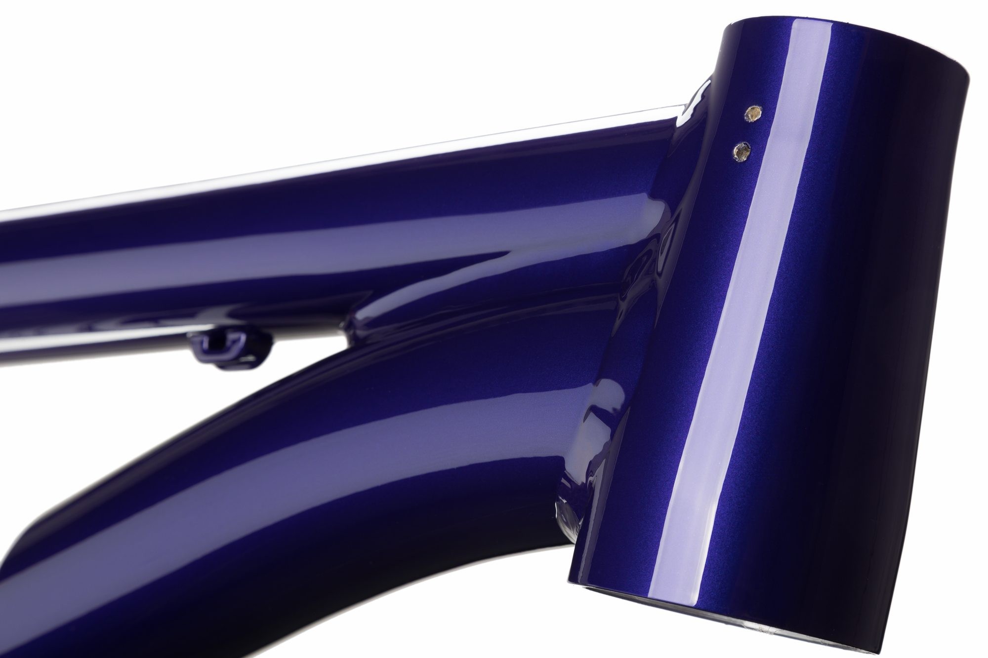 Раму варят из алю 6061-T6. Пользователям обещают регулируемые дропауты с интегрированным натяжителем, резьбовую картку BSA 73, совместимость с гиро-роторами. Максимальный размер ротора 185мм, максимальный размер ведущей звезды 34Т, максимальная ширина покры 26x2.35". Рулевая конусная ZS44/ZS56, зажим подседела 36мм, сам подседел 31.6мм.