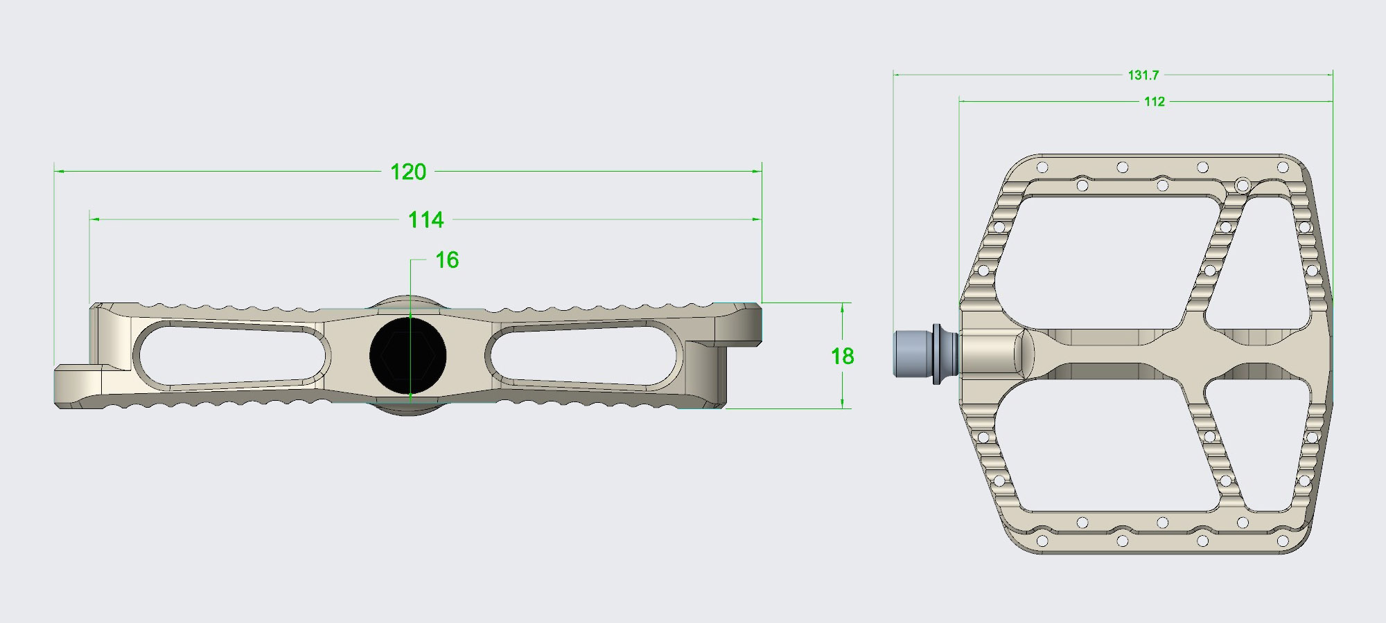 Размер платформы на первых топталках от 612 Parts вызывает уважение, рабочая поверхность 114*112мм, а общий размер 120*112мм. Конкейв небольшой, высота педали снаружи 18мм, а внутри 16мм.