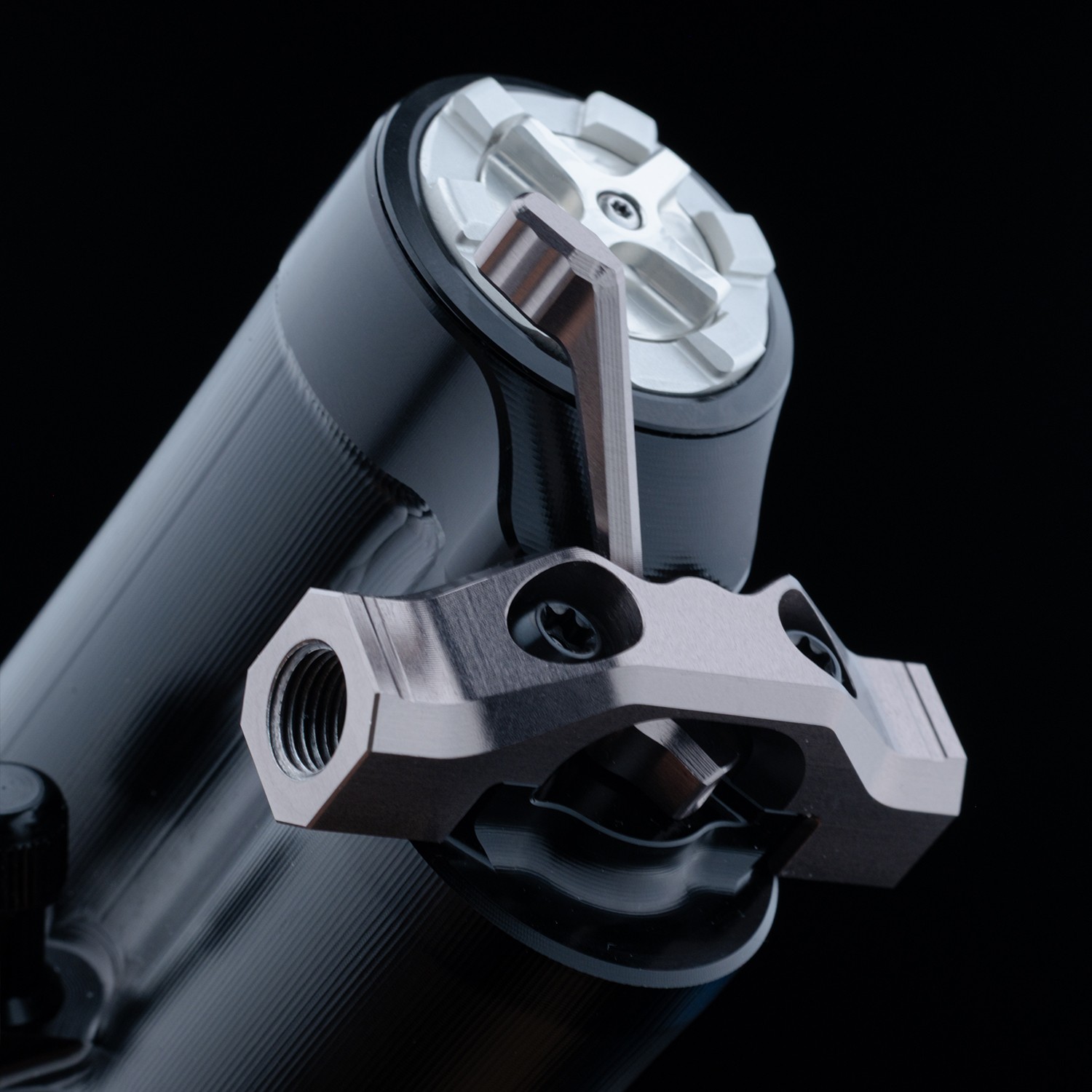 В пресс-релизе Intend рассказывает, что улучшили первоначальный дизайн, собрав статистику по косякам. Внутри в редких случаях может лопнуть один из поршней, а C-клипса слетает? Меняем конструкцию поршня и делаем посадочные резьбовыми! Пользователи не могут запомнить последовательность подкачки аморта с открытием негативки соответствующей крутилкой? Делаем проточку для уравнивания давления между камерами и убираем крутилку. Для сборки нужны уплотнительные оринги? Фрезеруем тушку и расширительный бачок из цельного куска металла, избавляясь от орингов!