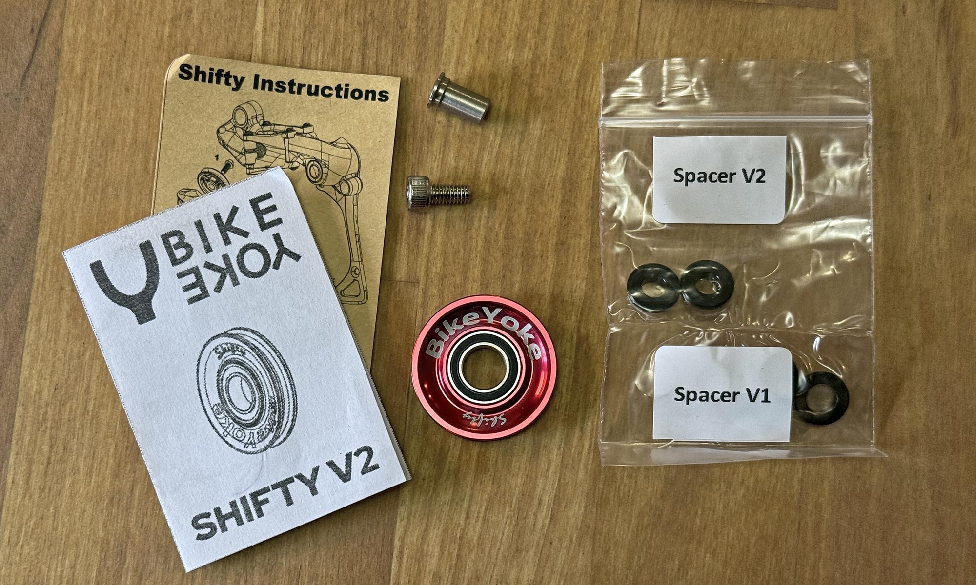 В новых переключателях Sram этот ролик сделали слегка тоньше, так что BikeYoke выпускает обновлённую версию v2. Причём благодаря проставкам можно будет использовать ролик и на старых переключателях Sram, у которых фиксирующий болт чуть больше. Комплект поставки на фото ниже.