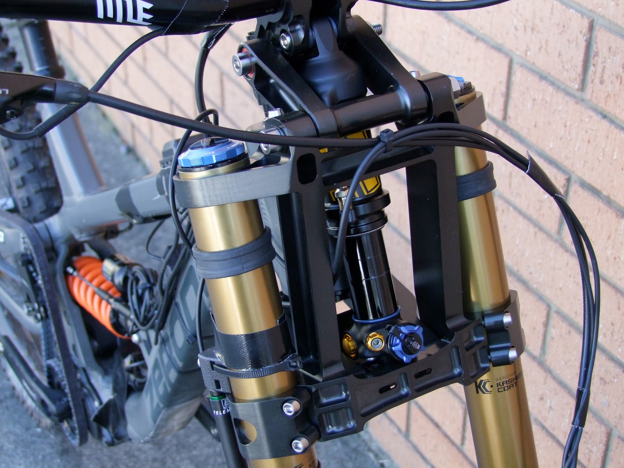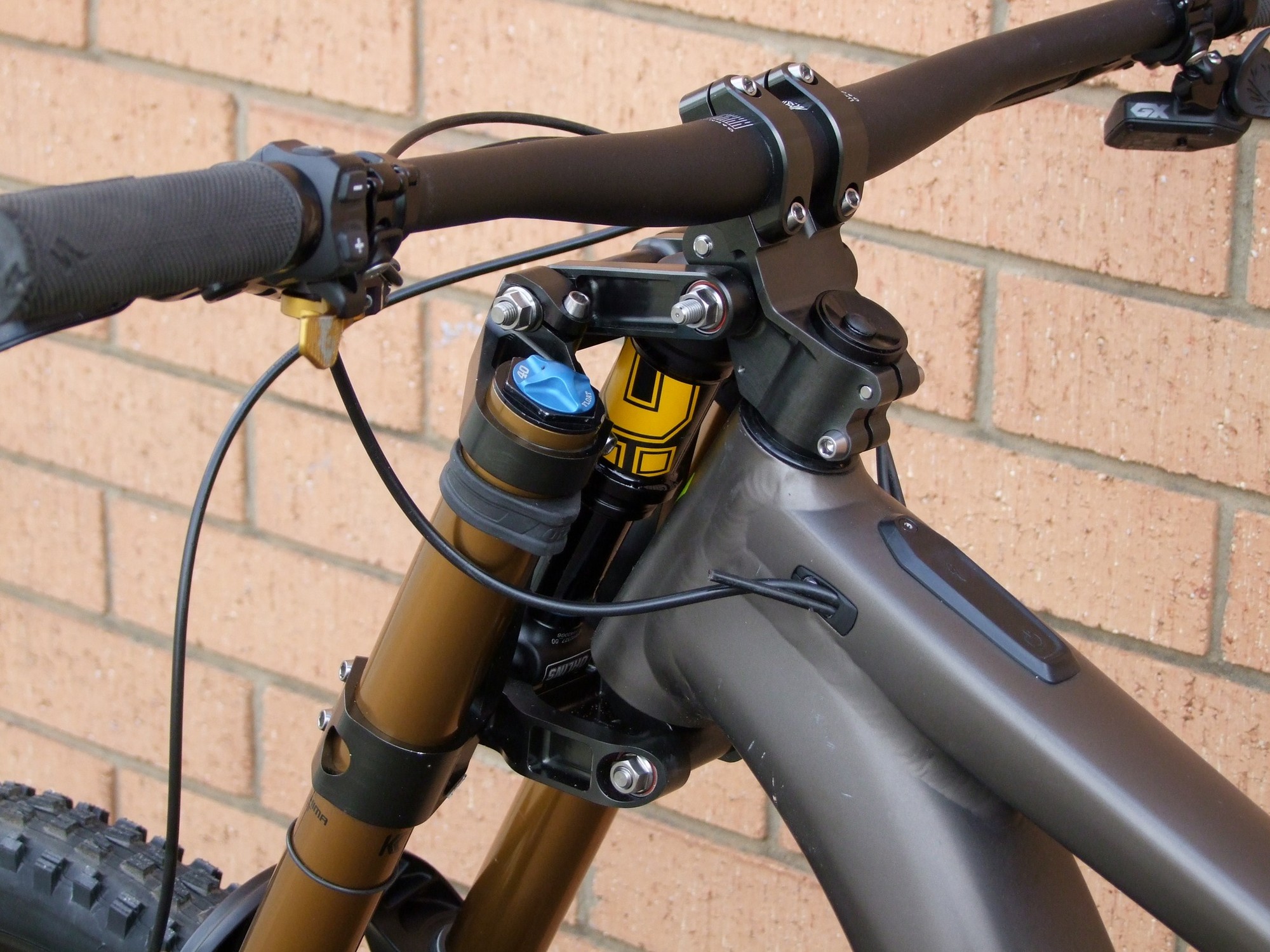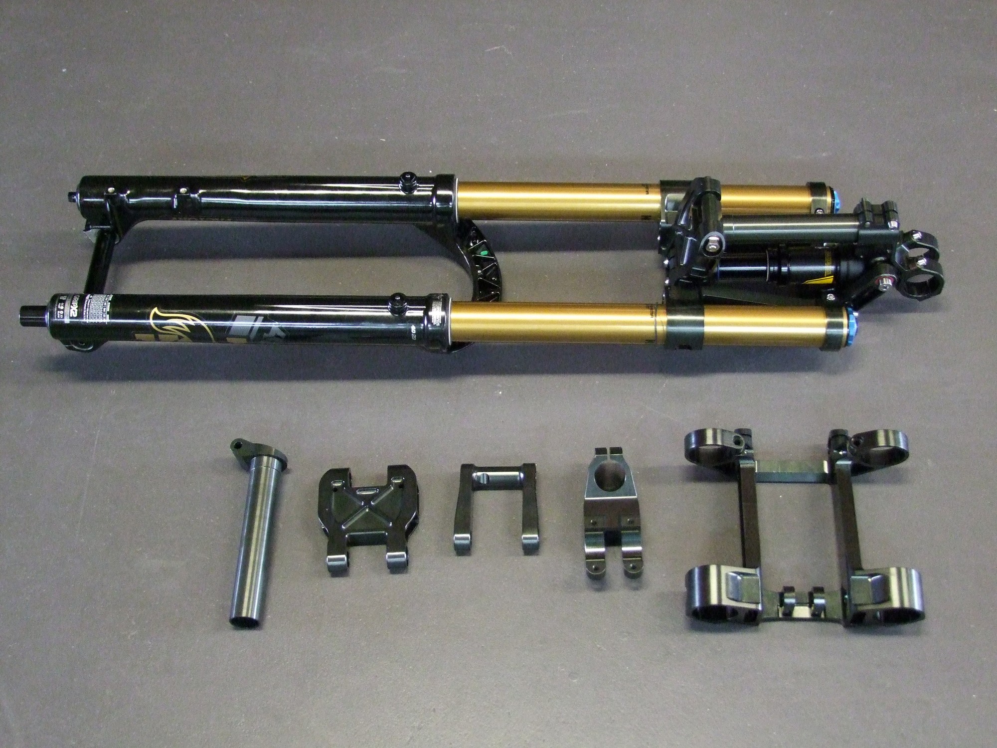 Однако Лоуренс улучшил идею и превратил её в кастомные короны для Fox 40, которые можно установить на вполне обычную вилку. Параллелограммный механизм добавляет 55мм хода. Работает всё это дело за счёт коротенького и лёгкого кантрийного амортизатора Ohlins TXC2 Air.