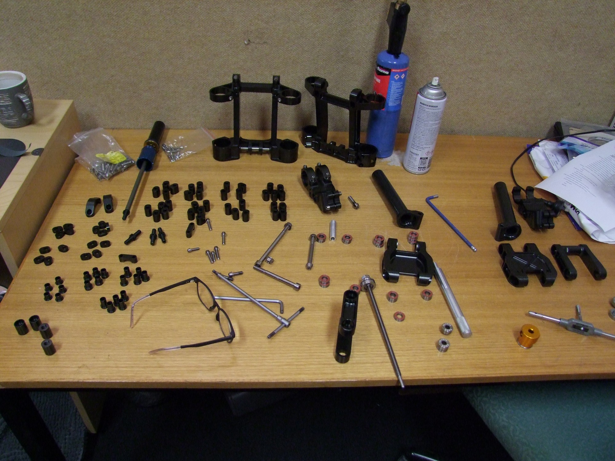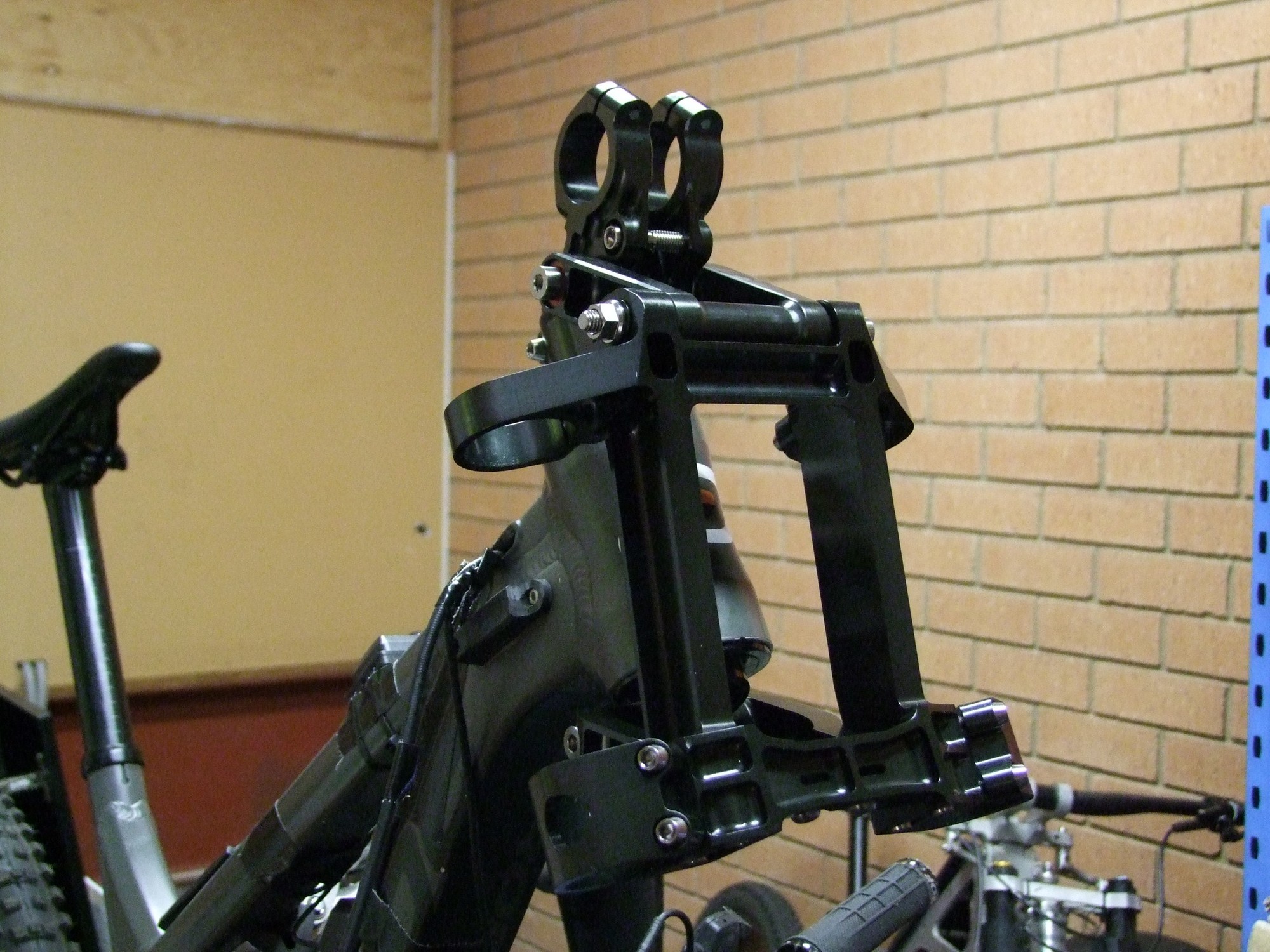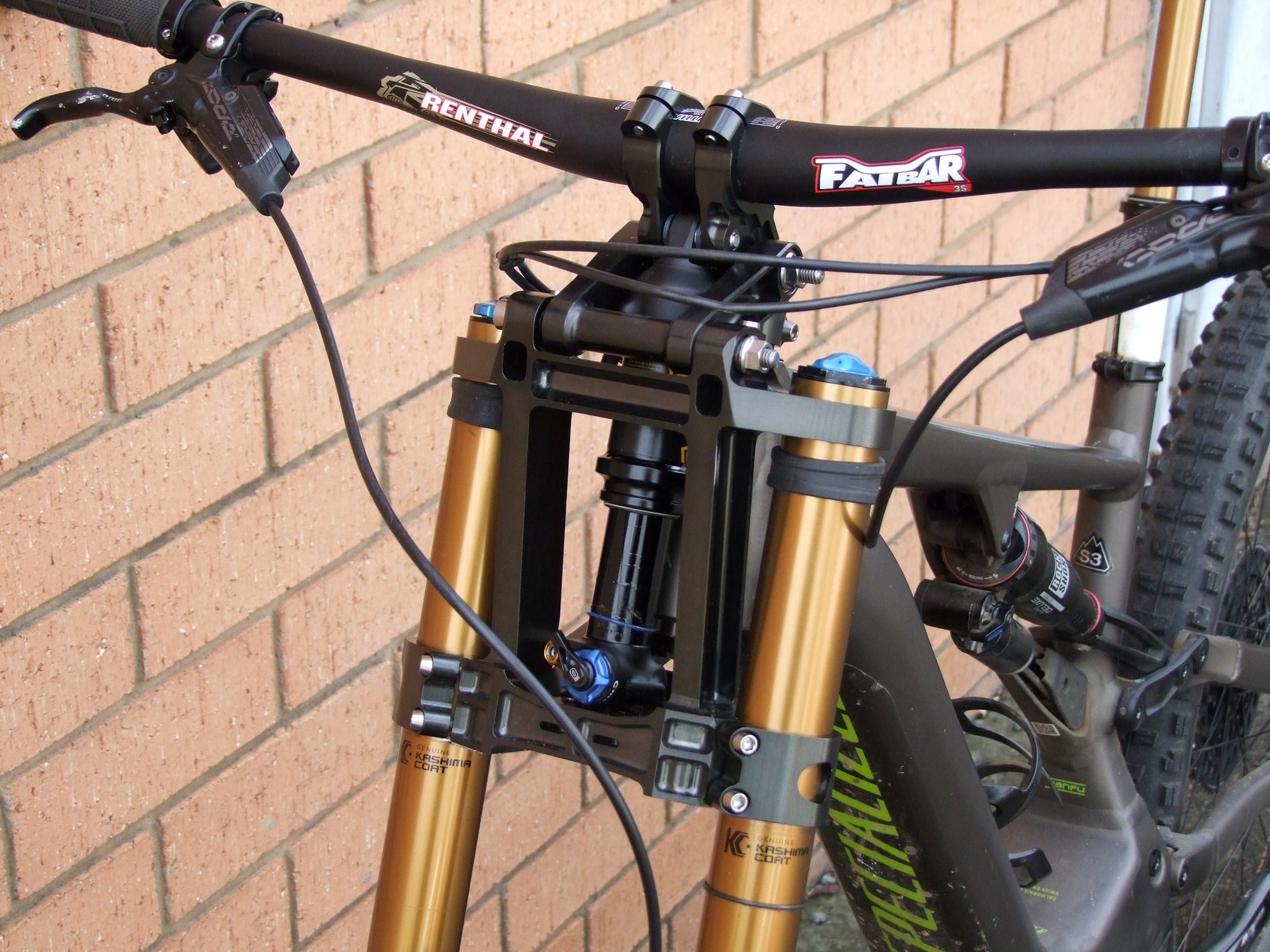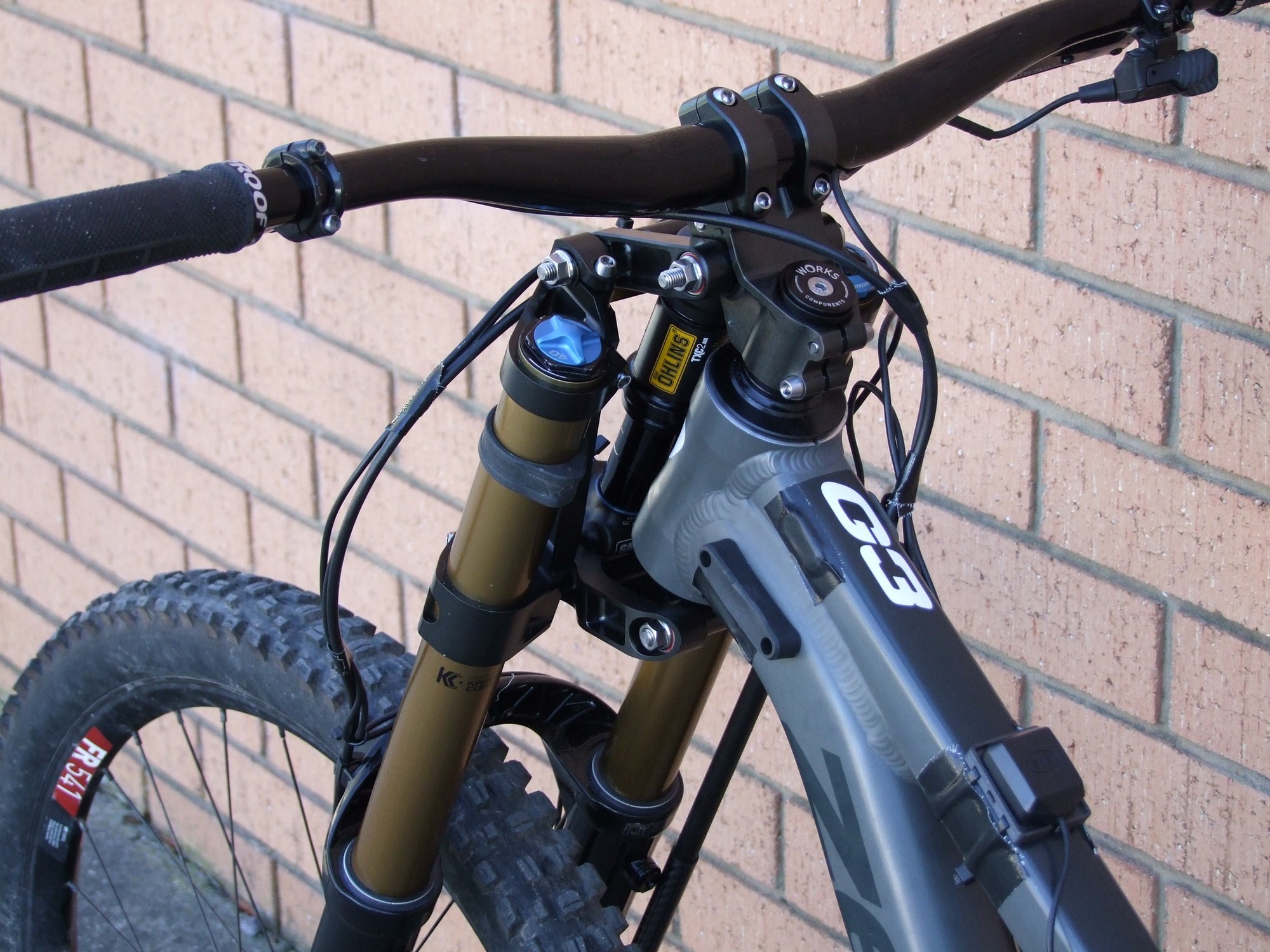 Однако Лоуренс улучшил идею и превратил её в кастомные короны для Fox 40, которые можно установить на вполне обычную вилку. Параллелограммный механизм добавляет 55мм хода. Работает всё это дело за счёт коротенького и лёгкого кантрийного амортизатора Ohlins TXC2 Air.