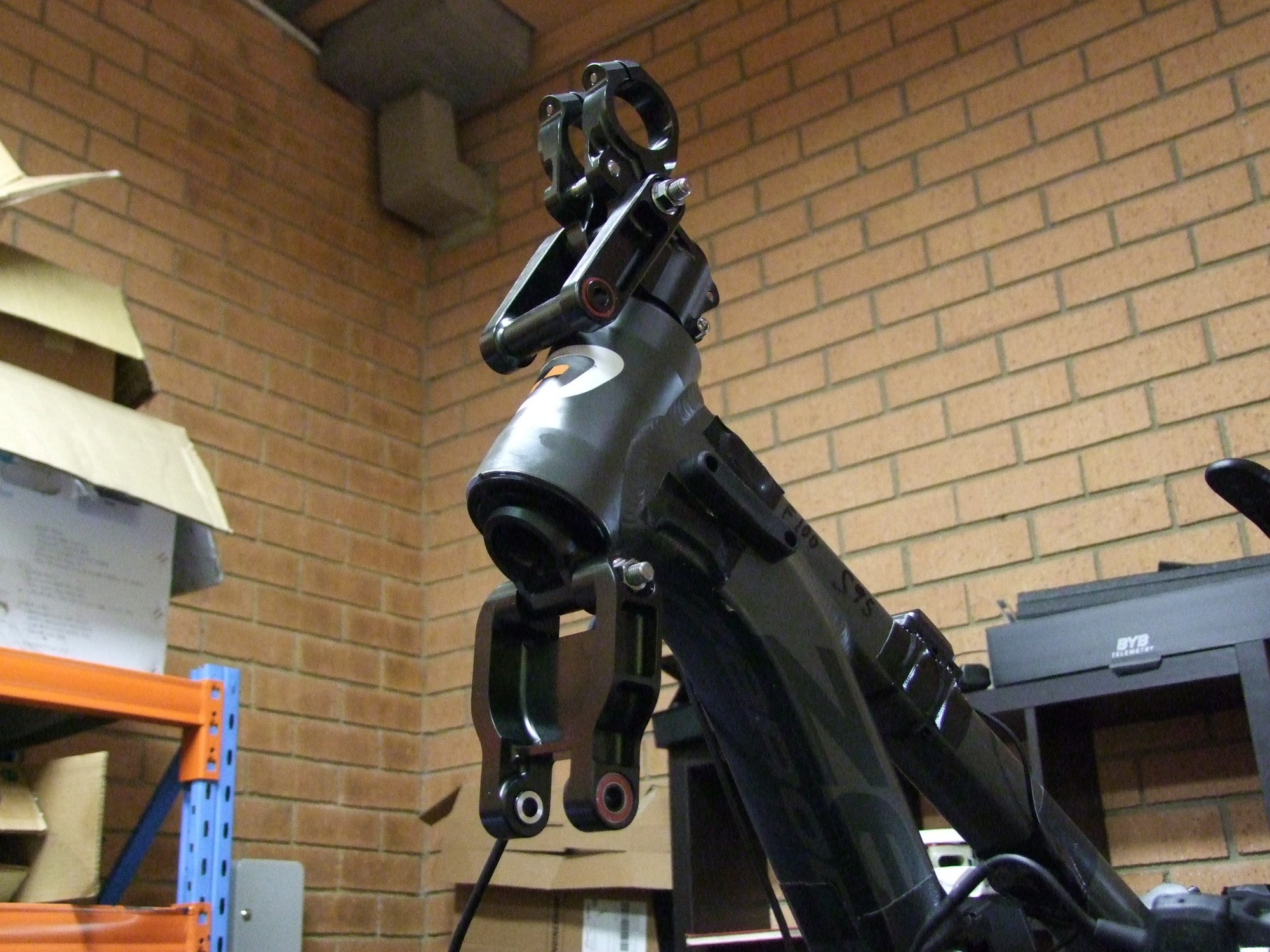 Сейчас у Лоуренса два велосипеда с вилкой такой конструкции. На даунхилльный Zerode G3 он повесил телеметрию BYB и проводит тесты. Вид достаточно сумрачный.