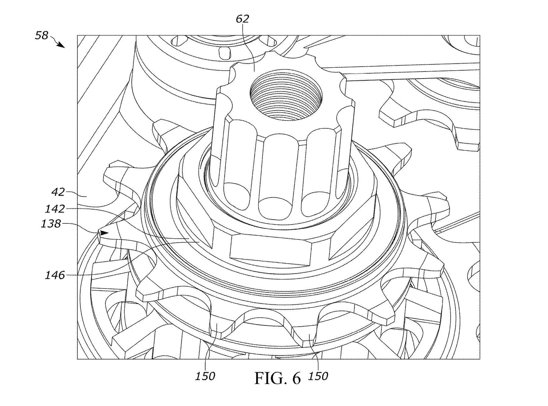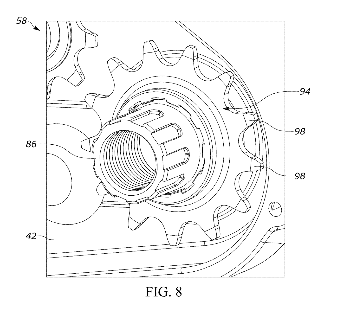 — Вид без внешней цепи и крышки, которая прикрывает внутренний механизм. Хорошо видно натяжитель для внутренней цепи (в патенте также упоминается возможность использовать вместо цепи ремень).