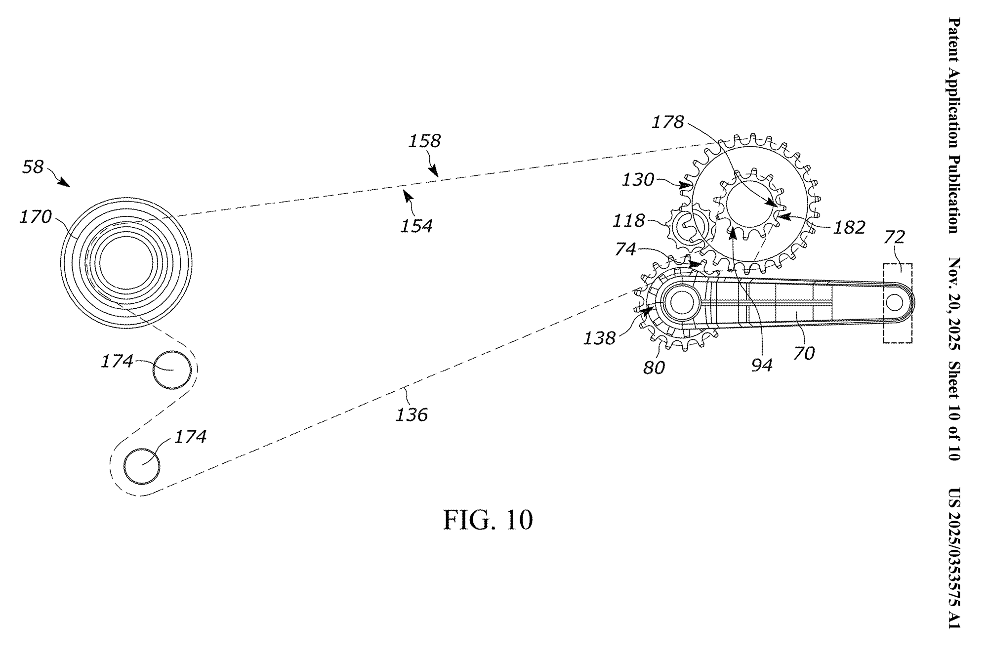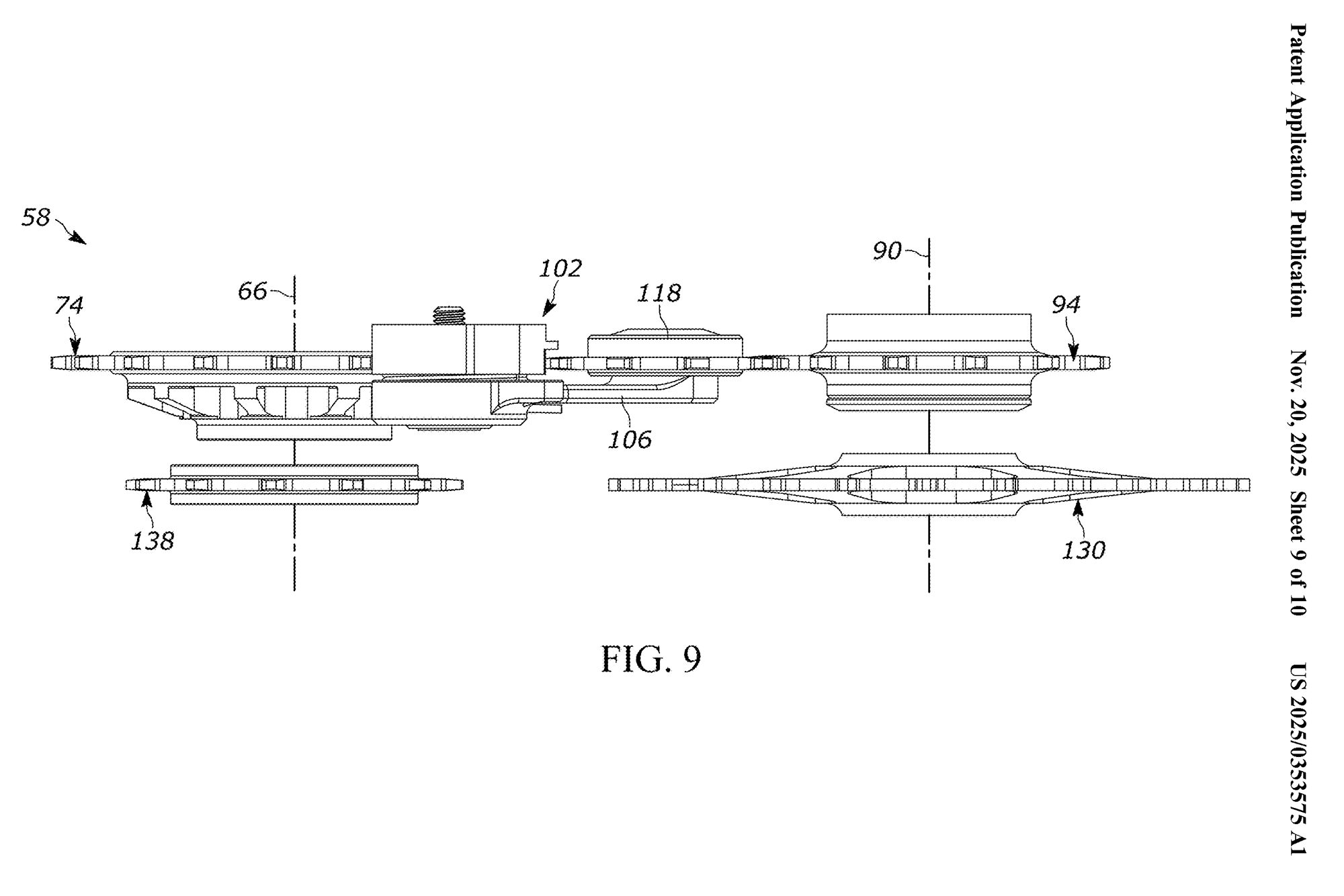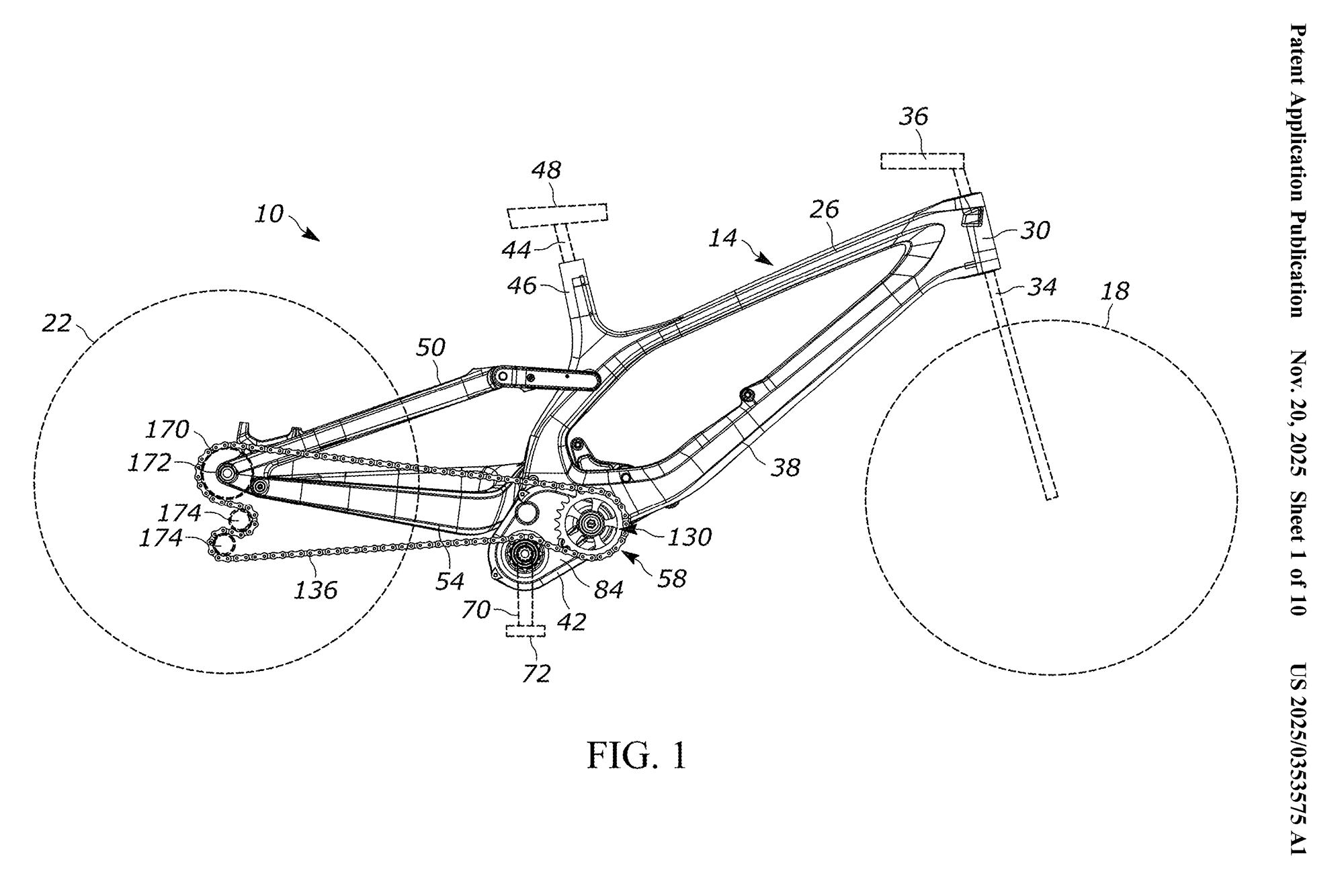 Как вы помните — осенью 2023 года Specialized запатентовали свою новую компоновку подвески UBB (under bottom bracket — под кареткой), которую мы могли лицезреть на прототипах новой Demo ещё с лета 2022. В феврале 2025 в сети появилась фотка новой компоновки прототипа Demo с какой-то странной коробкой в районе каретки, в которой сразу угадали наличие дополнительной цепи, которая передаёт усилия от шатунов на внешнюю ведущую звезду. Саму компоновку подвески обозвали OBB (over bottom bracket — над кареткой), так как теперь все тяги проходили уже над ней. Уже в августе выкатили карбоновую версию этой рамы и стало понятно, что именно таким в серию пойдёт новый Demo (формы для запекания карбона стоят конских денег, и даже очень богатый Specialized уже не делает прототипы таким образом). Теперь Specialized выкатили заявку на патент № US 2025/0353575 A1 от 20 ноября 2025 года с такой конструкции трансмиссии.