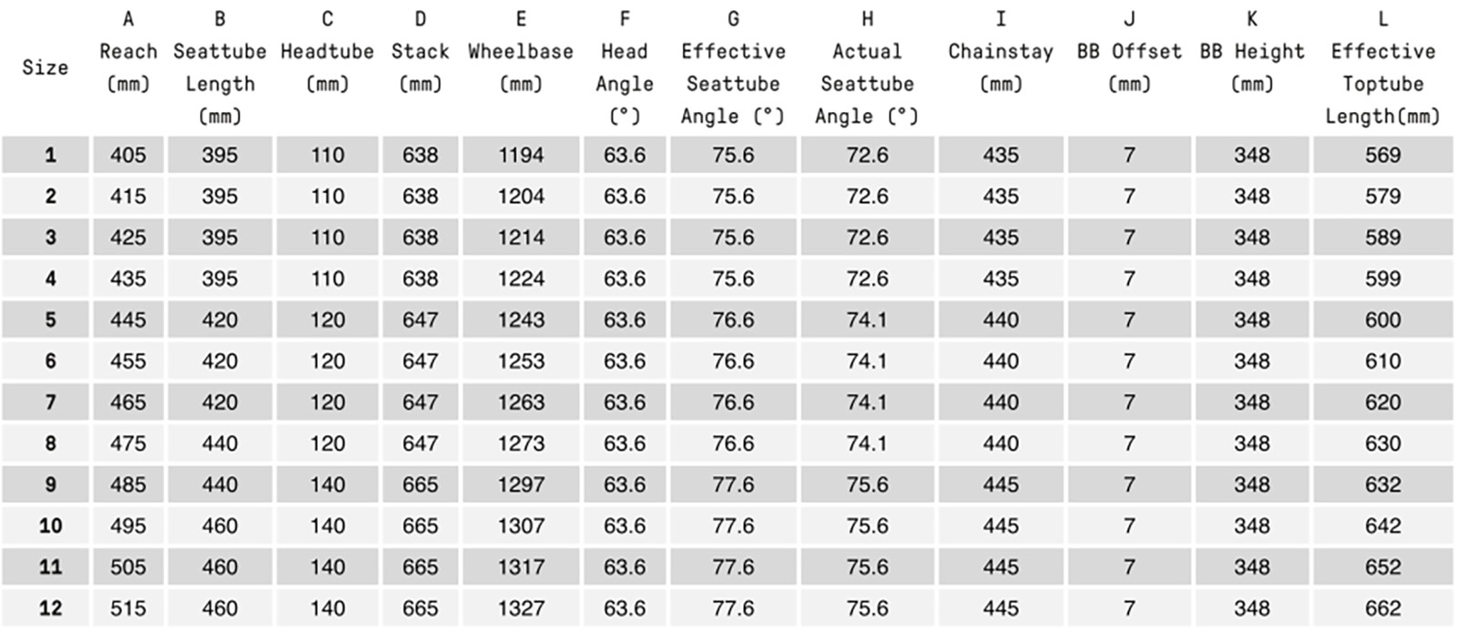 Как и у других алюминиевых моделей компании — рама представлена в 12 размерах. Их можно разделить на три основных группы, в которых по 4 версии рамы. Есть варианты с перьями 435, 440 и 445мм, а также углом подседела 75.6, 76.6 и 77.6°.