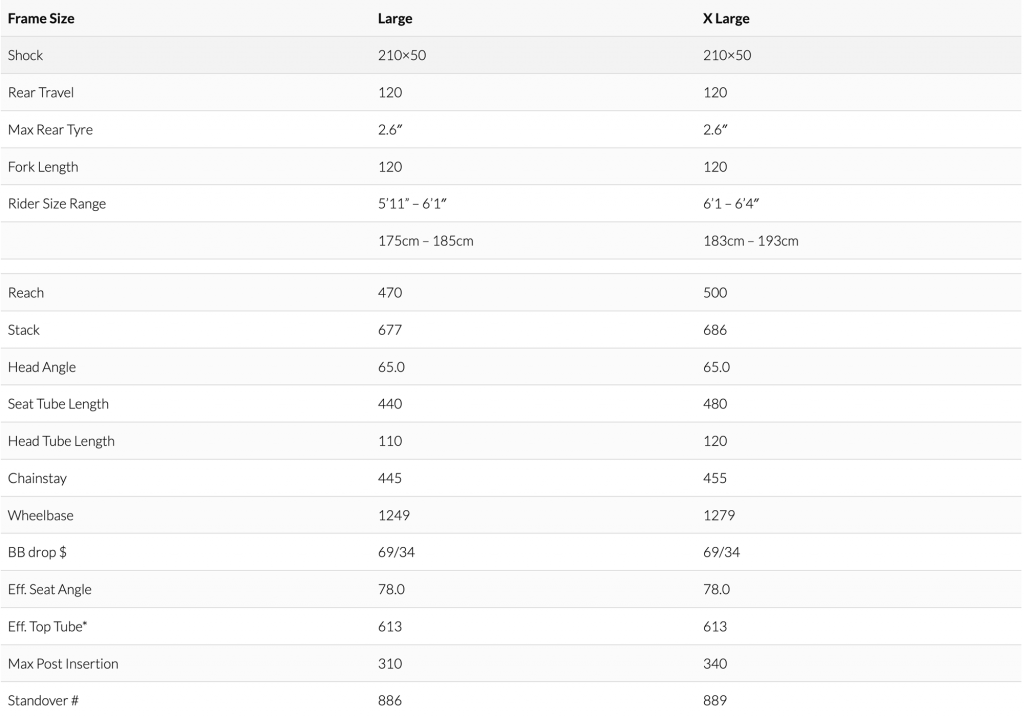Учитывая изменения в переднем треугольнике и увеличенное переднее колесо — рама едва ли будет пользоваться спросом у не очень рослых райдеров, так что размеров всего два. Оба размера имеют длину перьев 445мм, а колесная база не очень уж и большая по современным меркам даже для найнеров — 1249 и 1279мм. Угол рулевой 65°, угол подседела 78°. Дроп каретки у рамы получился 69мм относительно передней оси и 34мм относительно задней. Спереди 120мм вилка с расстоянием от оси до короны 571мм.
