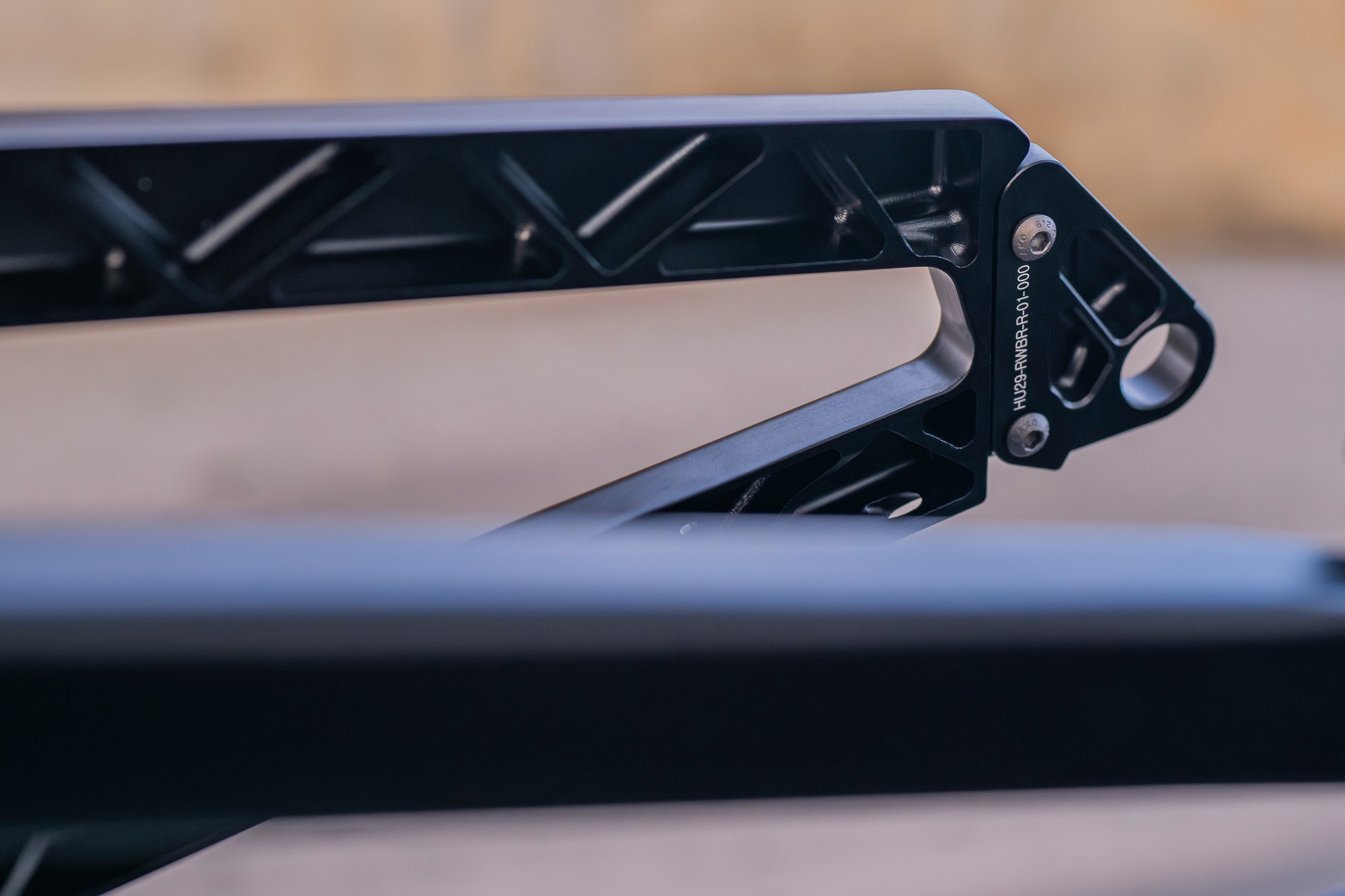 Как и ожидалось — рама не карбоновая, а сделана путём фрезеровки из брусов алюминия, которые скручивают и склеивают вместе. Обратите внимание на усиления у подседельной «трубы» и на перьях. Передний и задний треугольник соединяются двумя линками, вращающимися вместе в одном направлении. Через верхний линк усилие передаётся на амортизатор. Схема подвески идентична последним итерациям легендарной Turner DHR.