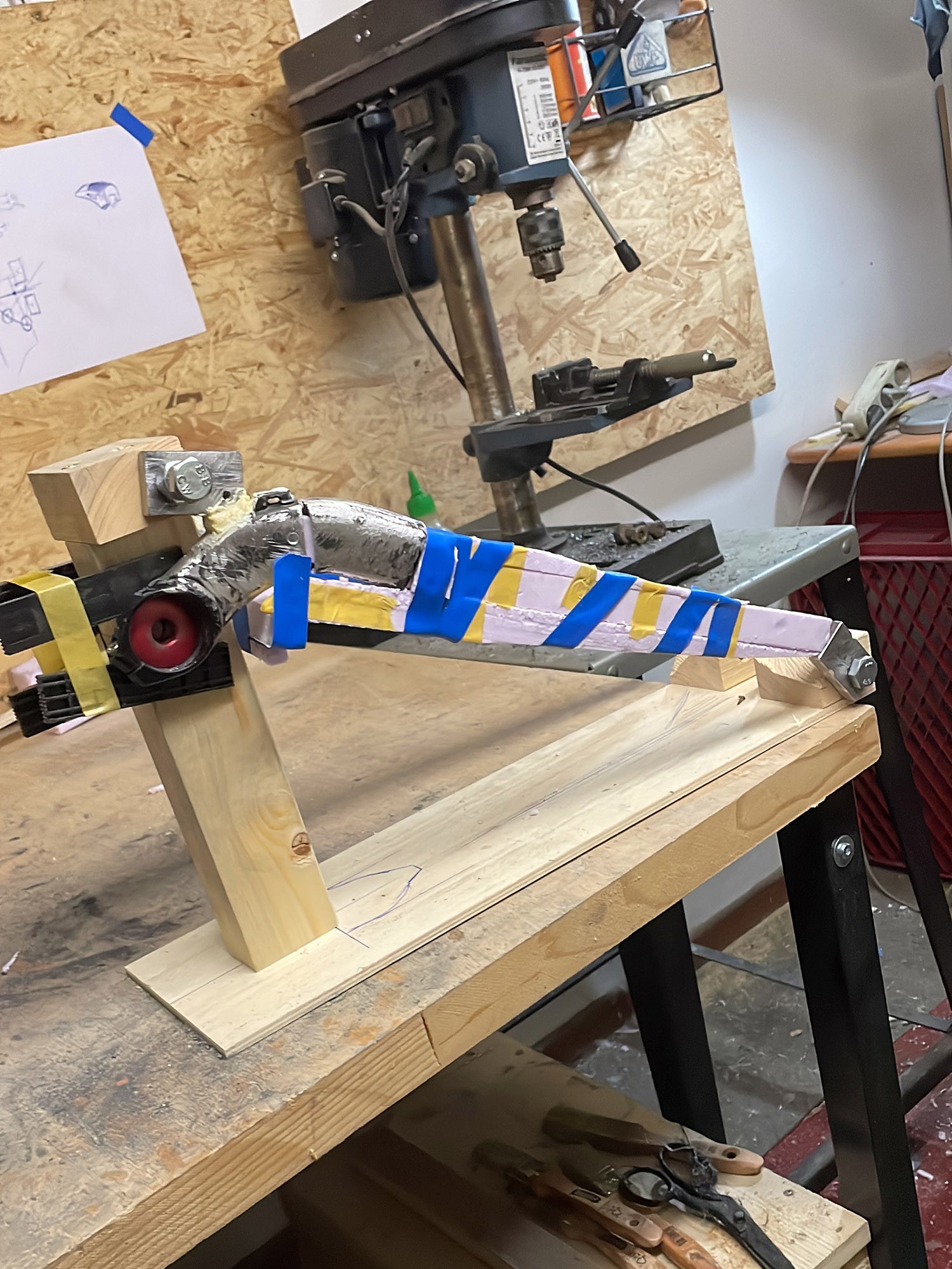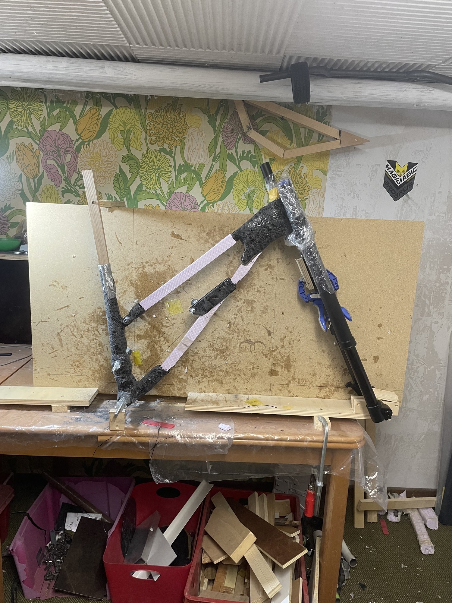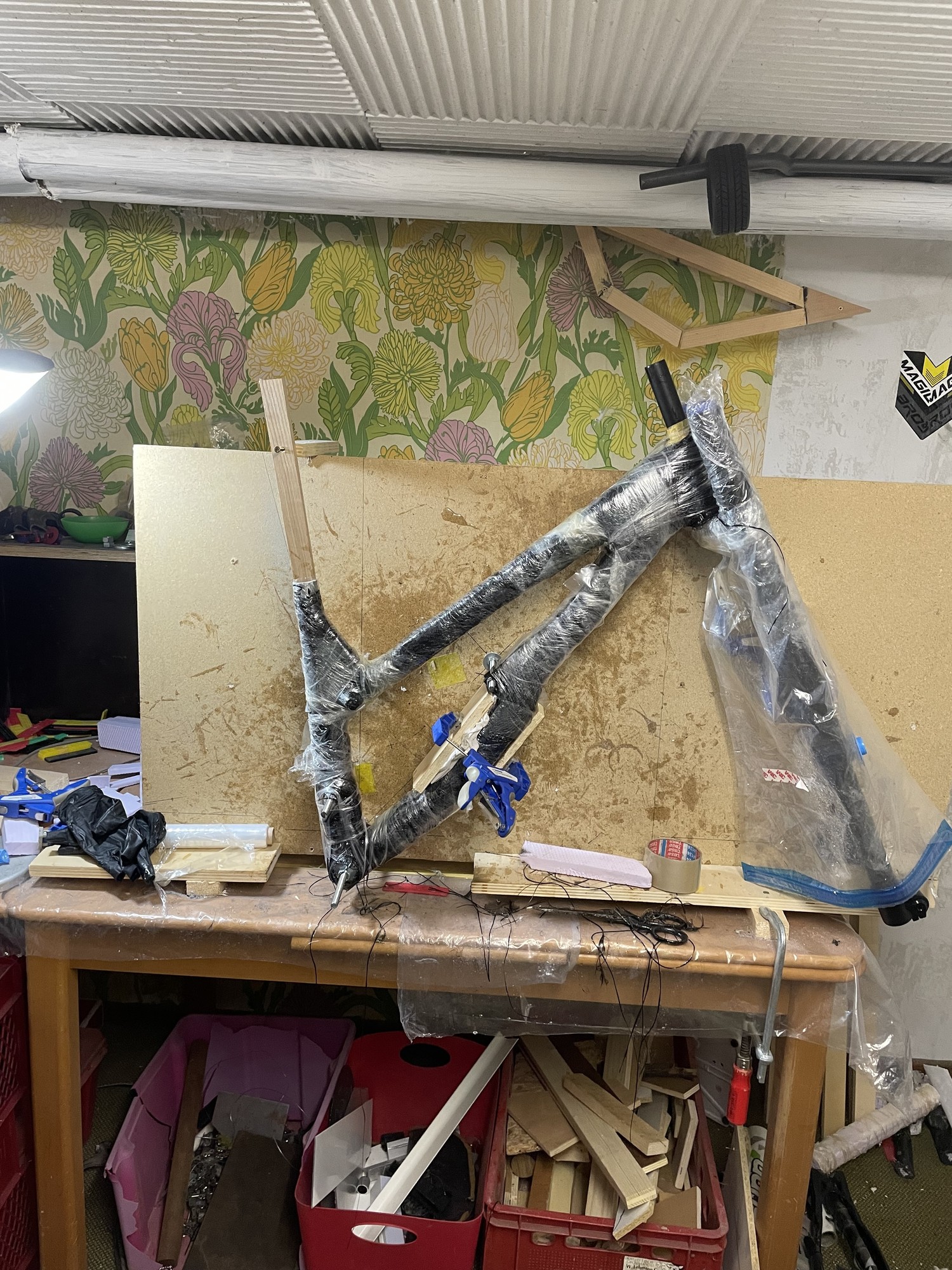 Остальные части рамы были изготовлены отдельно. Во все нужные места были вклеены металлические вставки с подшипниками, резьбой и т.д. Я выбрал этот метод, чтобы гарантировать надлежащие допуски. После этого я поместил все детали в свой стапель и придал форму и соединил оставшуюся часть рамы с помощью пенопласта. Это позволило мне наносить слои карбона вручную и сжимать их с помощью стрейч-пленки. Для создания еще большего давления я иногда обматывал раму велосипедной камерой и накачивал ее для равномерного сжатия.