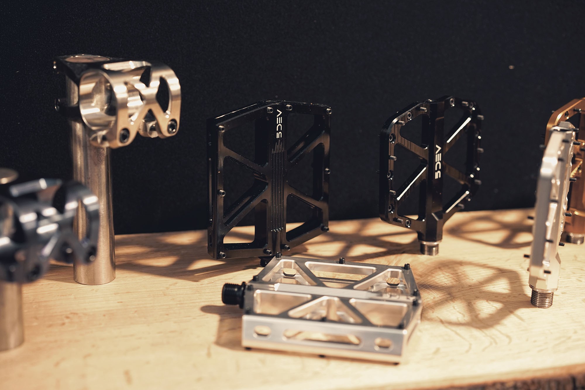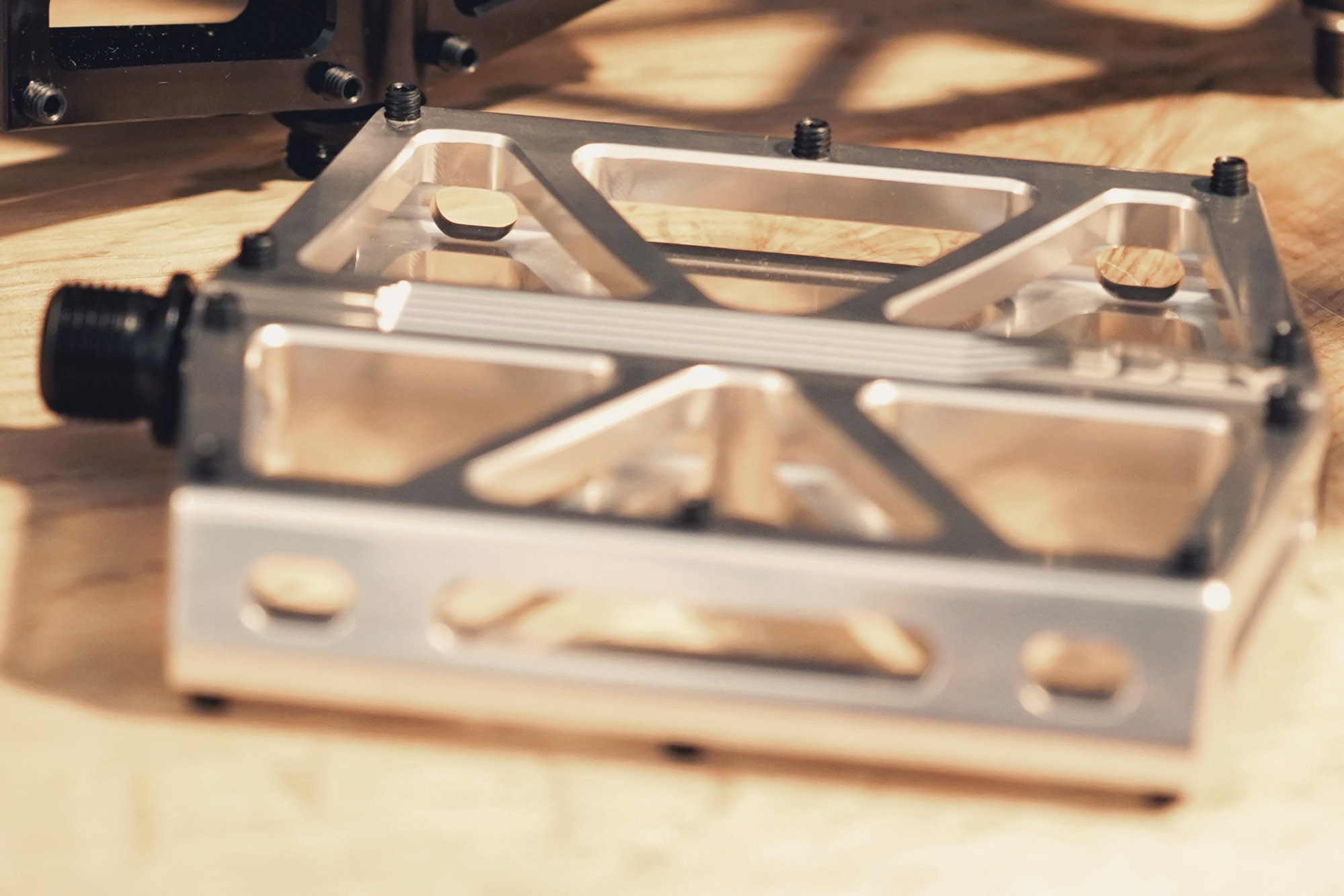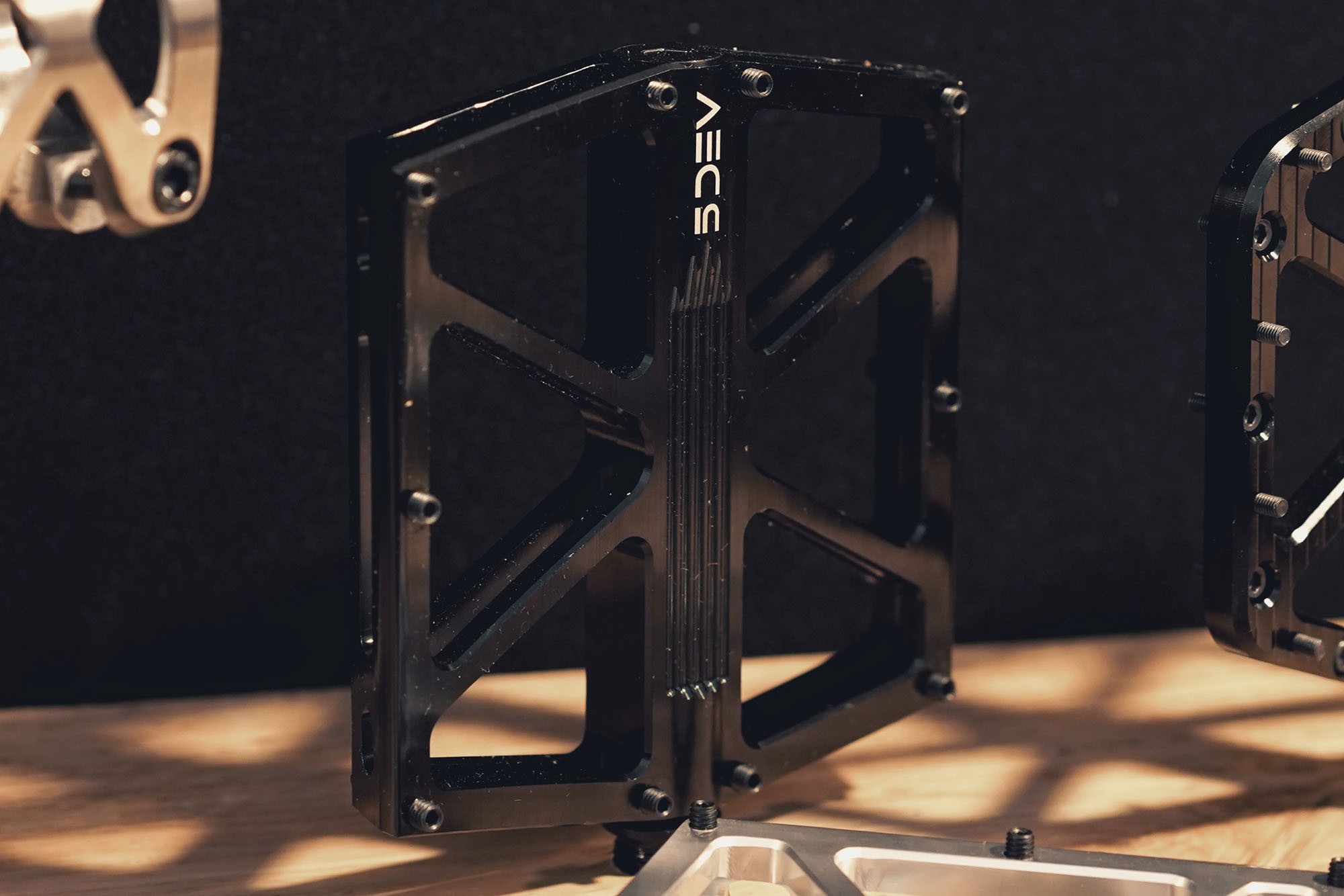 Пока в линейке компании представлены только модели педалей All Around и Trail/Enduro, у которых платформа абсолютно плоская, а шипы вкручиваются насквозь. Но на стенде компании было две версии новой педали, в RAW-расцветке и с чёрной анодировкой. На обеих лазером нанесли надпись 5Dev. Каждая педаль имеет 10 регулируемых шипов на сторону. Очевидно, вкручиваются шипы со стороны платформы, а сами платформы имеют более традиционный, «рамный» вид.