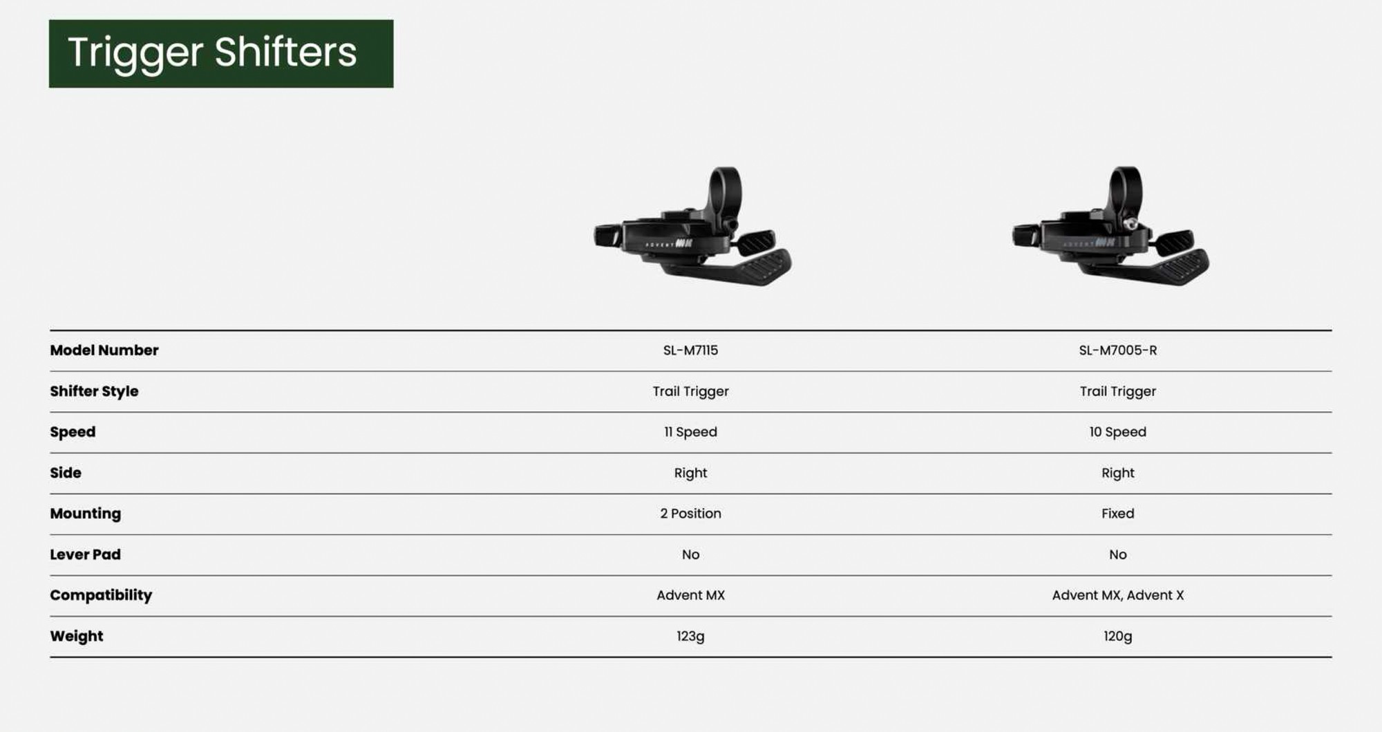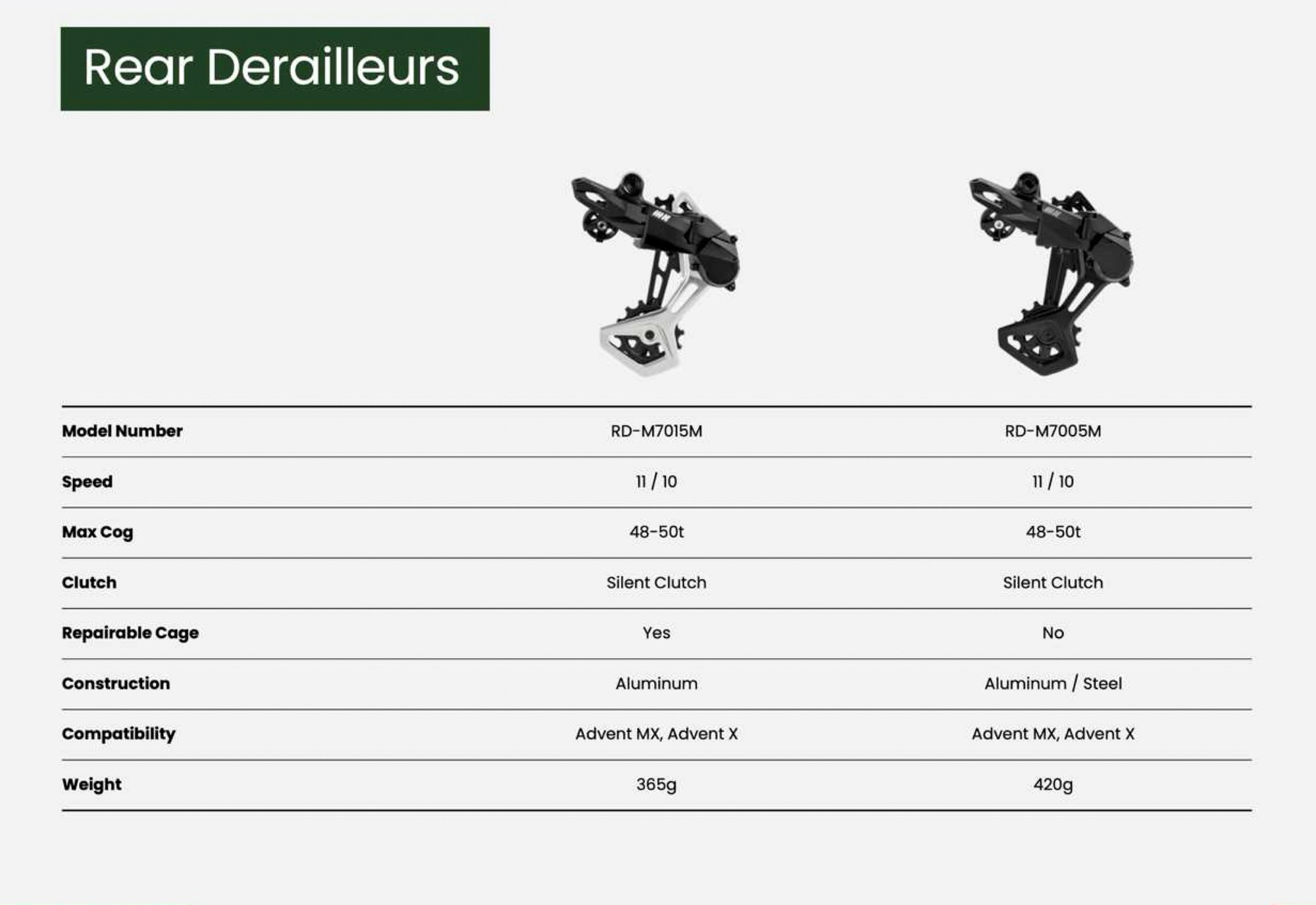 По утверждению производителя — это самая надежная линейка компонентов для MTB от Microshift на сегодняшний день. Она должна прослужить в 6 раз дольше, чем более бюджетная линейка Advent X, представленная 5 лет назад. В линейке есть два переключателя: RD-M7015M это «PRO-версия», а RD-M7005M это версия попроще. Оба оснащены одинаковой фрикционной муфтой, но у pro-версии чуть больше алюминиевых деталей и заявлена ремонтопригодность. Визуально отличить их очень просто, более дорогая версия оснащена алюминиевой лапкой. Обе версии работают как с 10, так и с 11-скоростными трансмиссиями. Старшая версия имеет ремонтопригодную рамку.