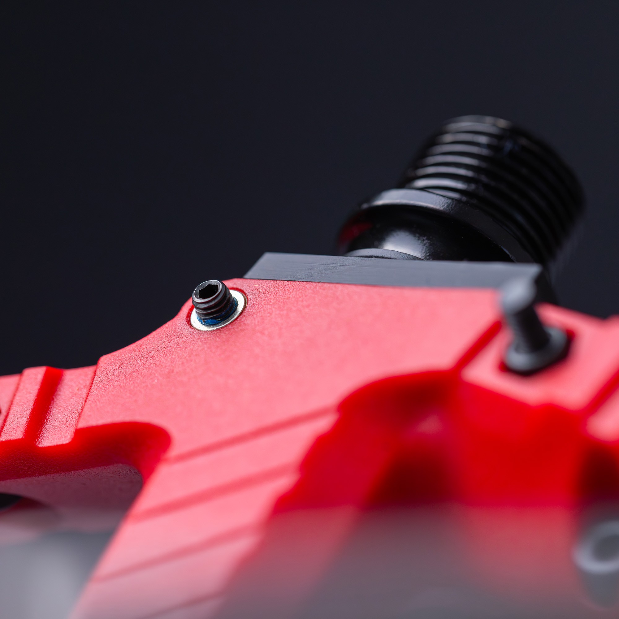 Во-первых: хромолевая ось и ротационный механизм идентичны со старшей версией педали. На каждой педали у шатуна есть винт, которым можно регулировать преднагрузку на специальную втулку и она будет тормозить вращение корпуса педали вокруг оси. Нужна эта штука для тех, кто не боится делать трюки со снятием ног с педалей. Подробнее о том, как устроен механизм можно посмотреть на взрыв-схеме в предыдущем посте. Во-вторых: платформа также шире у шатуна и сужается ближе к внешней стороны педали. Говорят, это помогает с эргономикой. Винт в центре платформы помогает фиксировать её на оси.