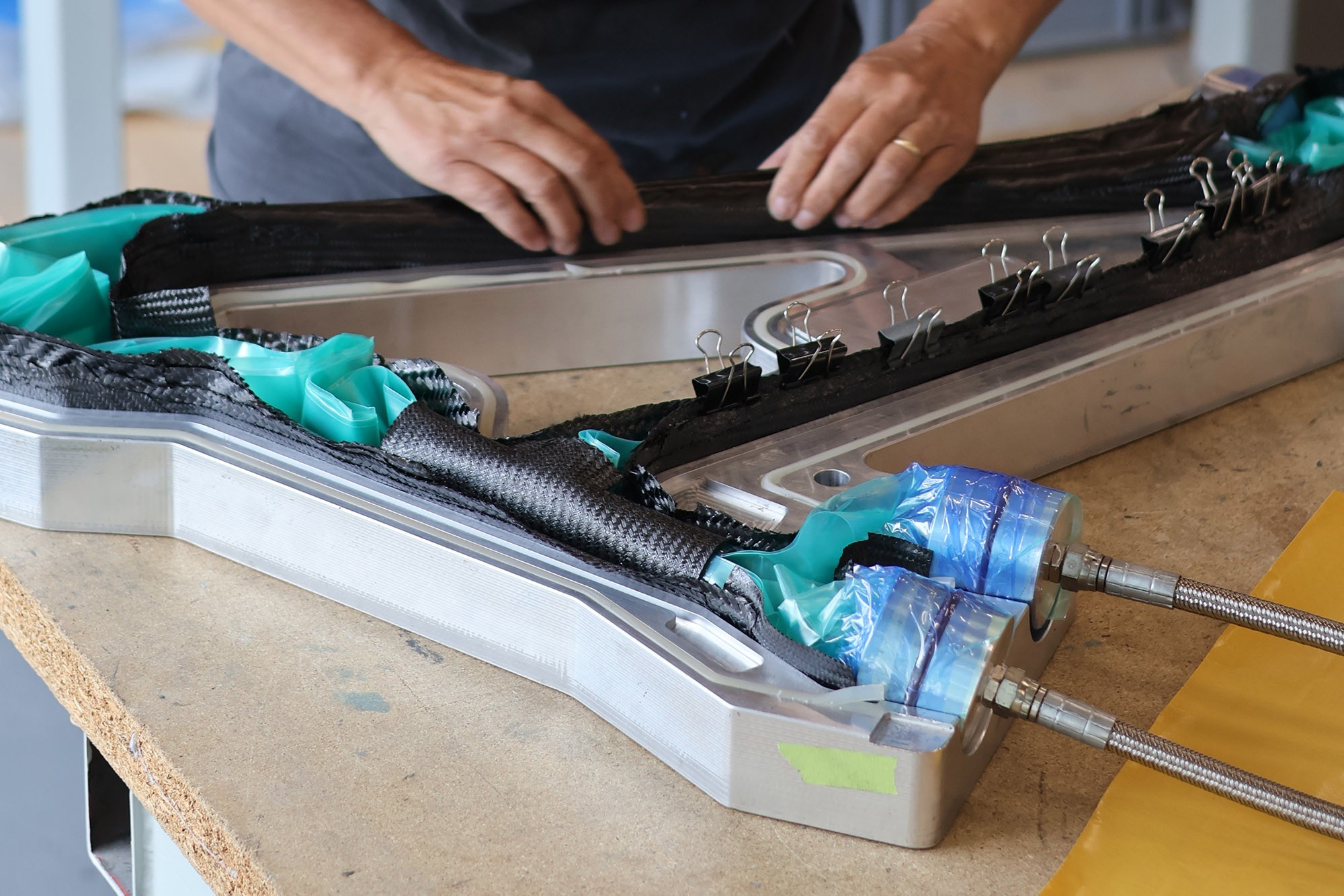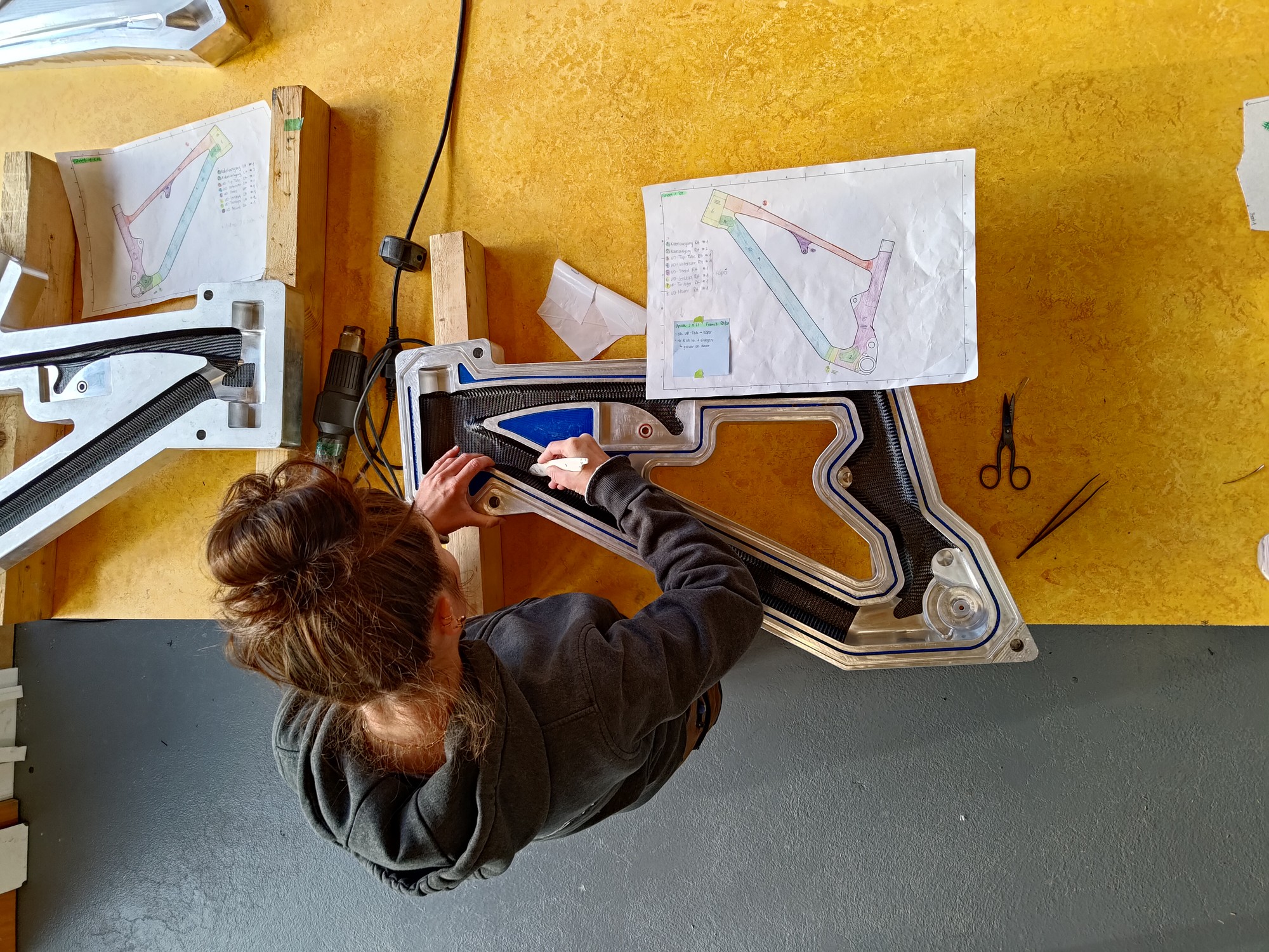 Но с тех пор Gamux полностью окунулись в создание даунхилльных повозок, так что дальше прототипа дело не ушло. Тогда байк заприметил другой швейцарец — Роман из Brasch Design Composites. Его компания уже несколько лет занимается композитными материалами, так что успела накопить значительный опыт в изготовлении пресс-форм и ламинированных конструкций. Карбоновые рамы других производителей неоднократно попадали в головной офис компании на ремонт и были обнаружены существенные различия между собственными производственными стандартами и качеством дефектных рам других производителей. Так что вдохновившись прототипом Gamux команда взялась за собственный проект. Пресс-формы рамы создаются на собственном фрезерном станке, а карбоновые препреги обрабатываются вручную.