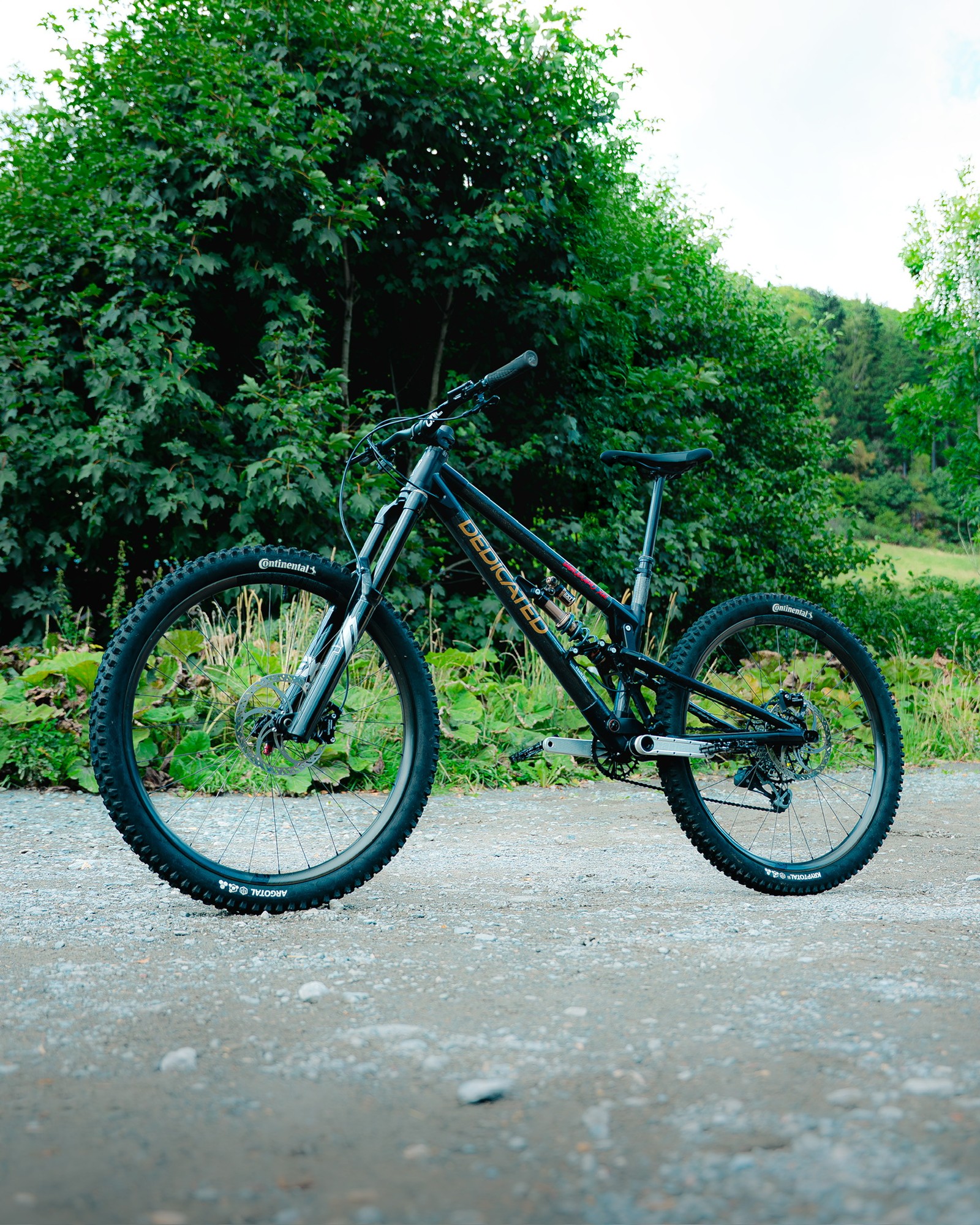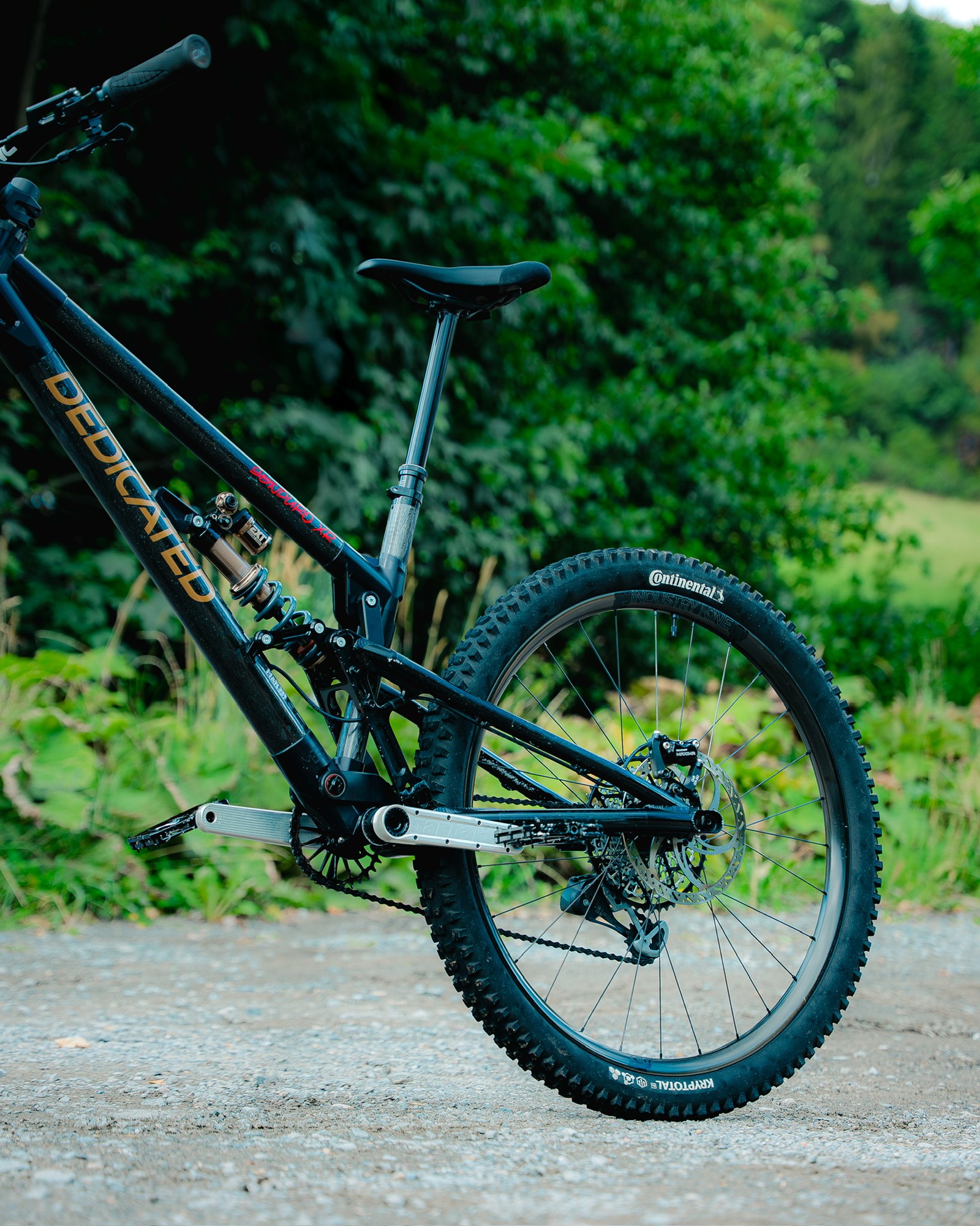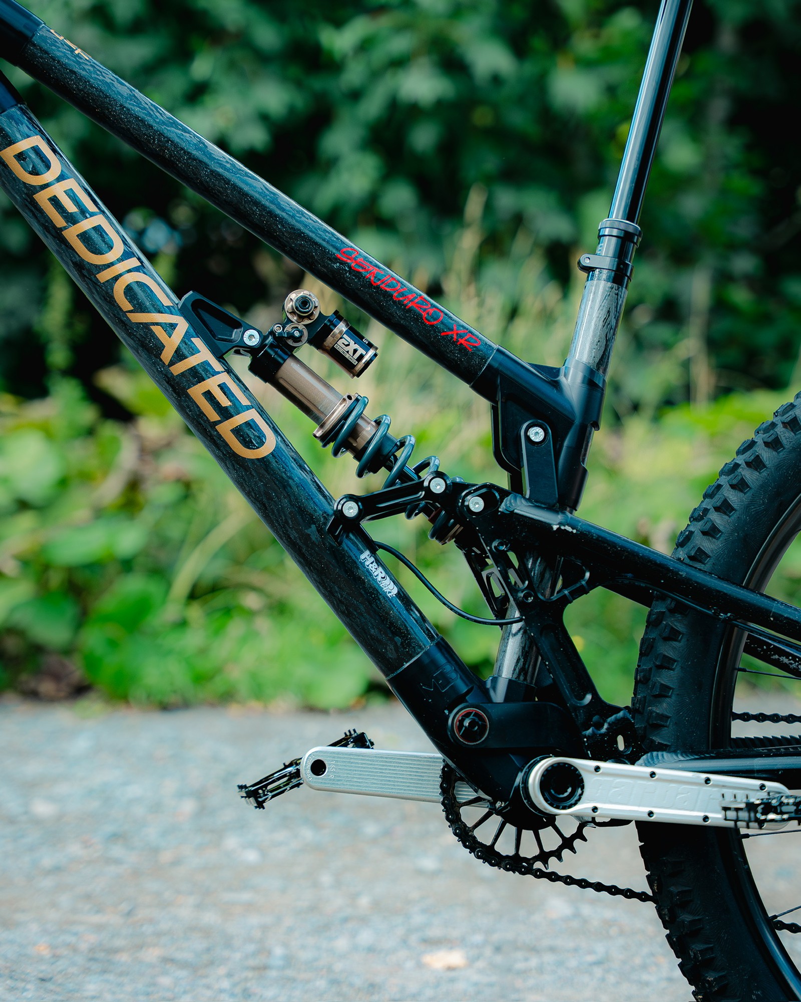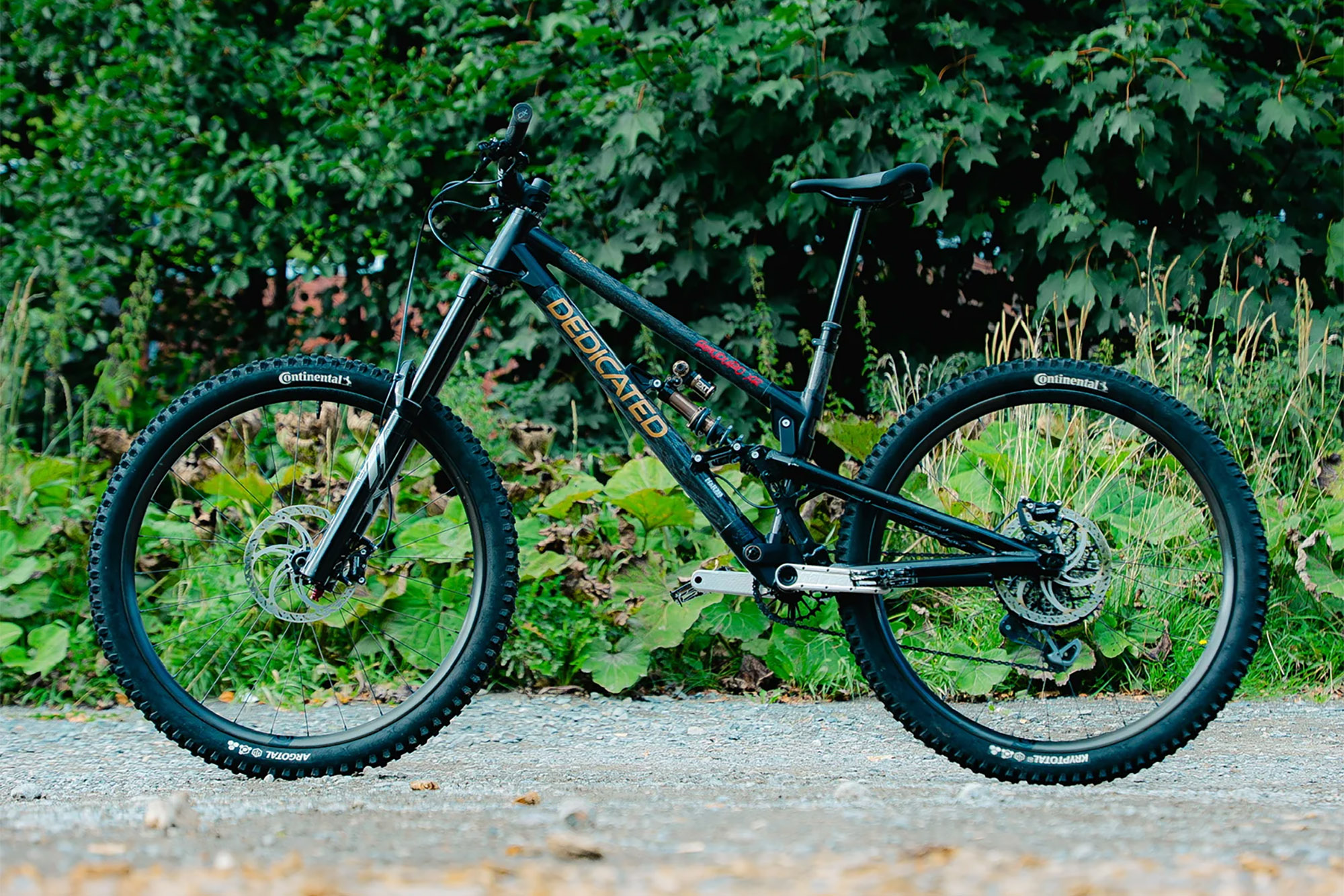 Ход подвески в версии от Dedicated также от 170 до 190мм. РАма может быть как маллетом, так и найнером. Конструкция подвески идентична оригиналу от Reichmann. Только материалы рамы отличаются. У Reichmann всё было алюминиевое, а у Dedicated алюминиевым остались только перья. Передний треугольник же выполнен путём вклеивания труб из карбона Т700 в фрезерованные из алюминия 6082 узлы. Вес рамы получается где-то 3.8кг.