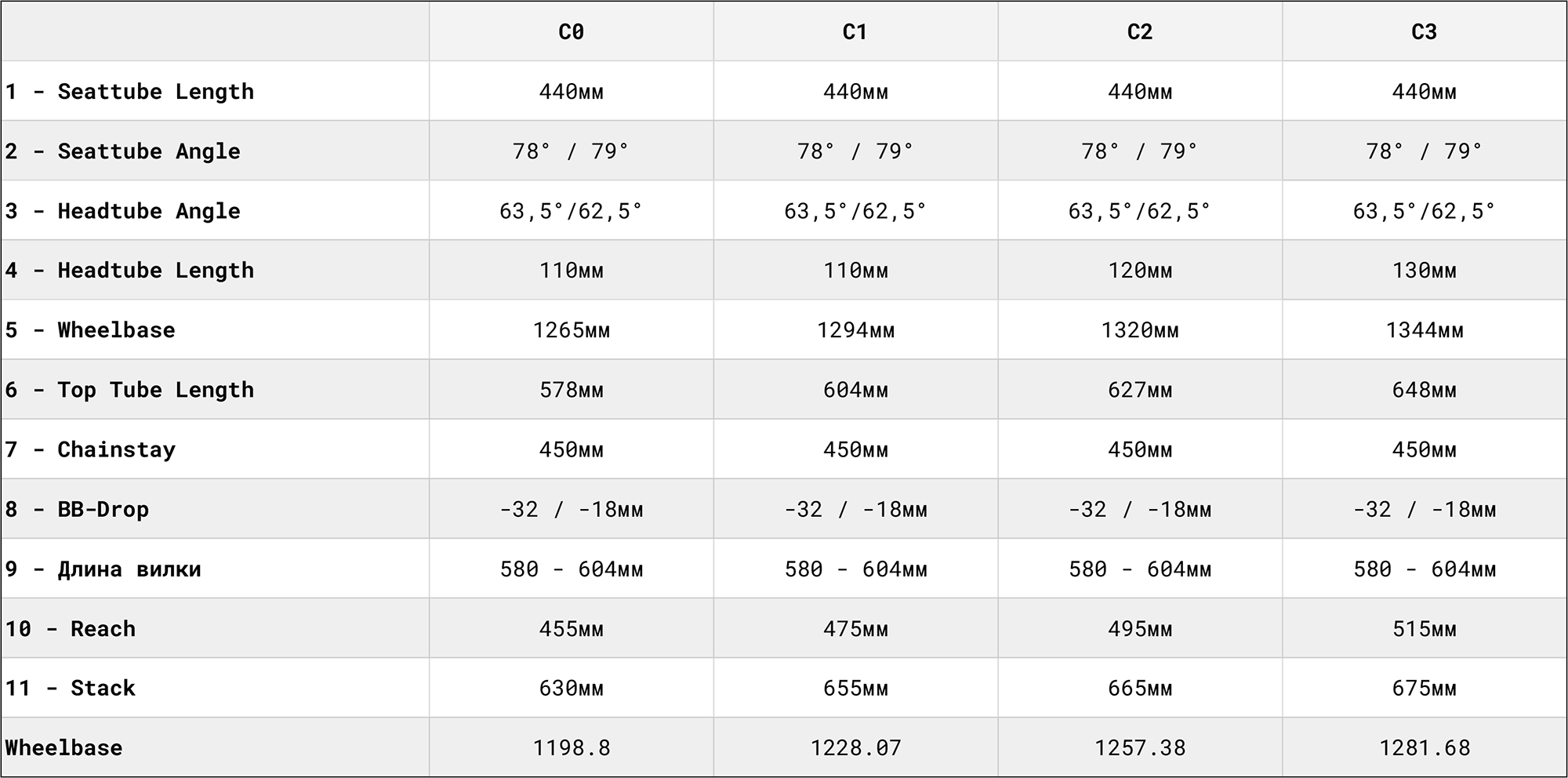 Угол рулевой 63.5°, по запросу доступны задние перья с длиной 460мм.
