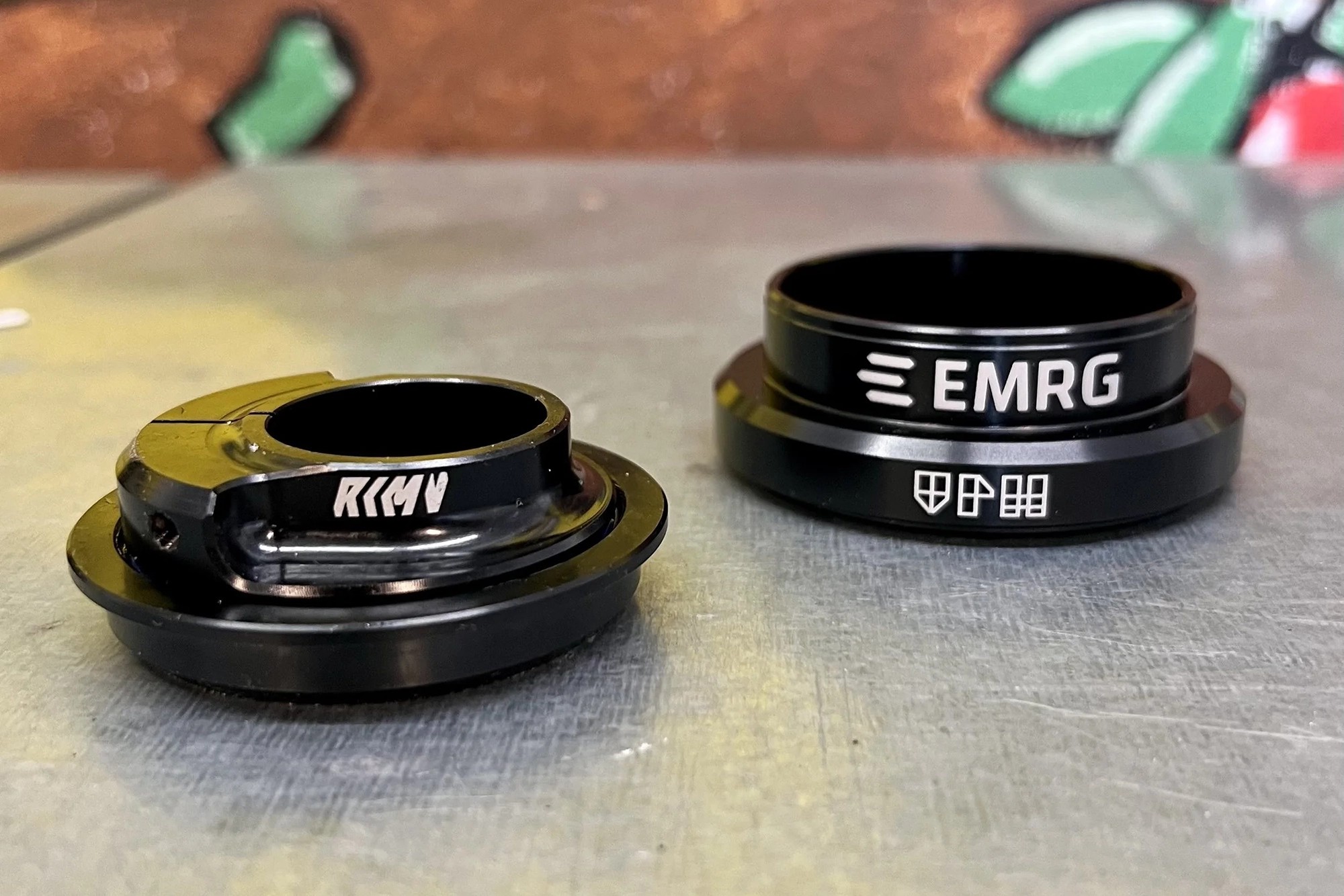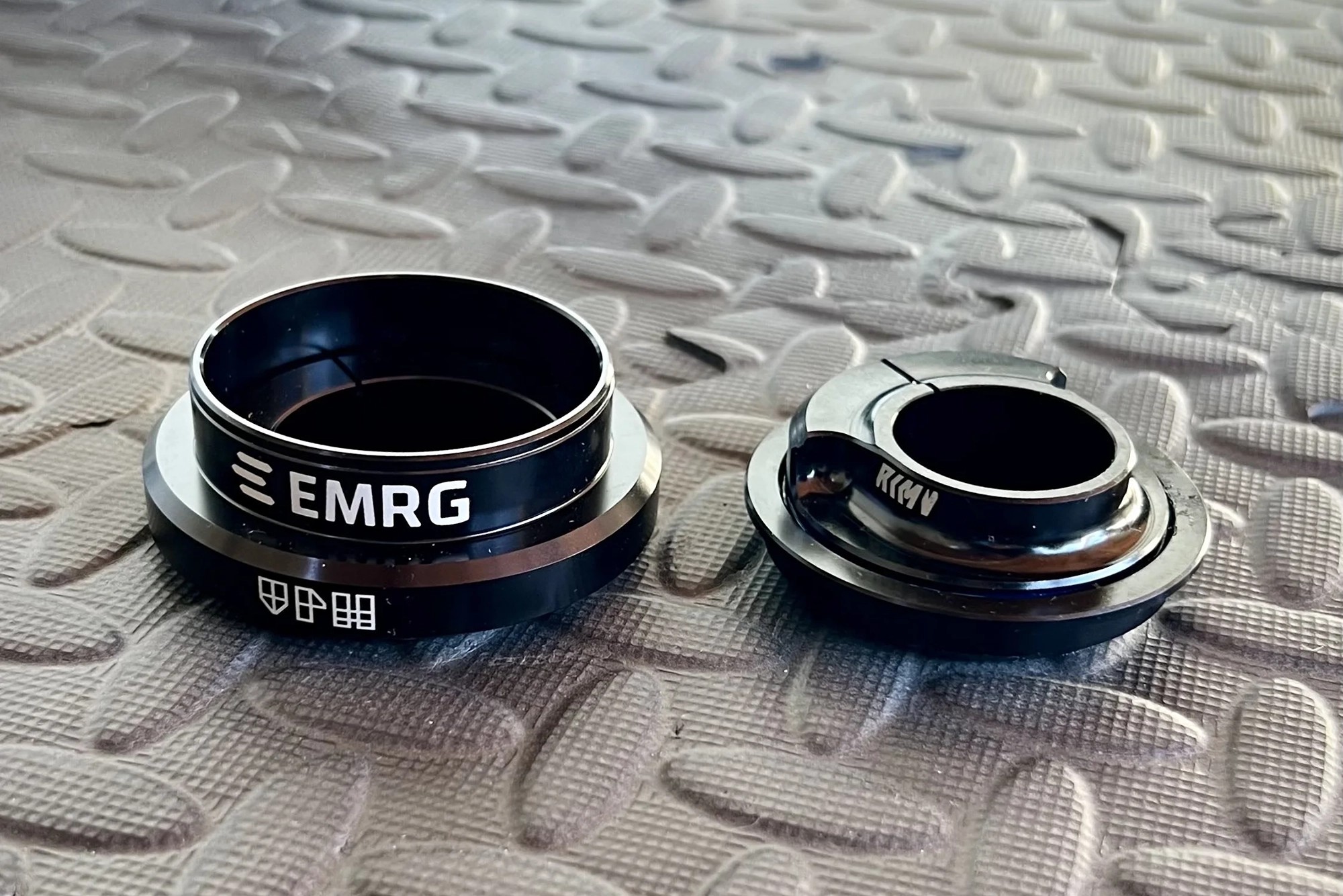 EMRG — детище Маттиаса Райхманна (Matthias Reichmann) из Reichmann Engineering, автора оригинального Senduro. Рулевая VPH (от Virtual Pivot Headset) меняет оффсет вилки (и рич с длинной выноса тоже) на 4мм за счет использования эксцентриковых вставок. Логика такая же, как и с регулировкой рича чашками рулевой, только здесь смещение сделано не на чашке рулевой, а на проставке между подшипником и штоком вилки. Подшипники остаются увеличенного размера и чашки «обычные», только сами вставки со смещением.