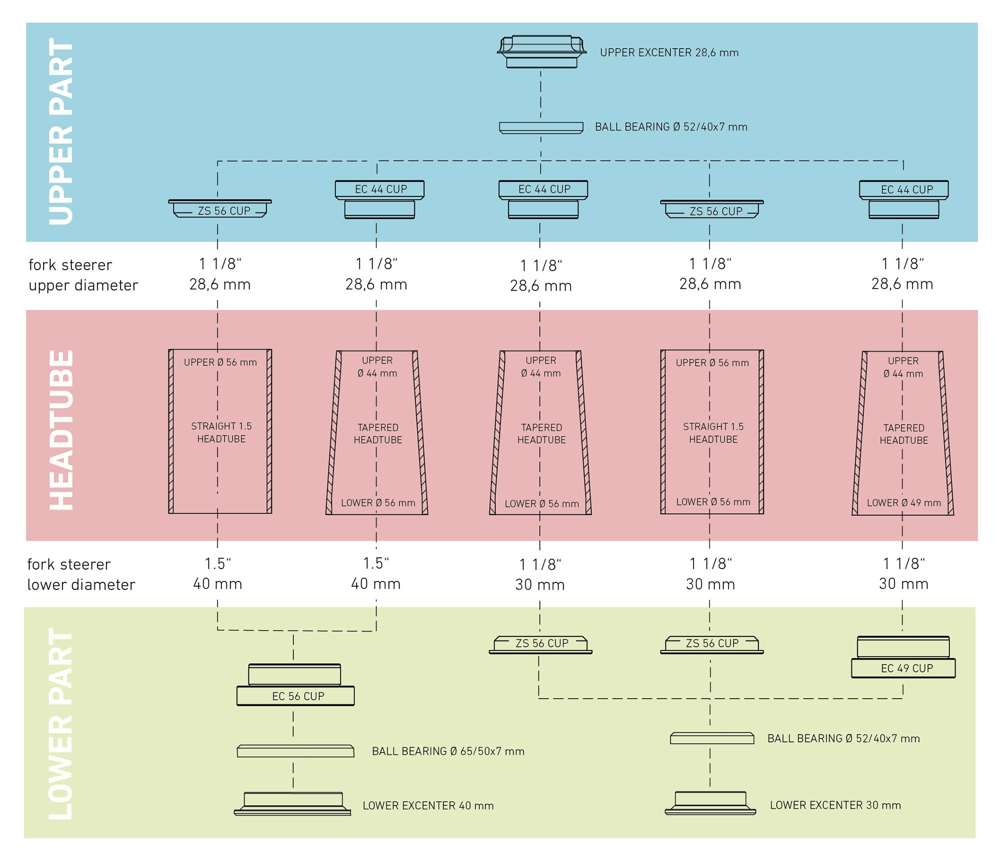 Чашки и вставки фрезеруют из алю 6061-T6, болтики титановые, подшипники Enduro. Рулевая работает со стандартным 1.1/8 и конусным 1.1/8-1.5" штоком.