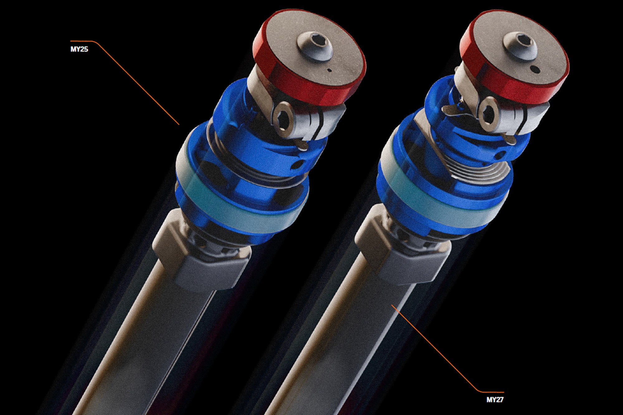 Как и у амортизаторов — демпфер Grip X2 получил обновления поршня и шимстека. Шимстек отскока больше не круглый, а обрезан по краям, что обеспечивает более прямой путь масла к новому поршню среднего клапана с увеличенными каналами. При проезде неровностей масло легче проходит через основной поршень, повышая чувствительность. Также появилась новая пластина VVC, которая улучшает поток масла и обеспечивает более равномерные шаги демпфирования между каждым щелчком высоко-скоростного отскока. Контур компрессии получил новую систему клапанов с немного более жестким демпфированием, чтобы соответствовать снижению трения благодаря новой пневматической пружине и штанам. Как и прежде, снаружи четыре регулировки (LSC, HSC, LSR, HSR) с тем же количеством кликов: 8 для высоко-скоростной компрессии и отскока, 16 для низко-скоростной компрессии и отскока.