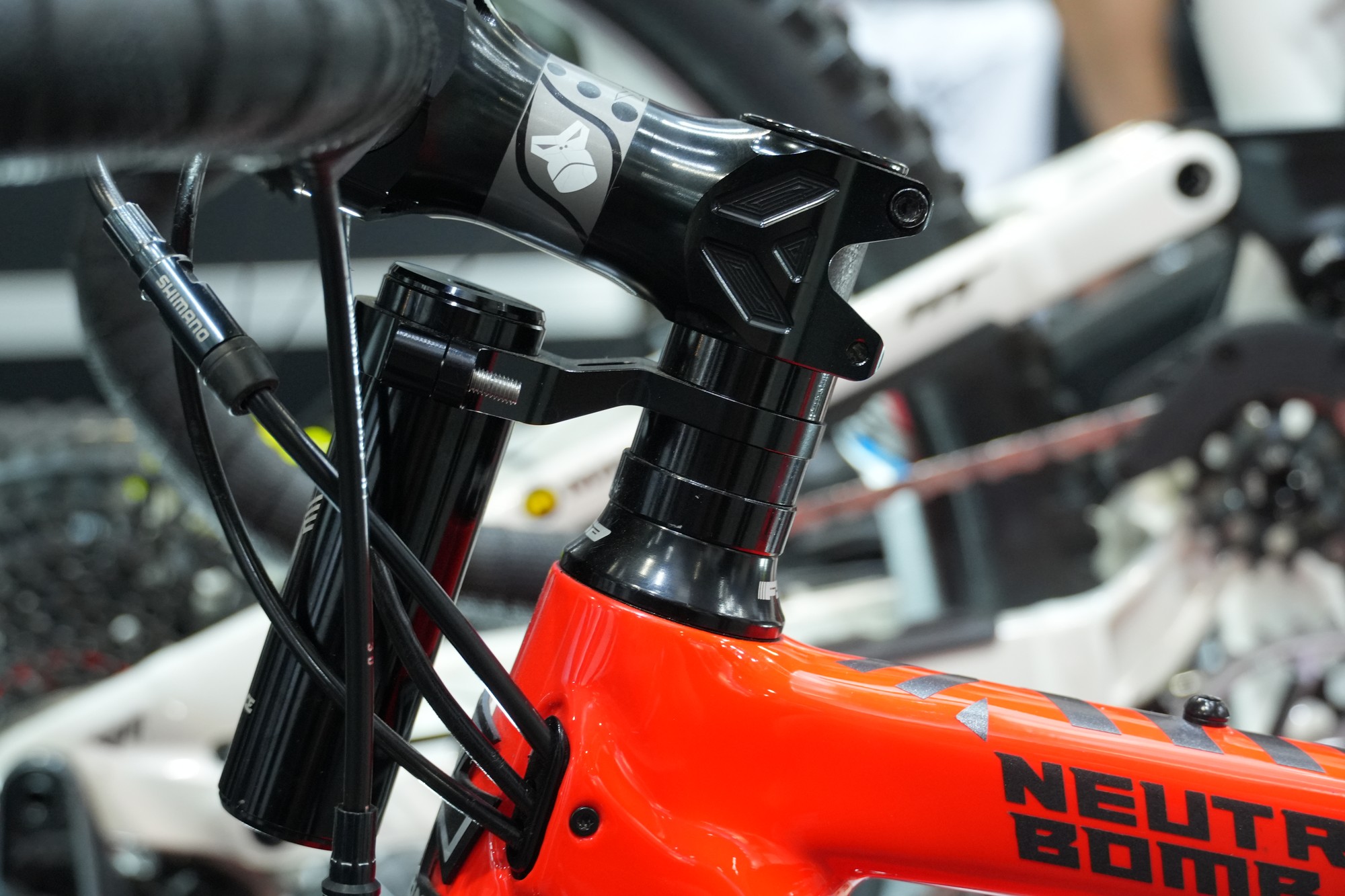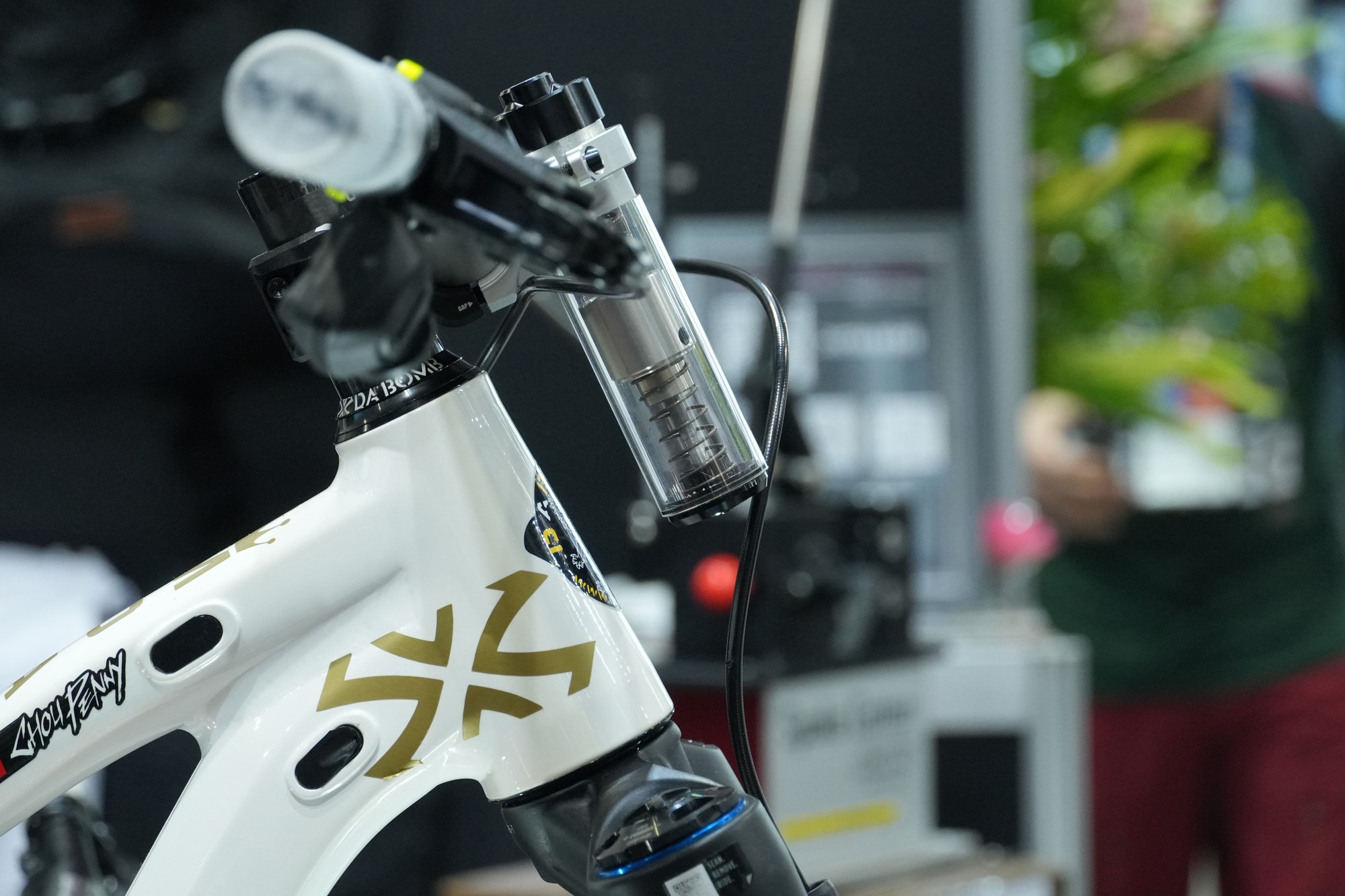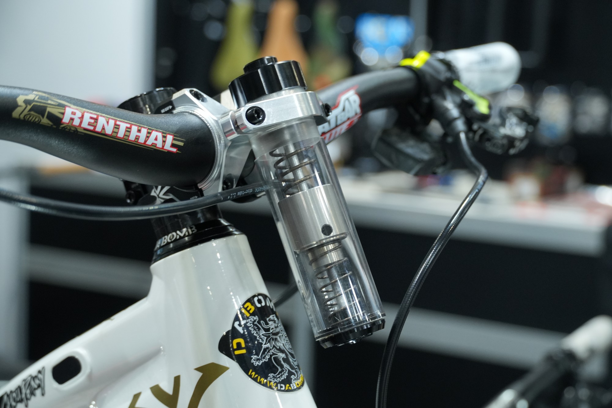 За новости и хорошие фото интересностей благодарим редактора пинкбайка Джесси-Мей Морган. В боксах DaBomb ей удалось сфотографировать необычную железку. Если вы сразу не поняли что же это такое — это вынос, а спереди у него крепление для массового демпфера! Причём демпфер у них свой собственный. На фото прототип с плексигласовым корпусом, чтобы можно было понять устройство и визуально оценить работу. Желающие могут наведаться на страничку DaBomb и посмотреть видео работы во время катания.