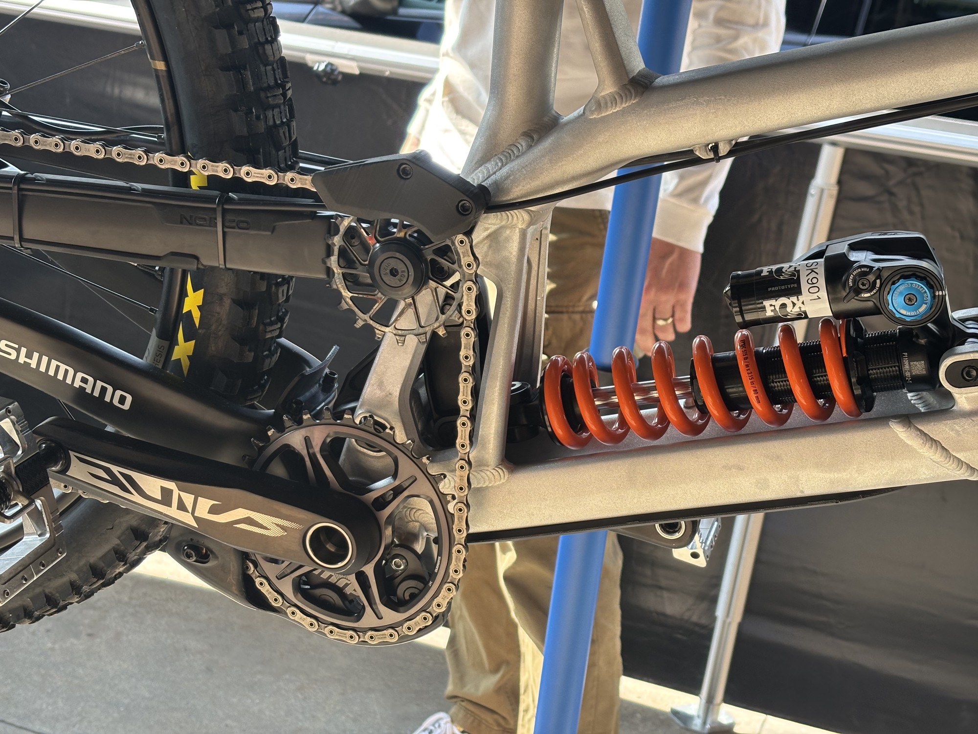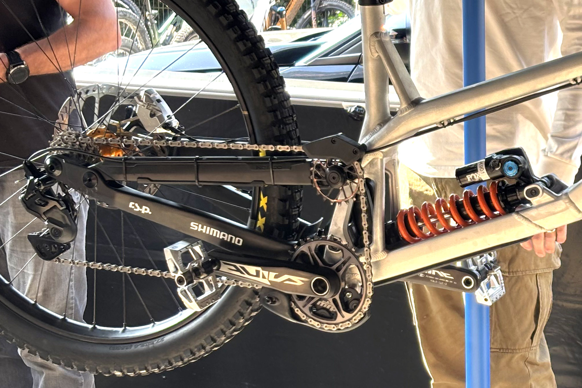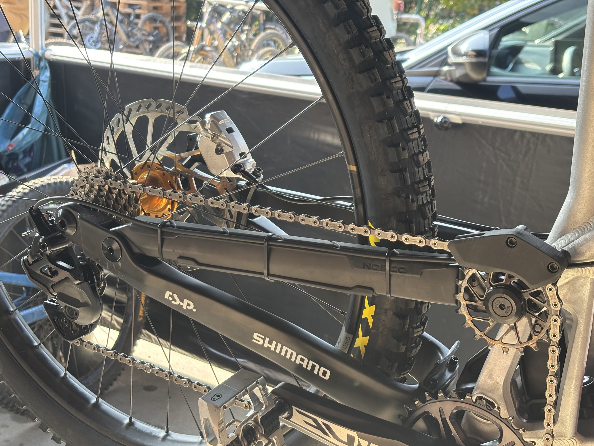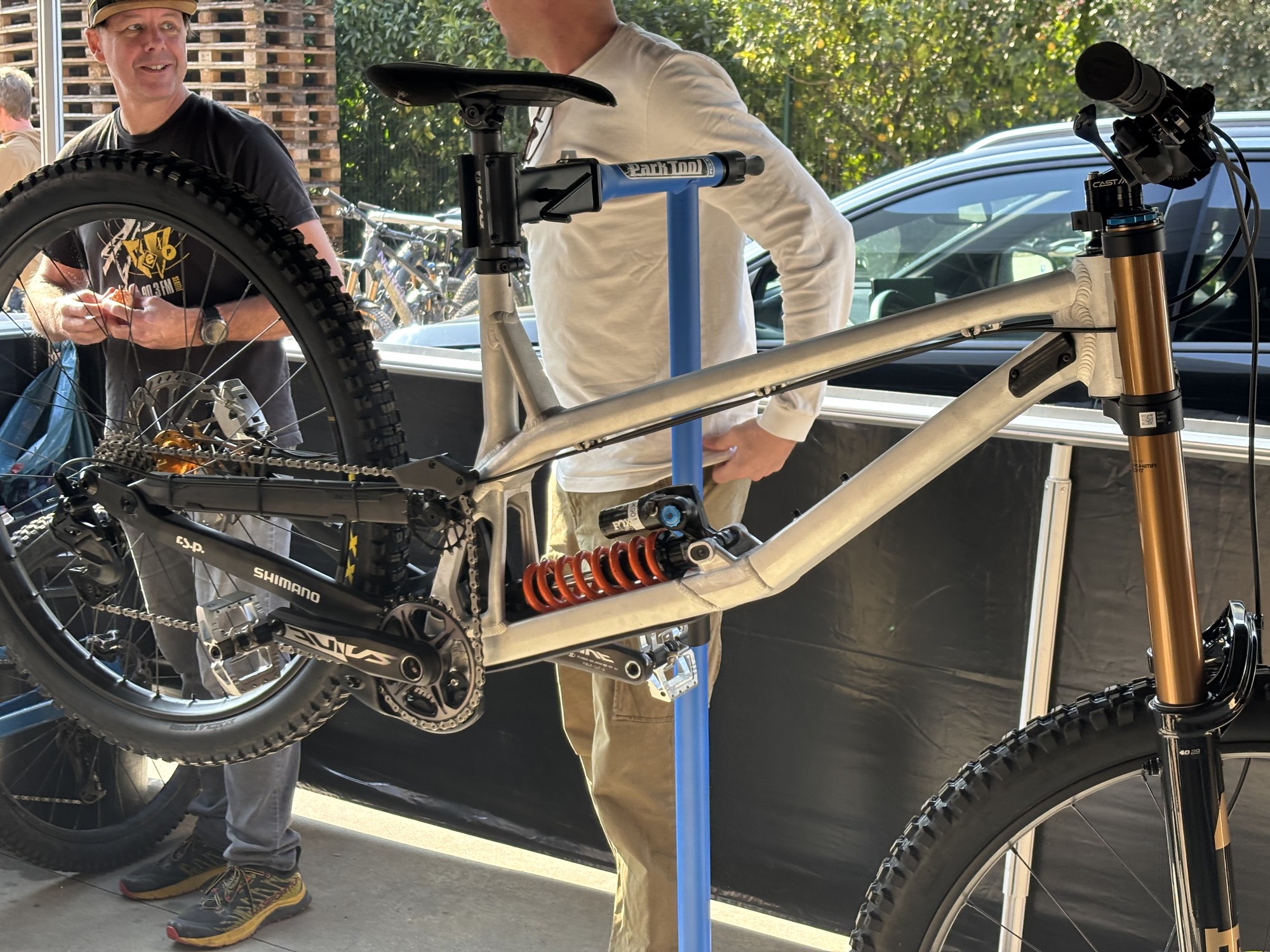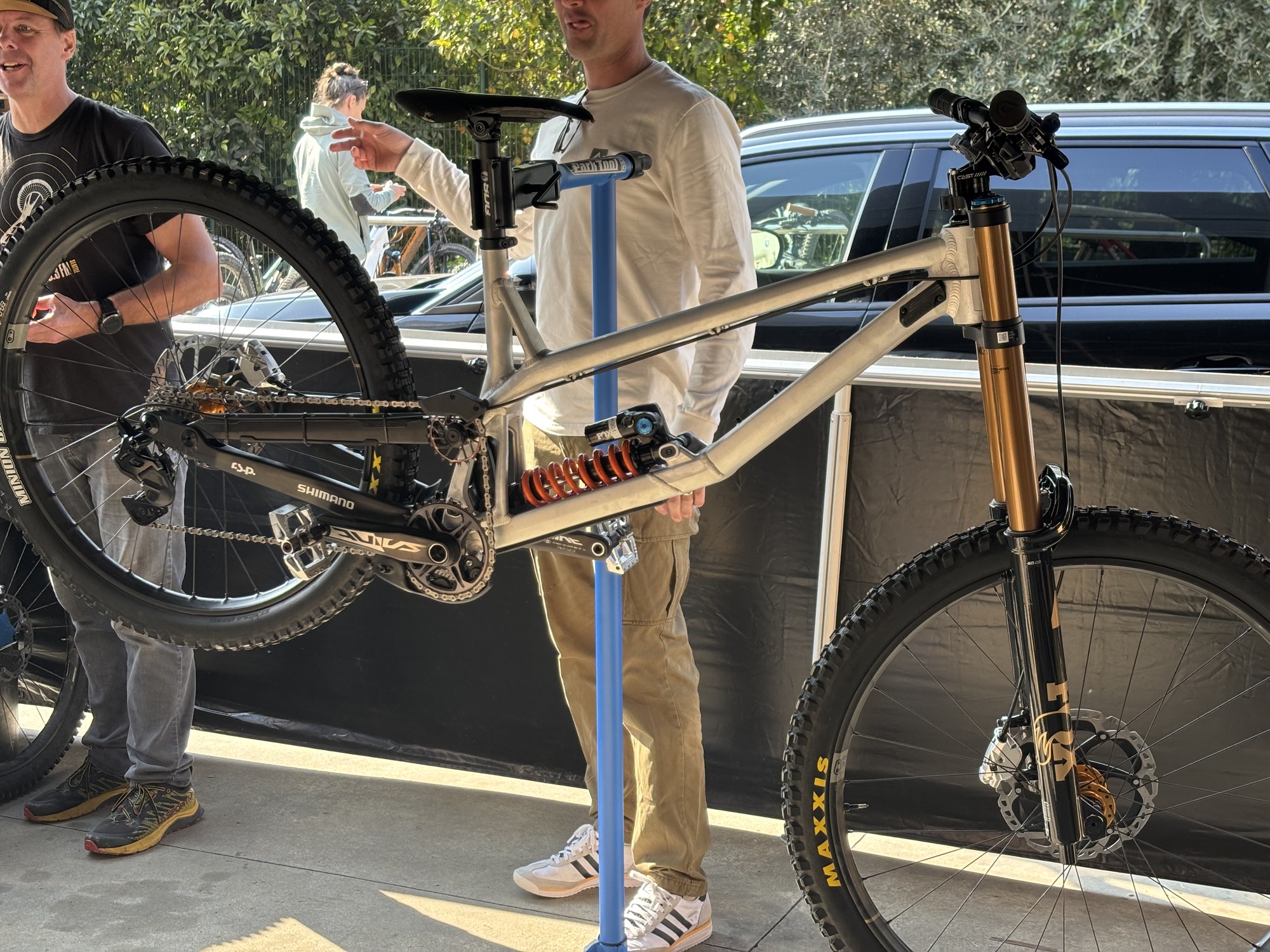 Перья всё ещё прежние, карбоновые. Со слов Грега — такое исполнение перьев помогает не только значительно облегчить велосипед, но и добавить раме жесткости на скручивание. Грег считает, с карбоновыми перьями байк заметно легче в управлении и лучше держится на рельефе. Компоновка байка — маллет, 29" колесо спереди и 27.5" сзади.