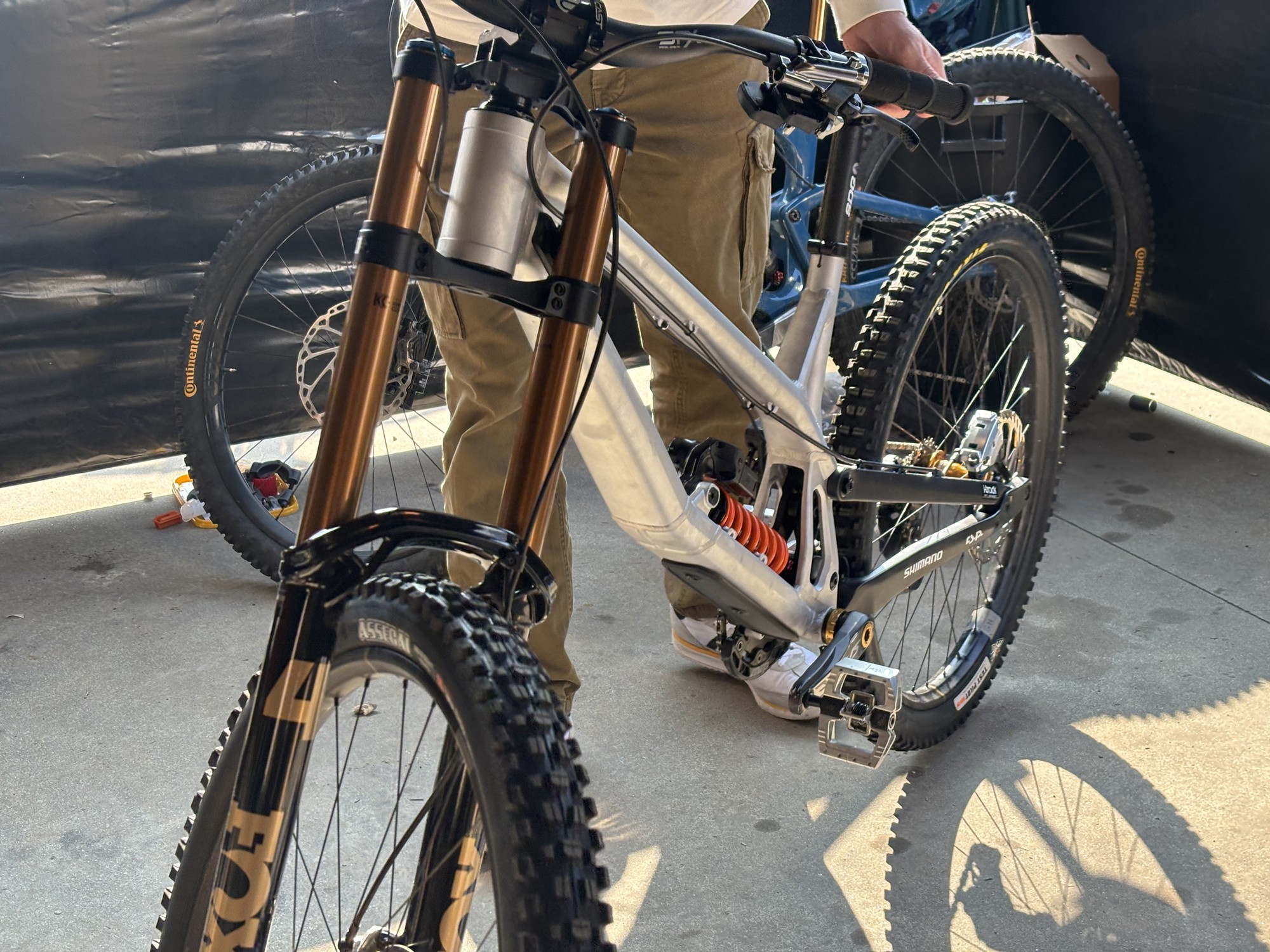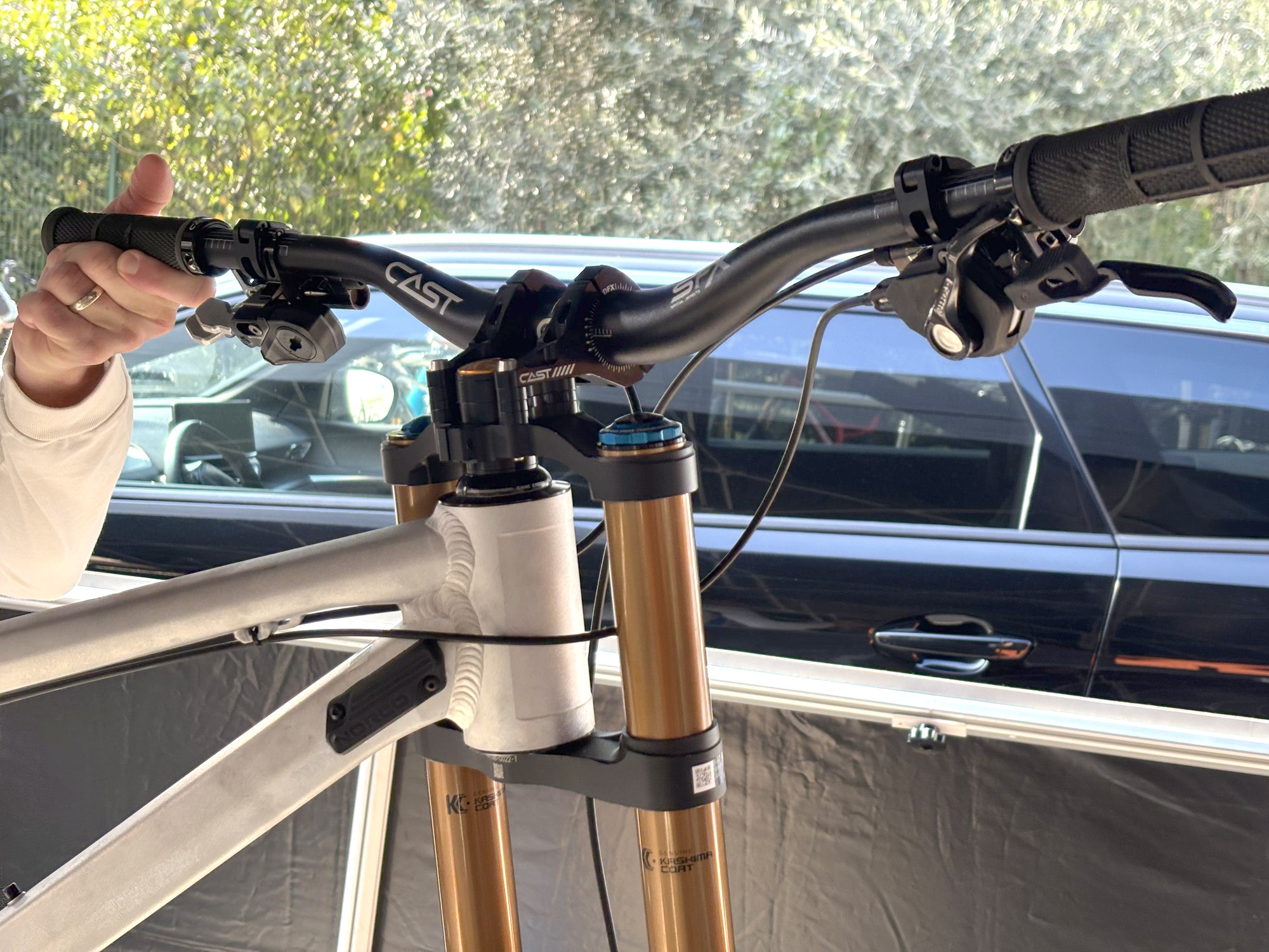 Жирный 1.5" стакан позволяет играться с ричем и углом рулевой. Слева на руле можно заметить пульт для управления электроникой амортизатора Live Valve Neo. По словам Грега — манетка позволяет отключить автоматический режим работы амортизатора и менять режимы работы. Справа — какая-то новая манетка.