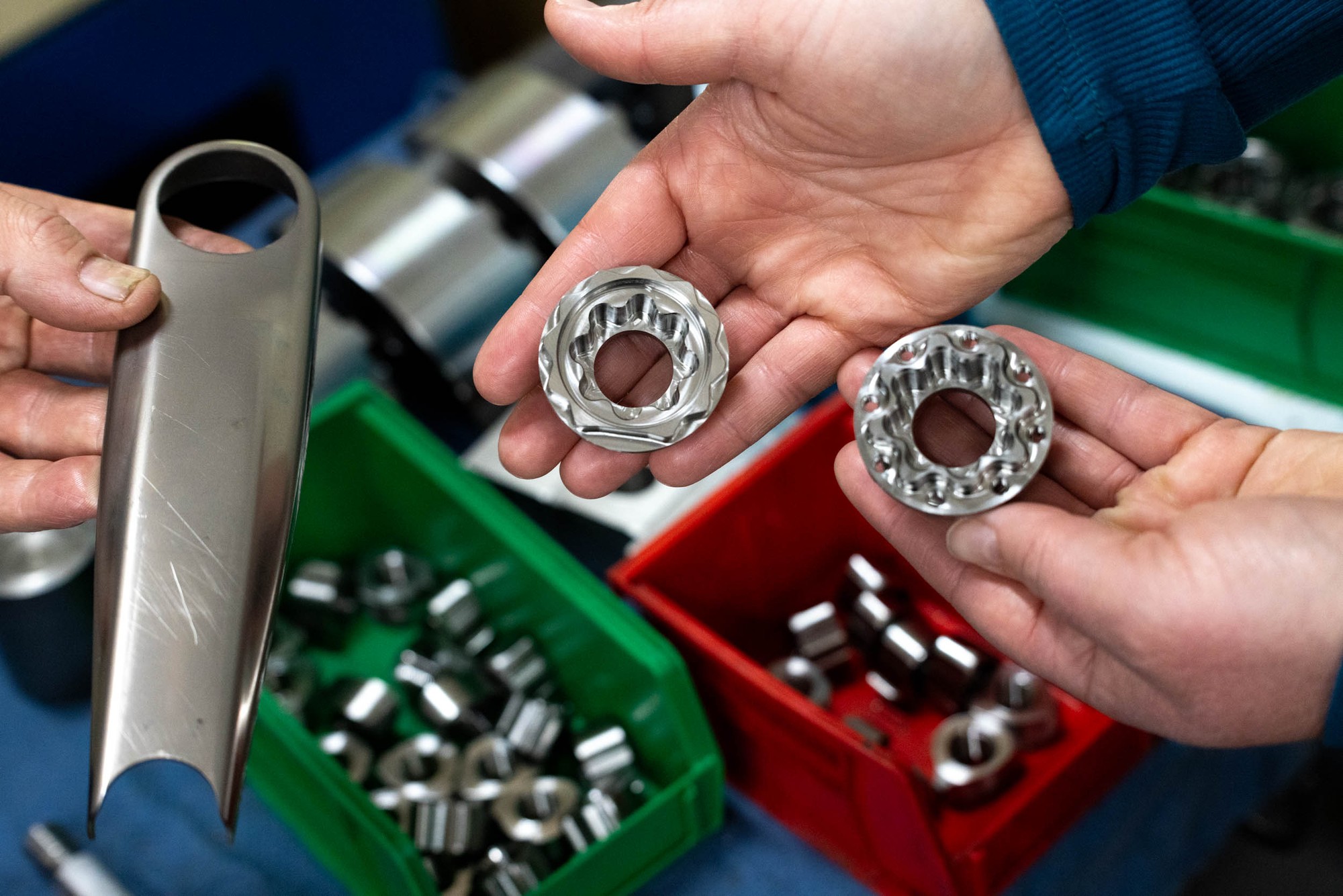 В Висконсине White Industries разработали саму архитектуру шатунов, как их интегрировать в трансмиссию, как закрепить звезду. Алюминиевую ось и самовыжимные болты под 10мм шестигранник взяли от фрезерованных алюминиевых шатунов White Industries. Резьбовая вставка педали, вставка для крепления к оси и алюминиевая втулка прелоада — всё спроектировано и изготовлено на заводе компании в Петалуме, Калифорния. Две половинки, составляющие основное тело шатунов, штампуются в Brunk Industries. Потом всё это собирается вместе и сваривается на мощностях Moots в Колорадо.