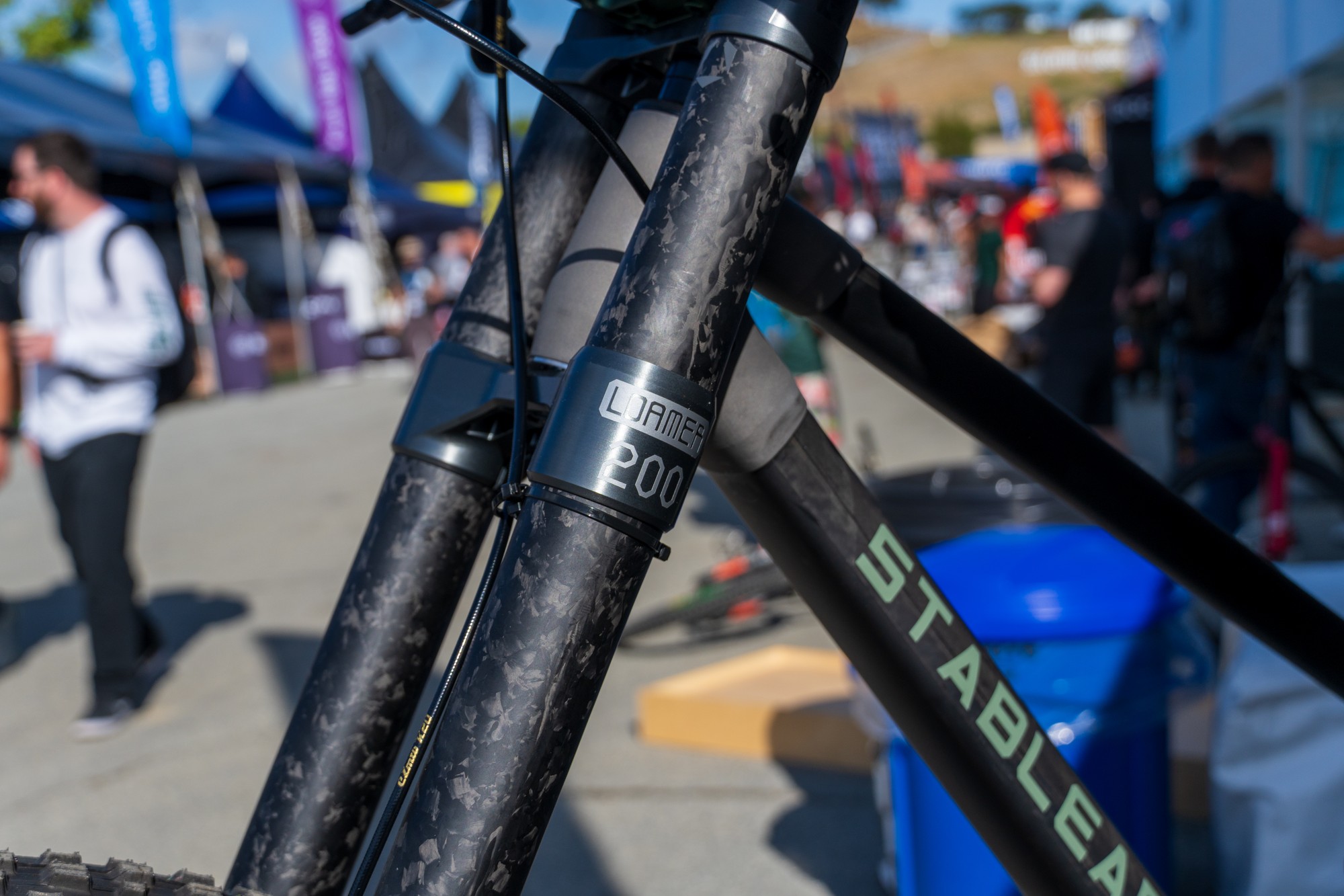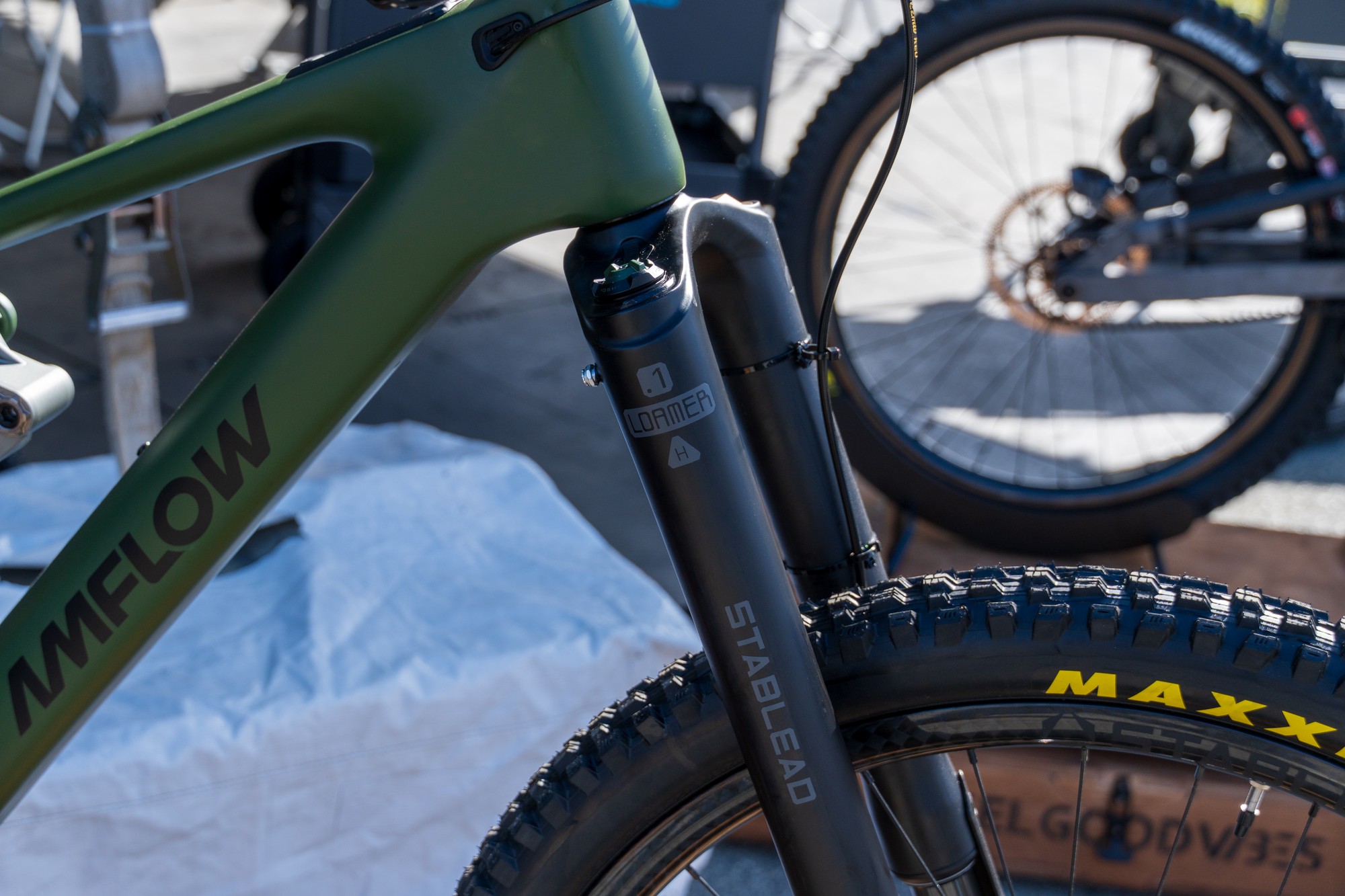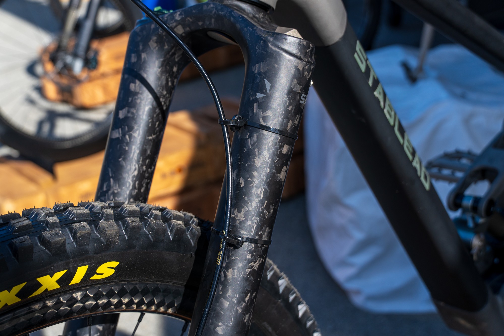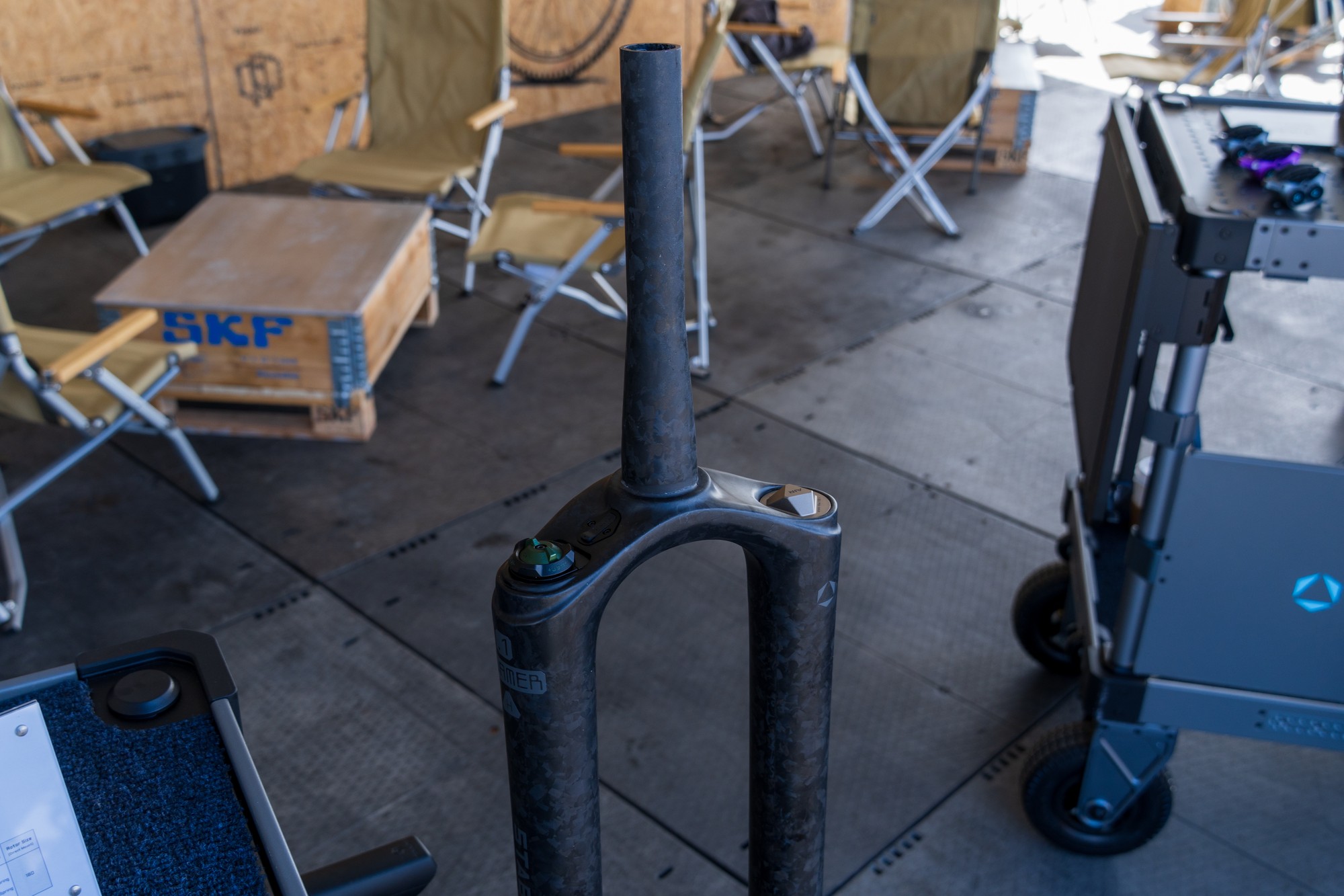Прошлогодняя однокоронка-перевёртыш SFS-3601 получила название — Loamer. Вилку заметно переработали: цельный карбоновый узел корона-штаны-шток теперь без алюминиевых насадок на концах. В правой ноге можно заметить более сложный демпфер с парой крутилок. У короны есть клапан для стравливания давления из штанов.